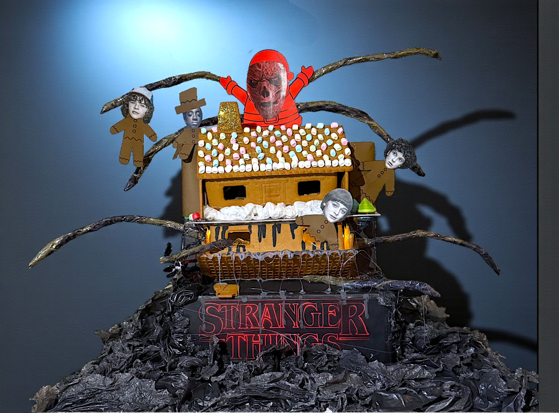 My creative friend made this eye-catching Stranger Things themed gingerbread house. Very fun and well done.