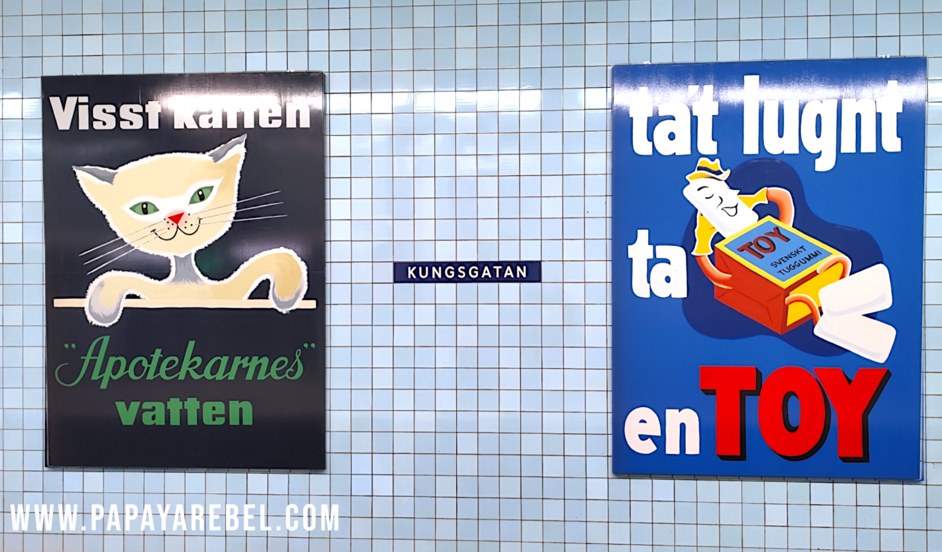 The right poster advertises Toy Swedish chewing gum with the text "Ta det lungt ta en TOY" (take it easy, take a TOY") These posters have been on Stockholm's local transport during the mid-20th century.