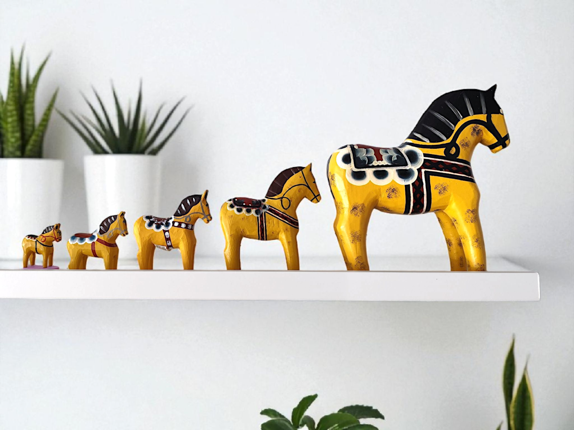 Five original Dala horses from Leksand. Handmade in Sweden in the early 1900s. Made of wood with detailed painted patterns. They are part of my private collection.