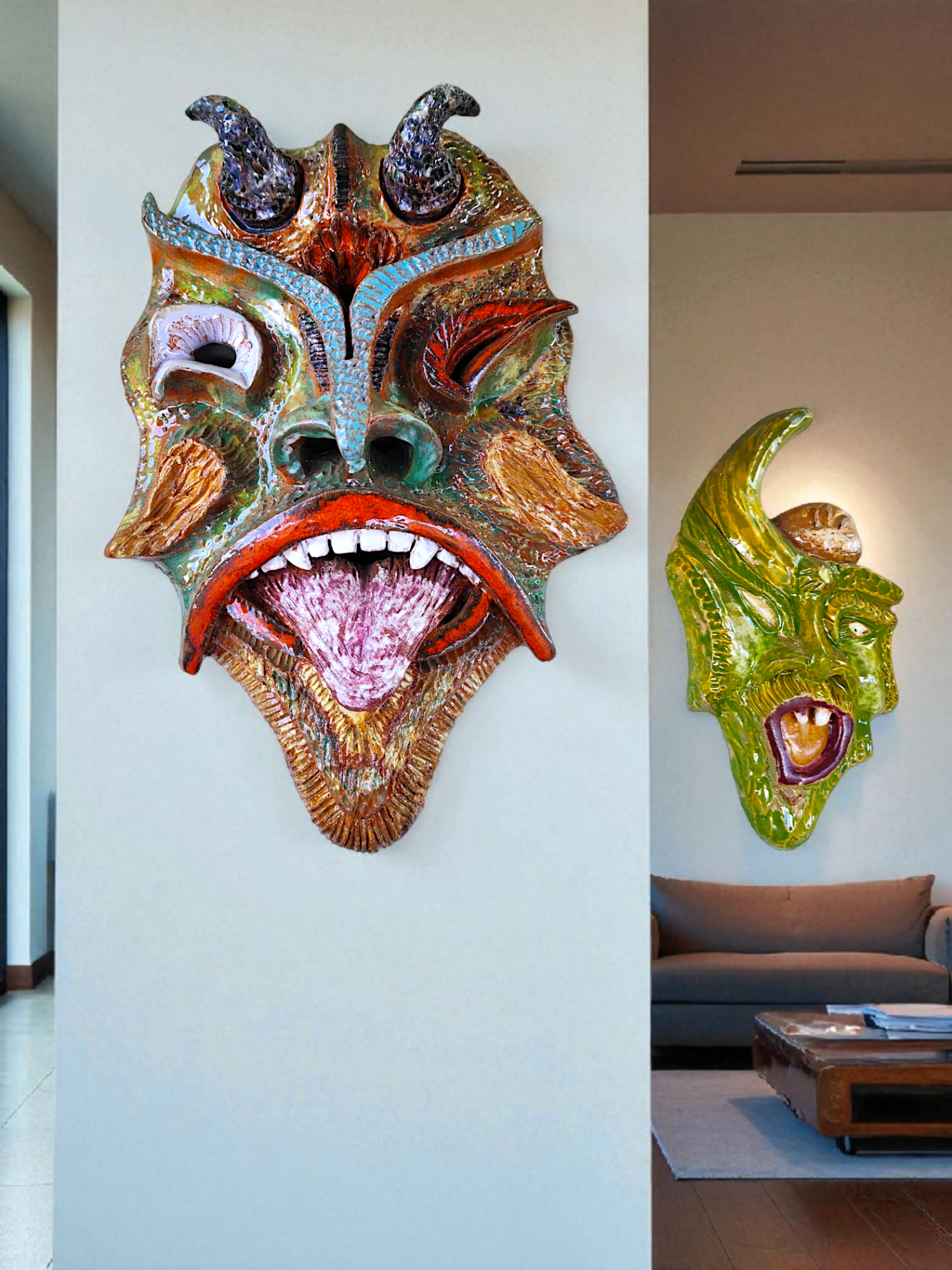 Two masks depicting horned figures. Made of ceramic or ceramic-like material by an unknown artist.