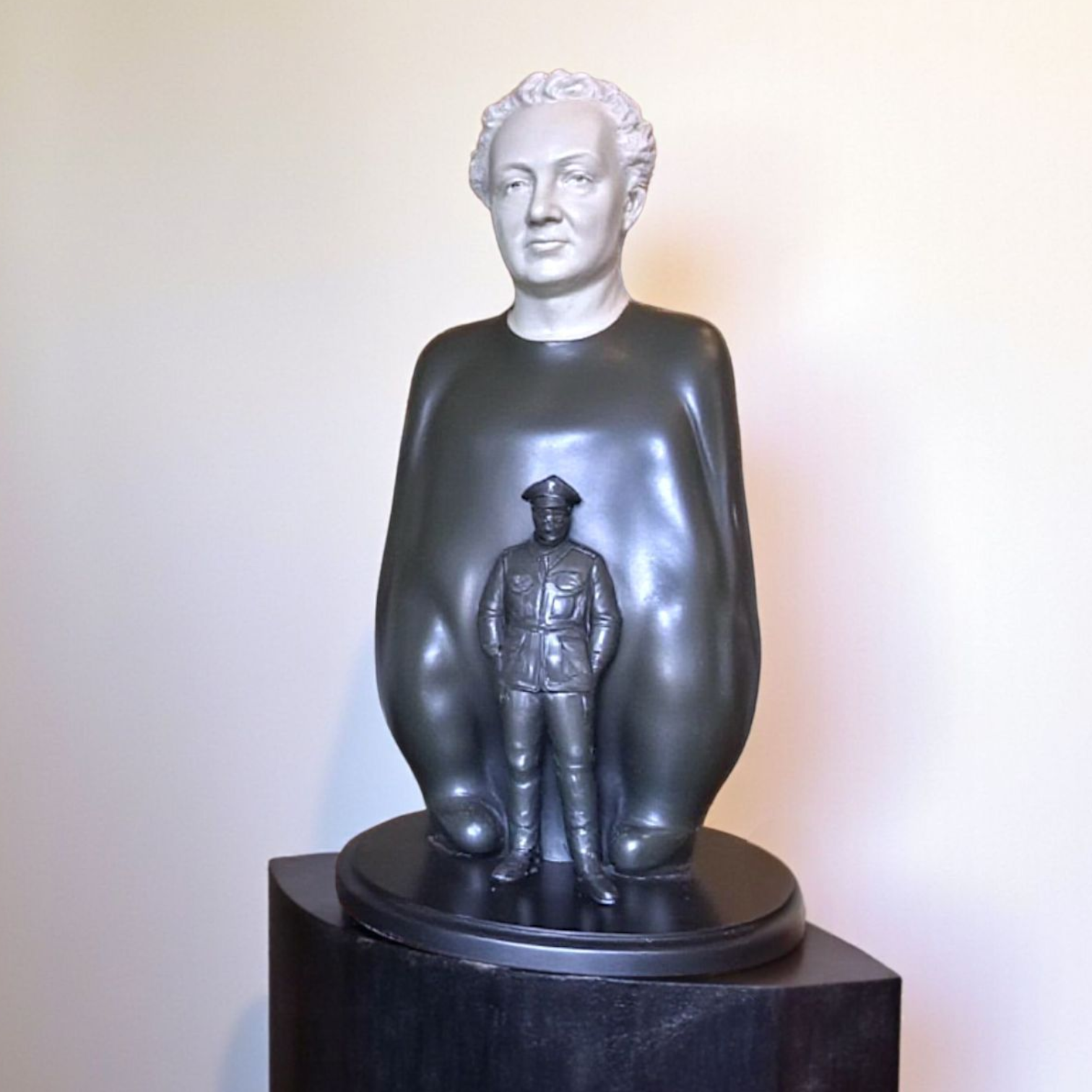 The sculpture depicts a bust of probably the British monarch George III, inside which there is a smaller figure of a military officer. Made of some kind of metal