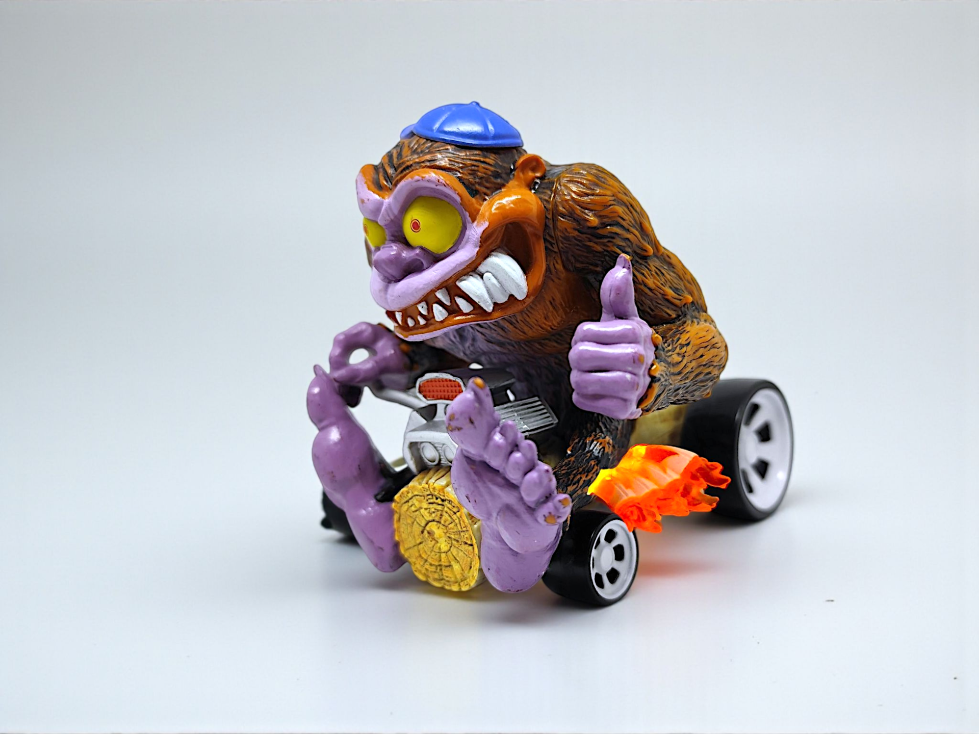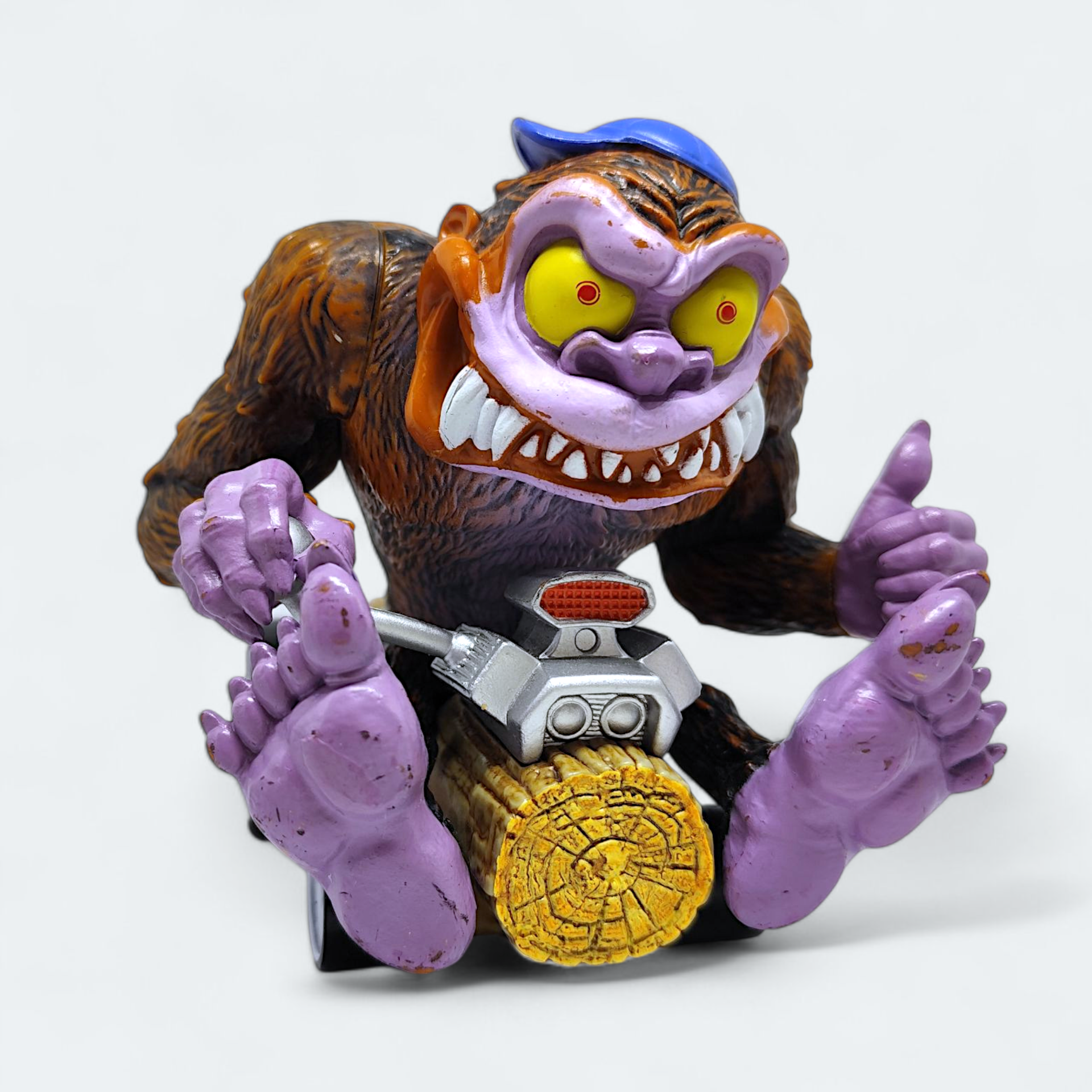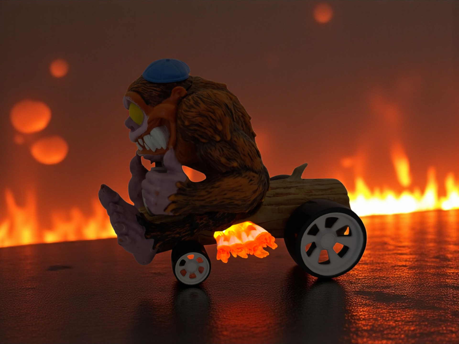 Monster 500 Lunatic Legends LEAD FOOT Ape from 2013. The fun monster figure depicts a crazy gorilla driving a log truck with flames. Perfect for collectors of odd toys and figures.