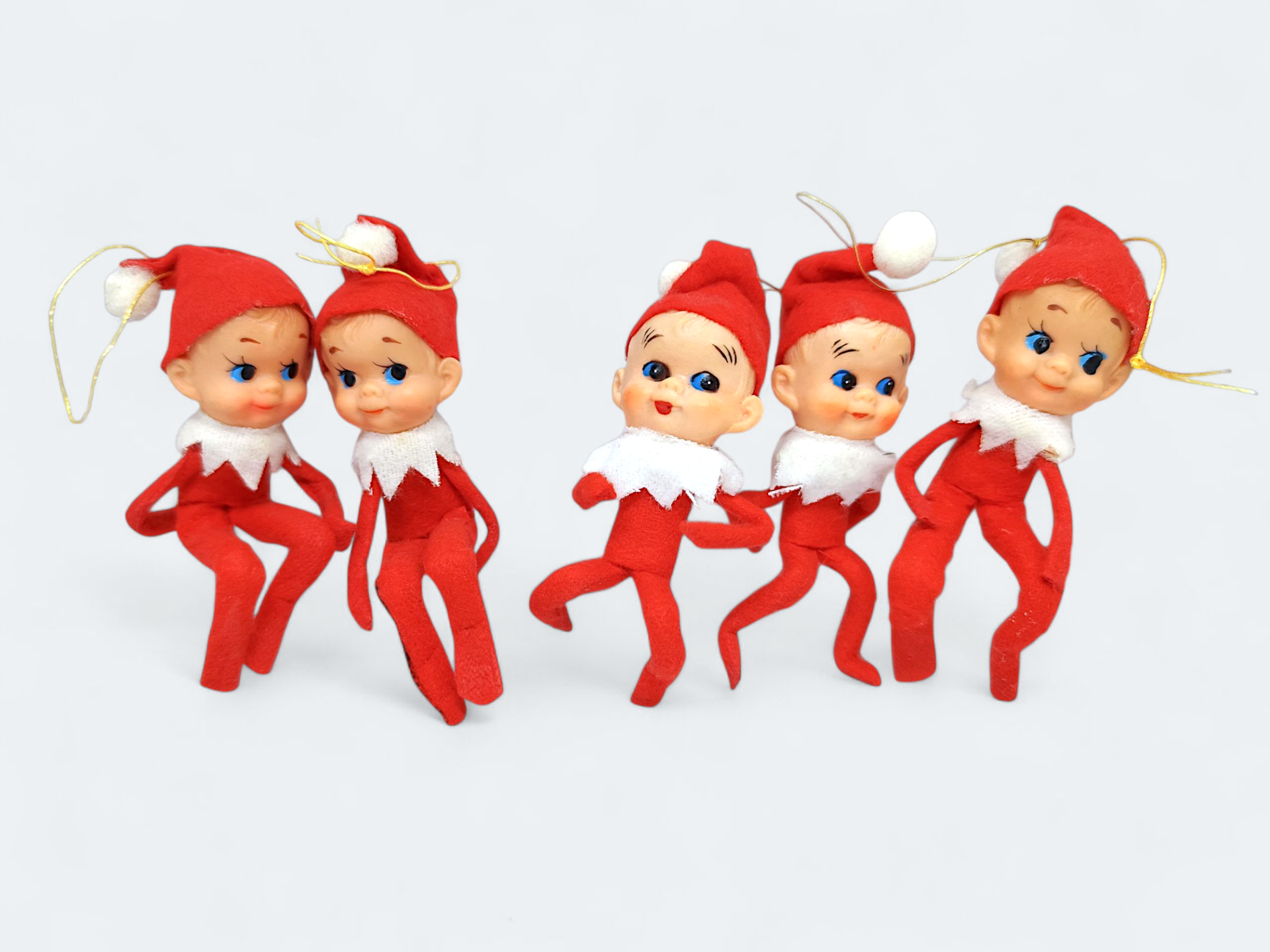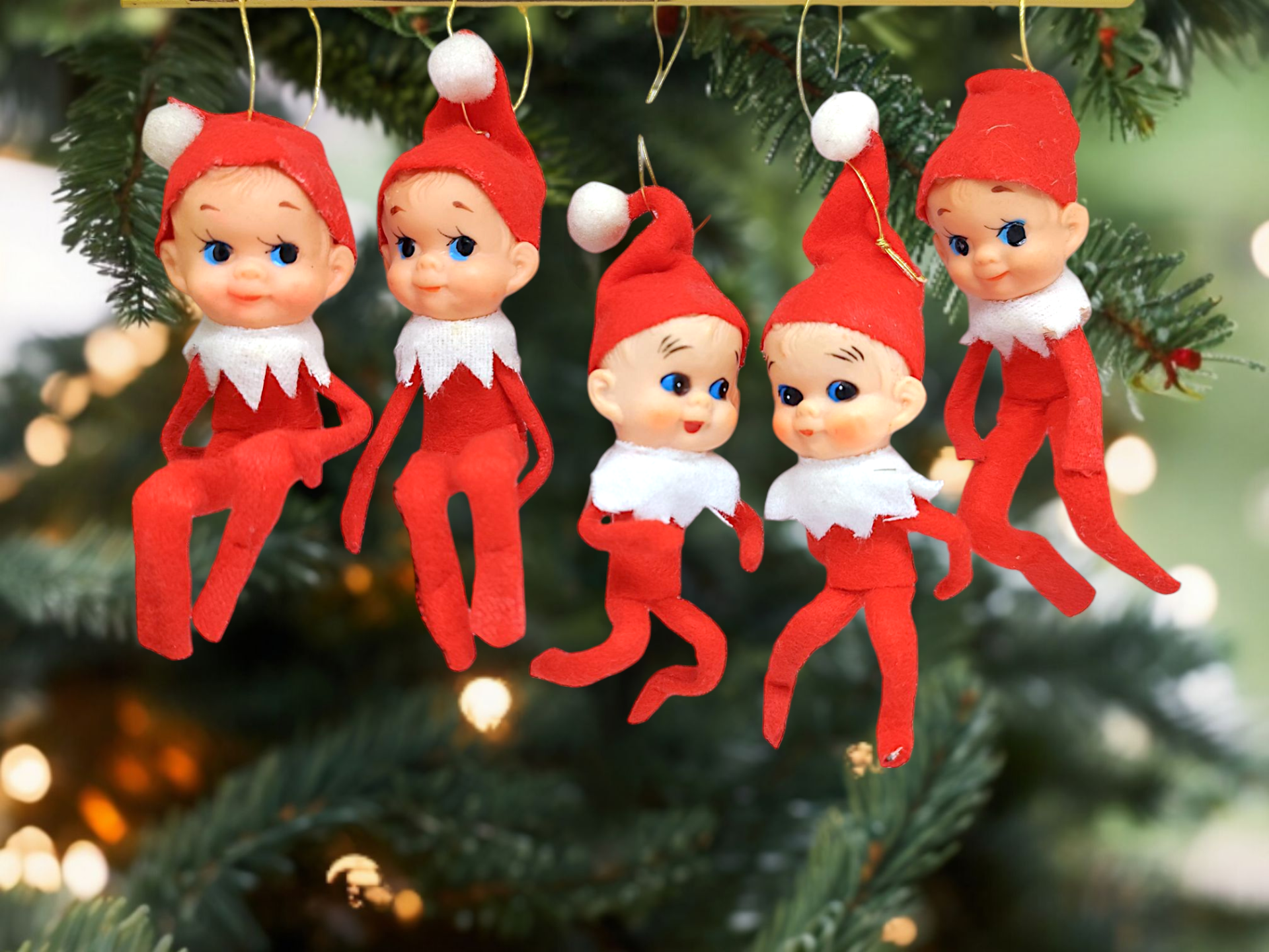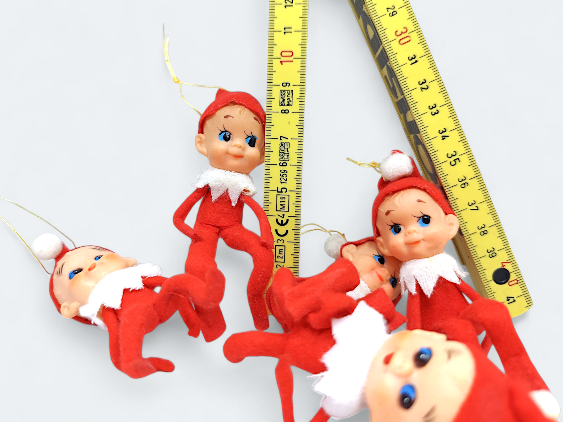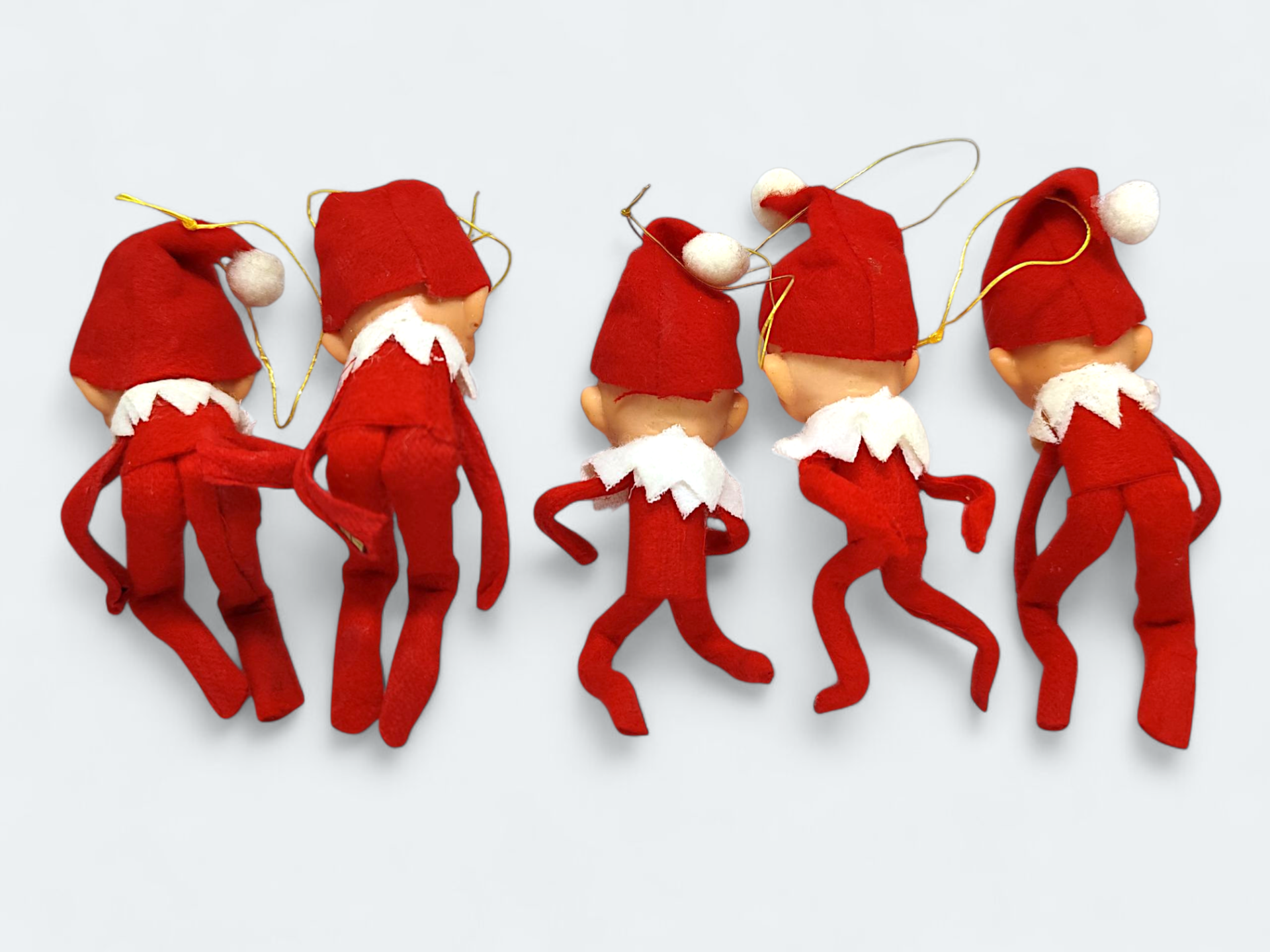 5 vintage Christmas tree ornaments in the shape of little gnomes/santas. Made in the 50s in plastic and fabric. Perfect for creating a nostalgic Christmas atmosphere.