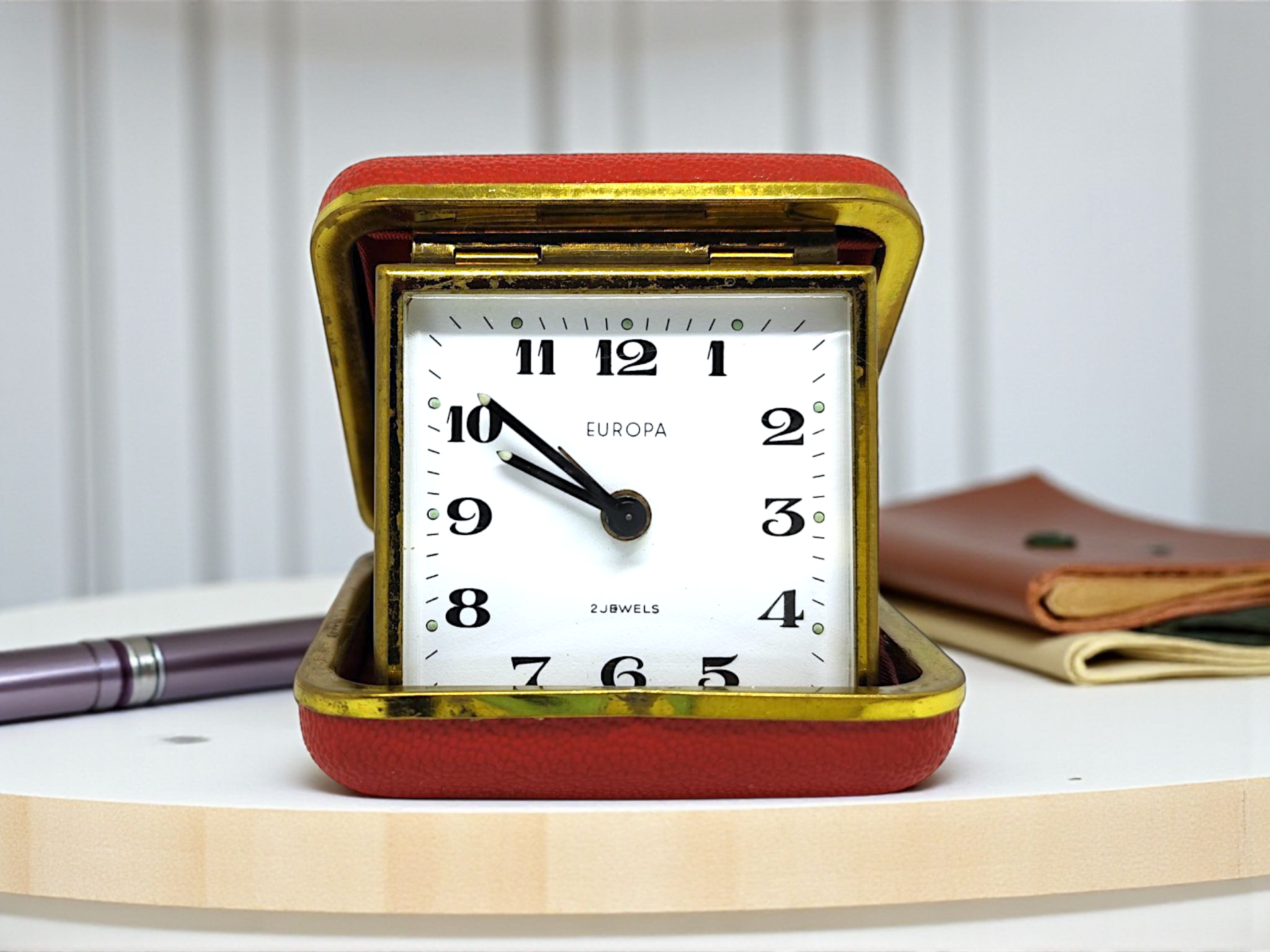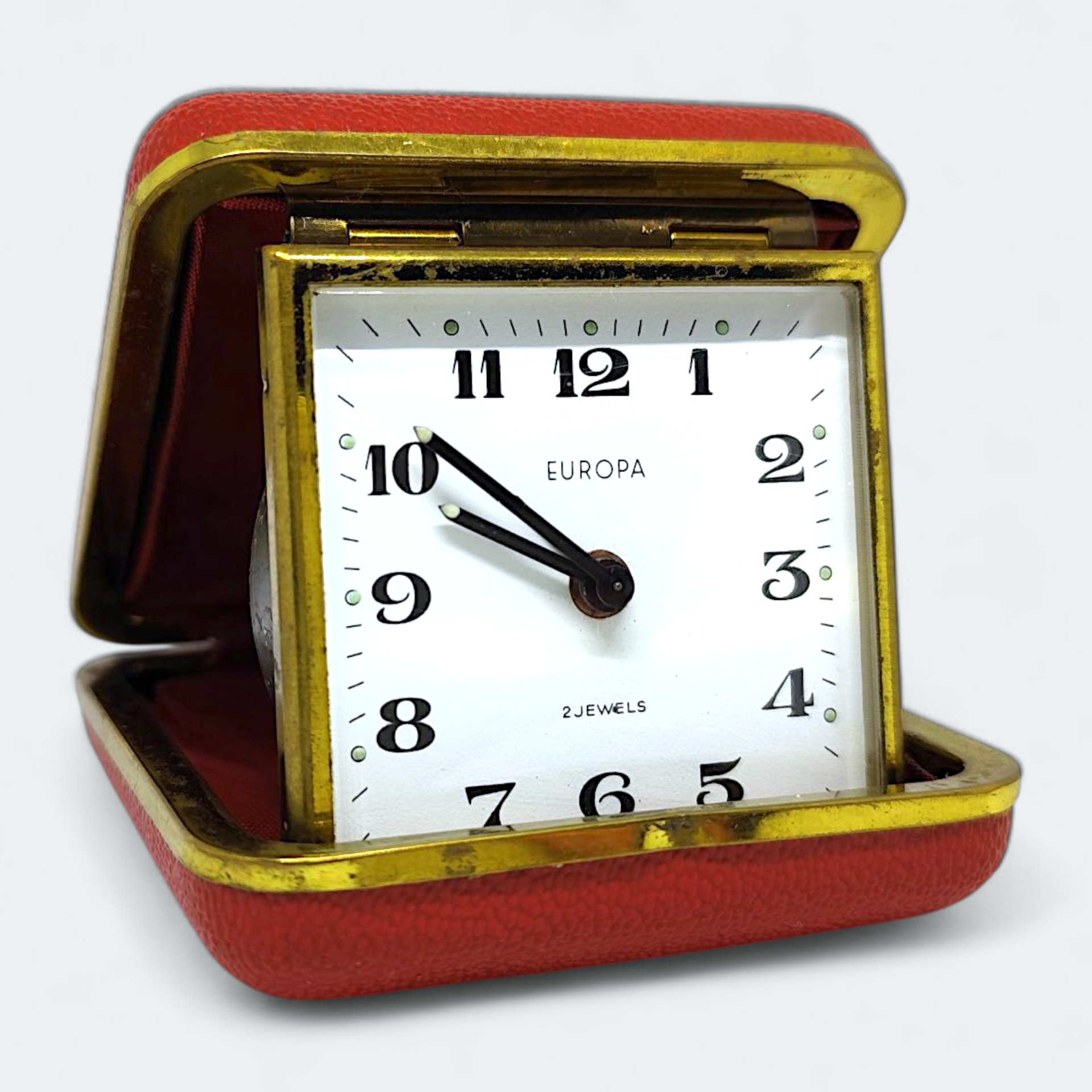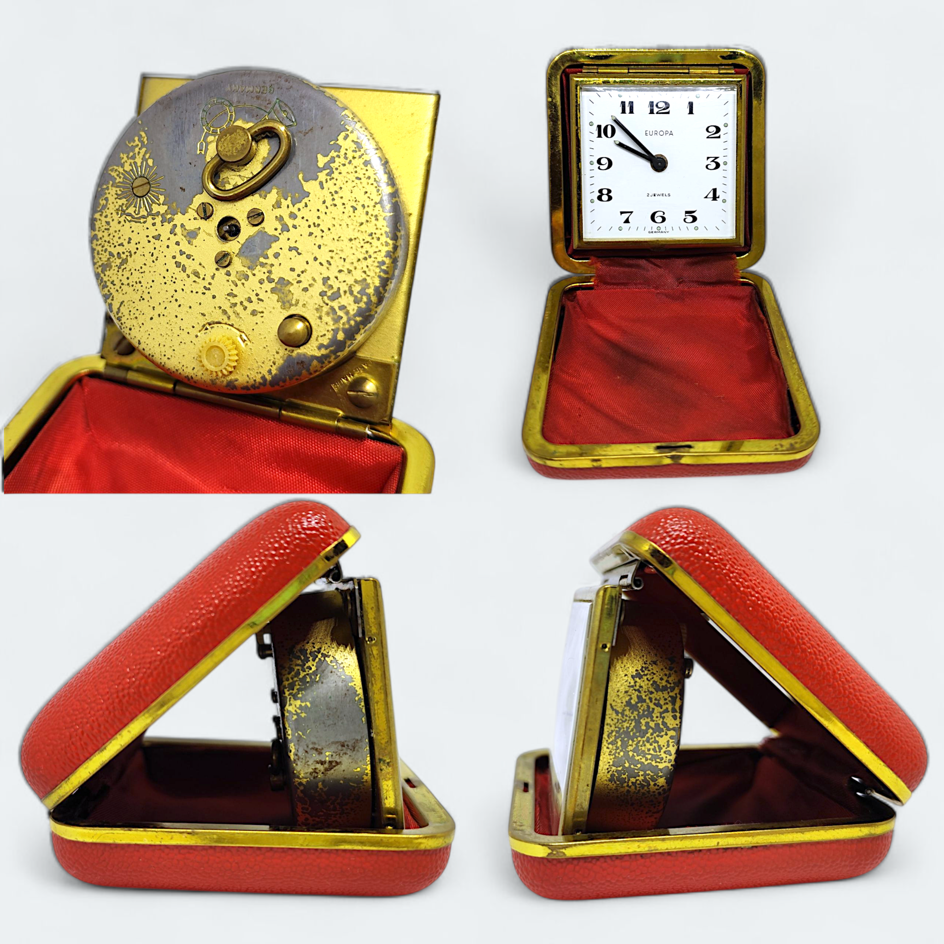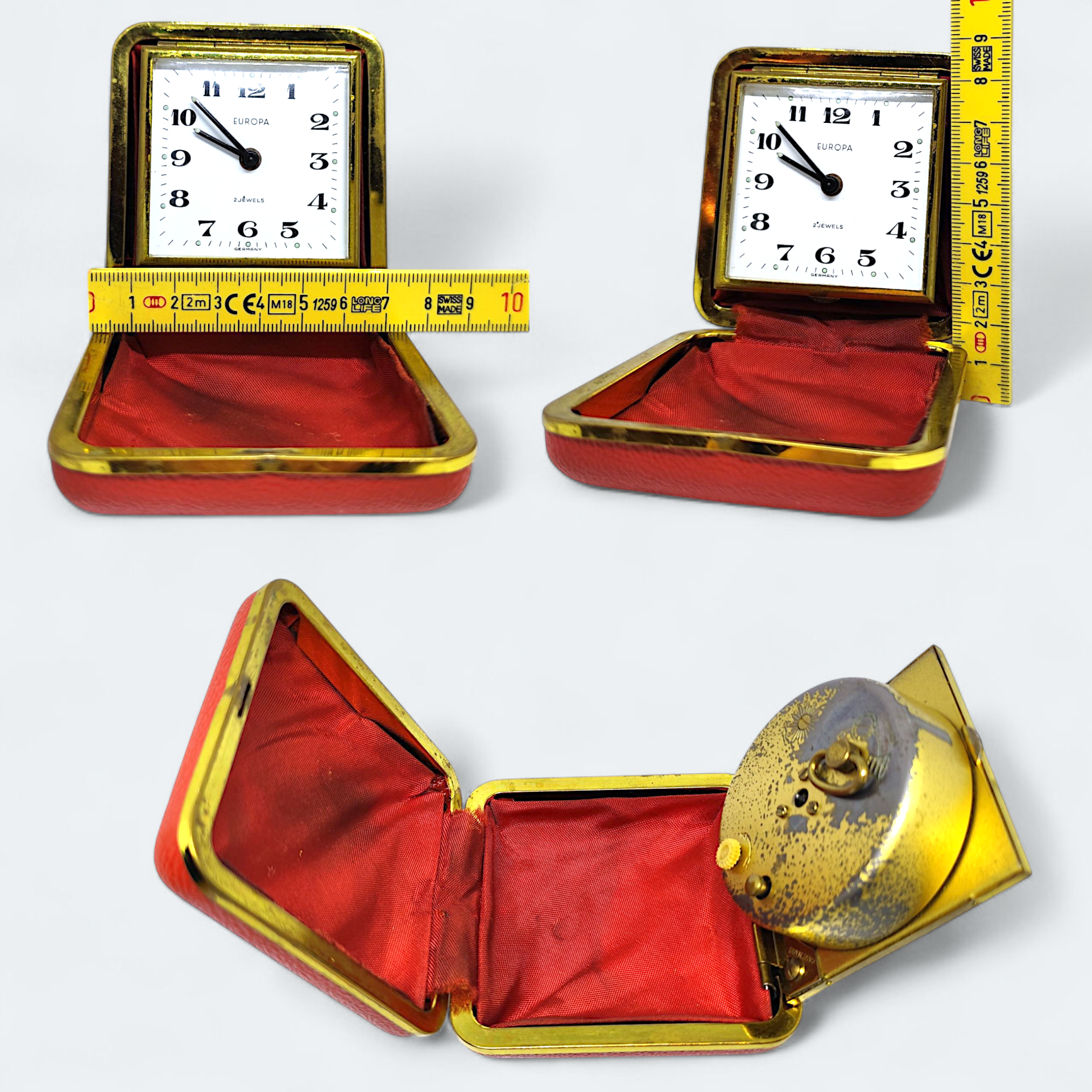 A vintage EUROPA travel clock, travel alarm clock, is an elegant clock that is perfect for collectors and enthusiasts. It has a square shape with a brass frame and a beautiful gold color that adds a touch of retro charm. The clock is windable and has an alarm function, making it an ideal travel companion.