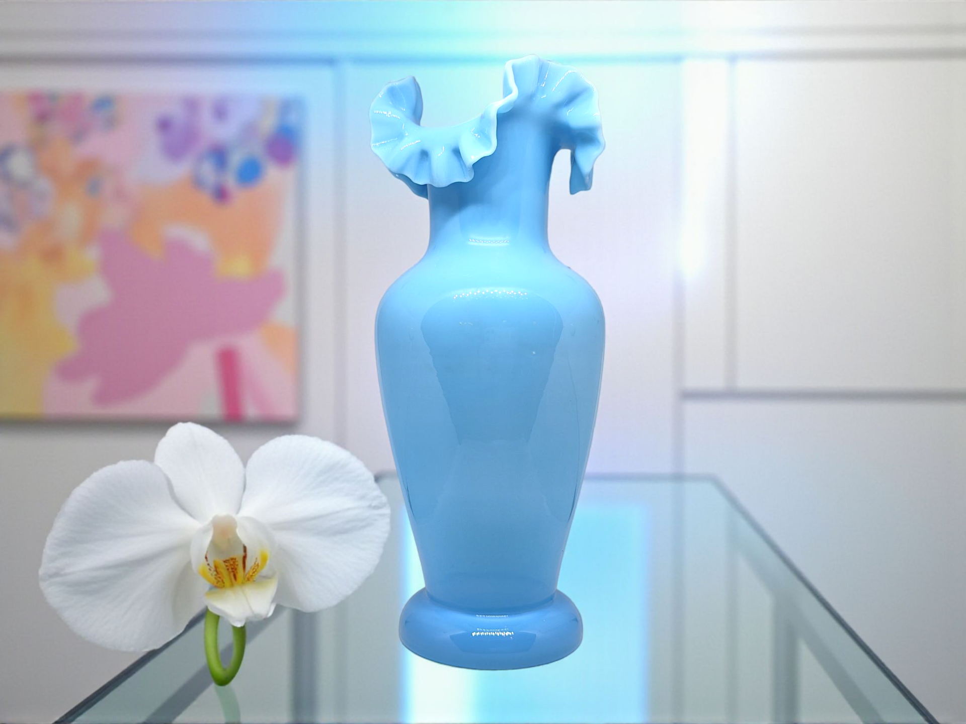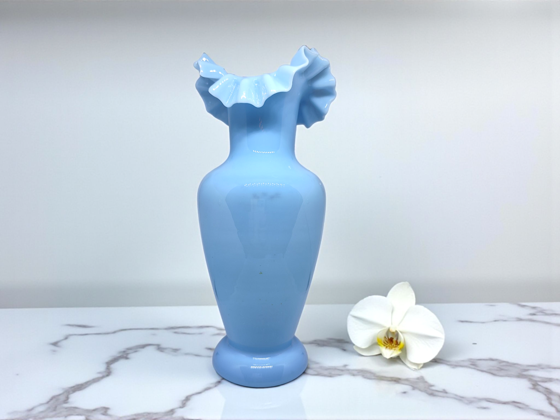 Two antique blue opal glass vases. Opal glass is a type of translucent, colored glass that was often made in France during the 19th century.