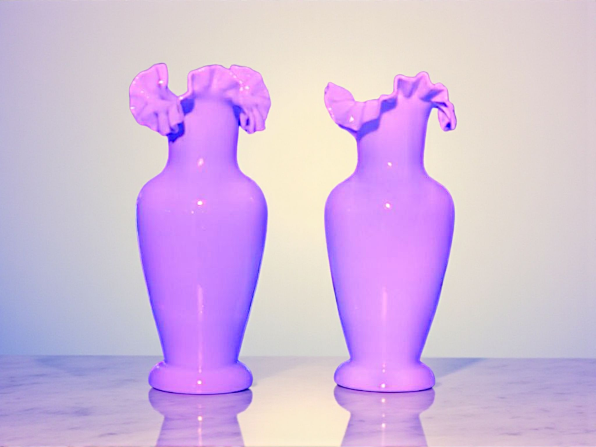 If you shine a UV light on the vases, they have a violet color and in normal light they are light blue.