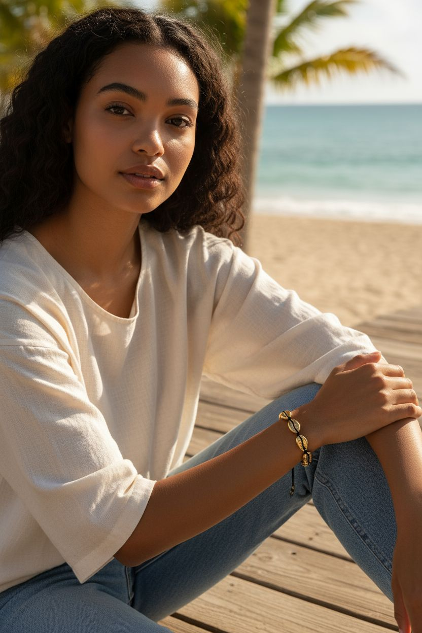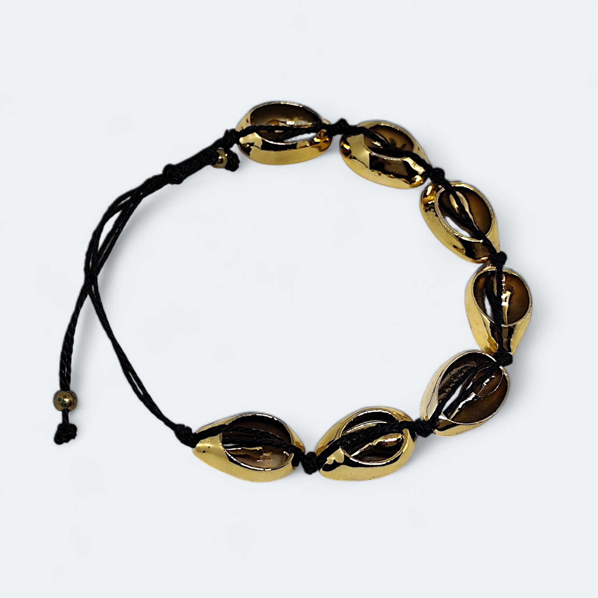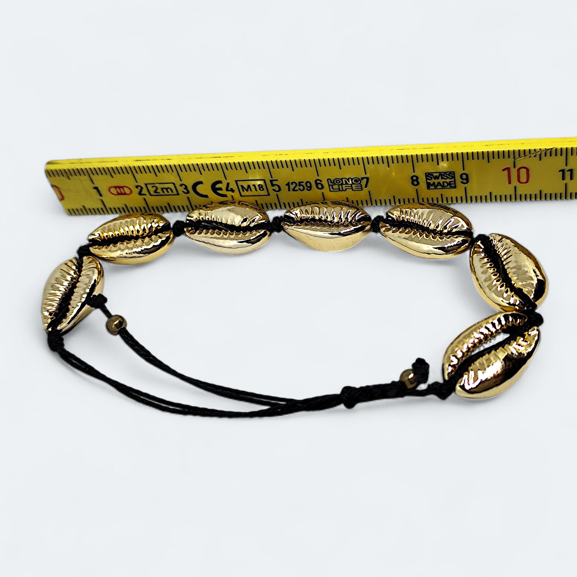 A beautiful adjustable bracelet with gold-colored cowrie shells. Perfect summer bracelet/beach bracelet in bohemian style.