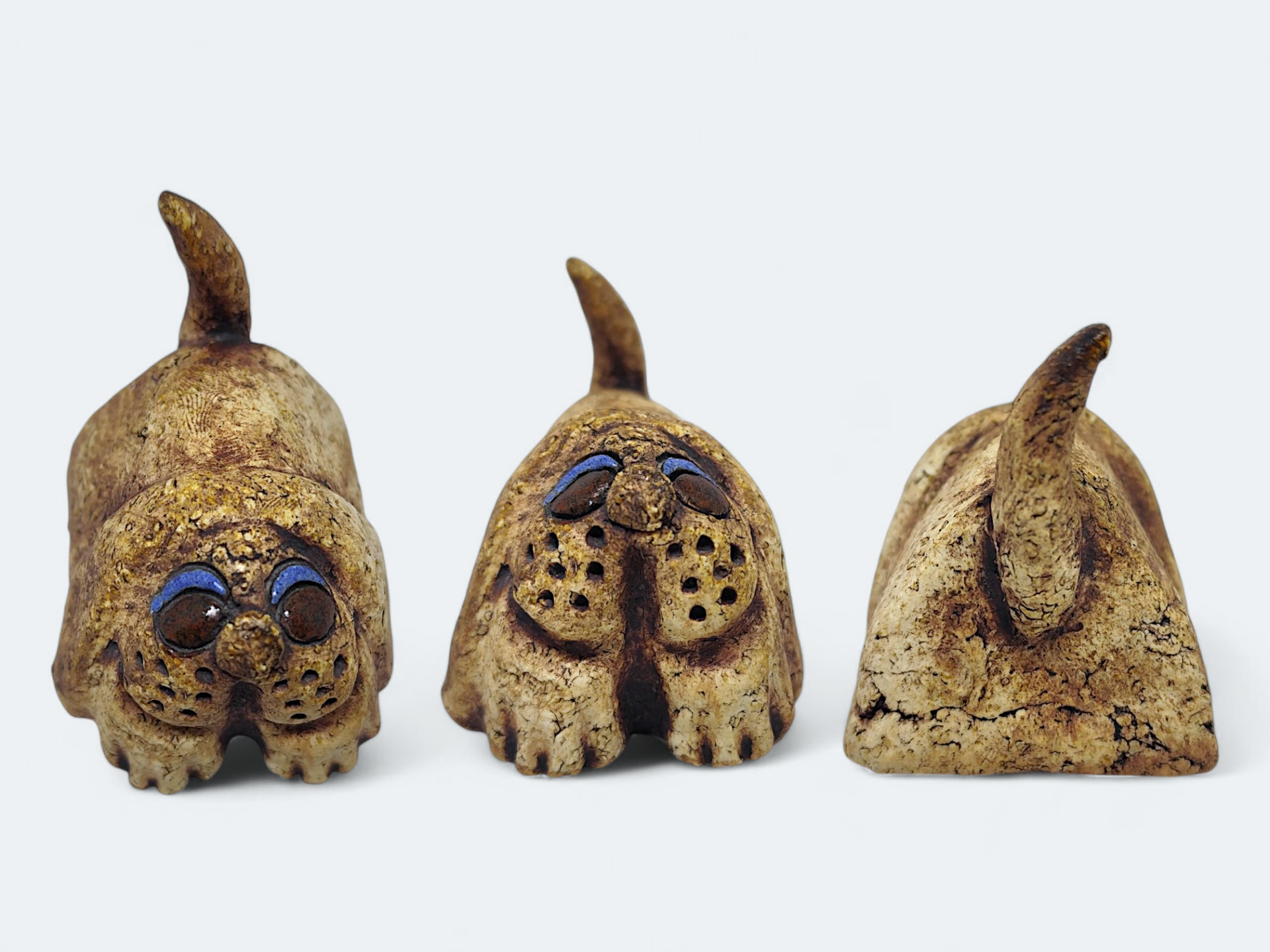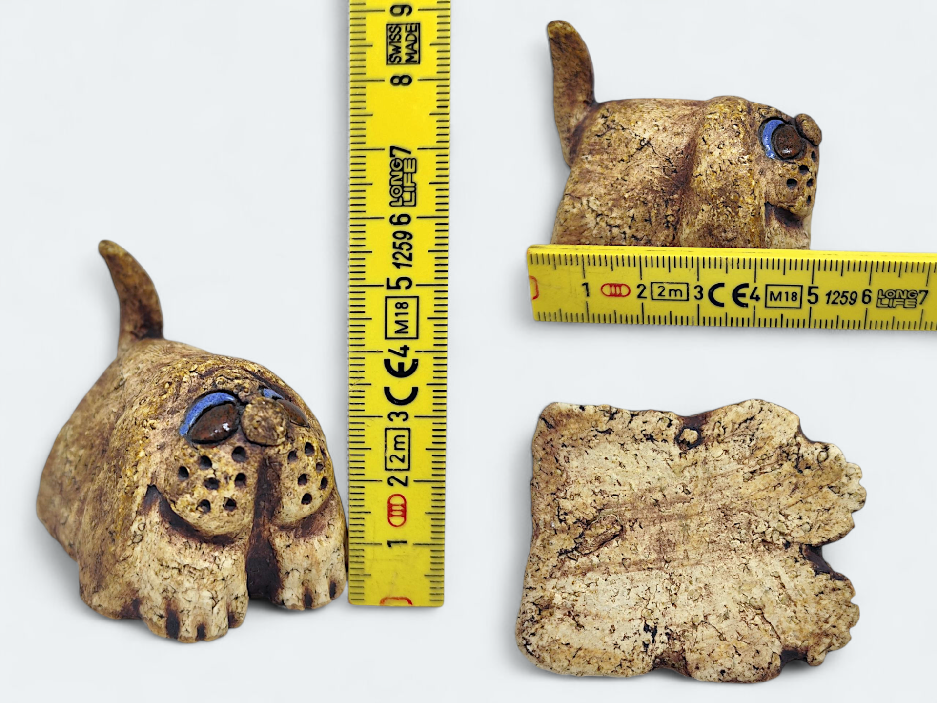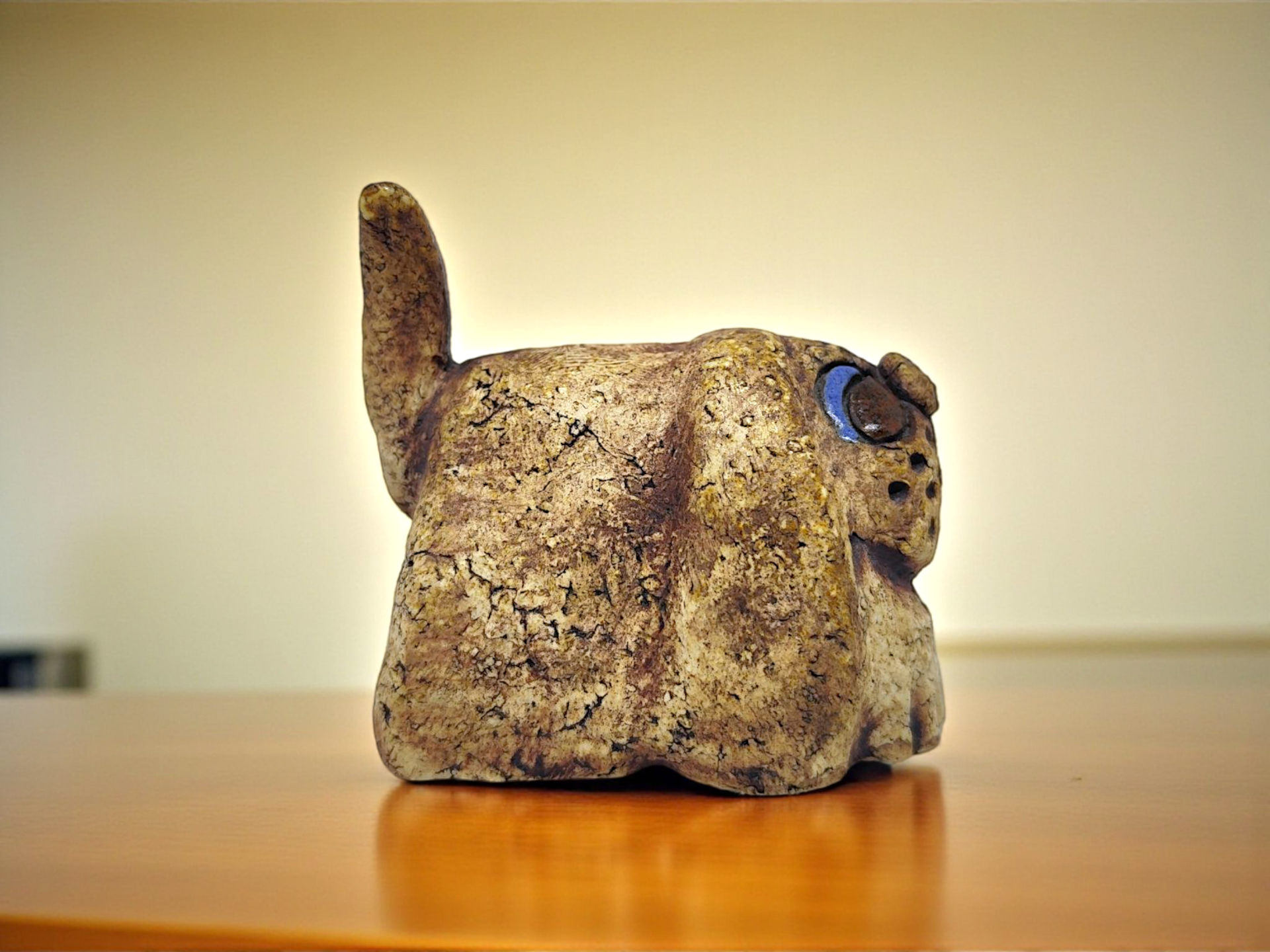 A handmade ceramic figurine of a dog. The figurine has a rough, uneven texture and is painted in shades of brown and beige with blue eyes. Unknown maker and year.