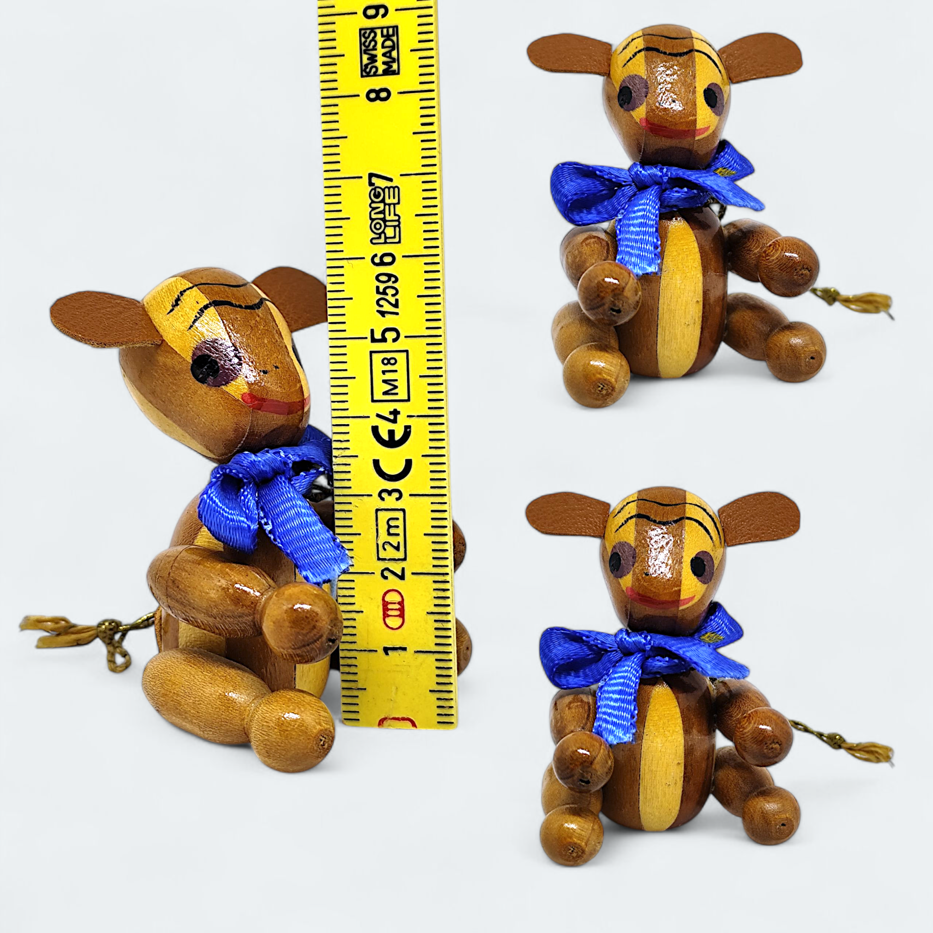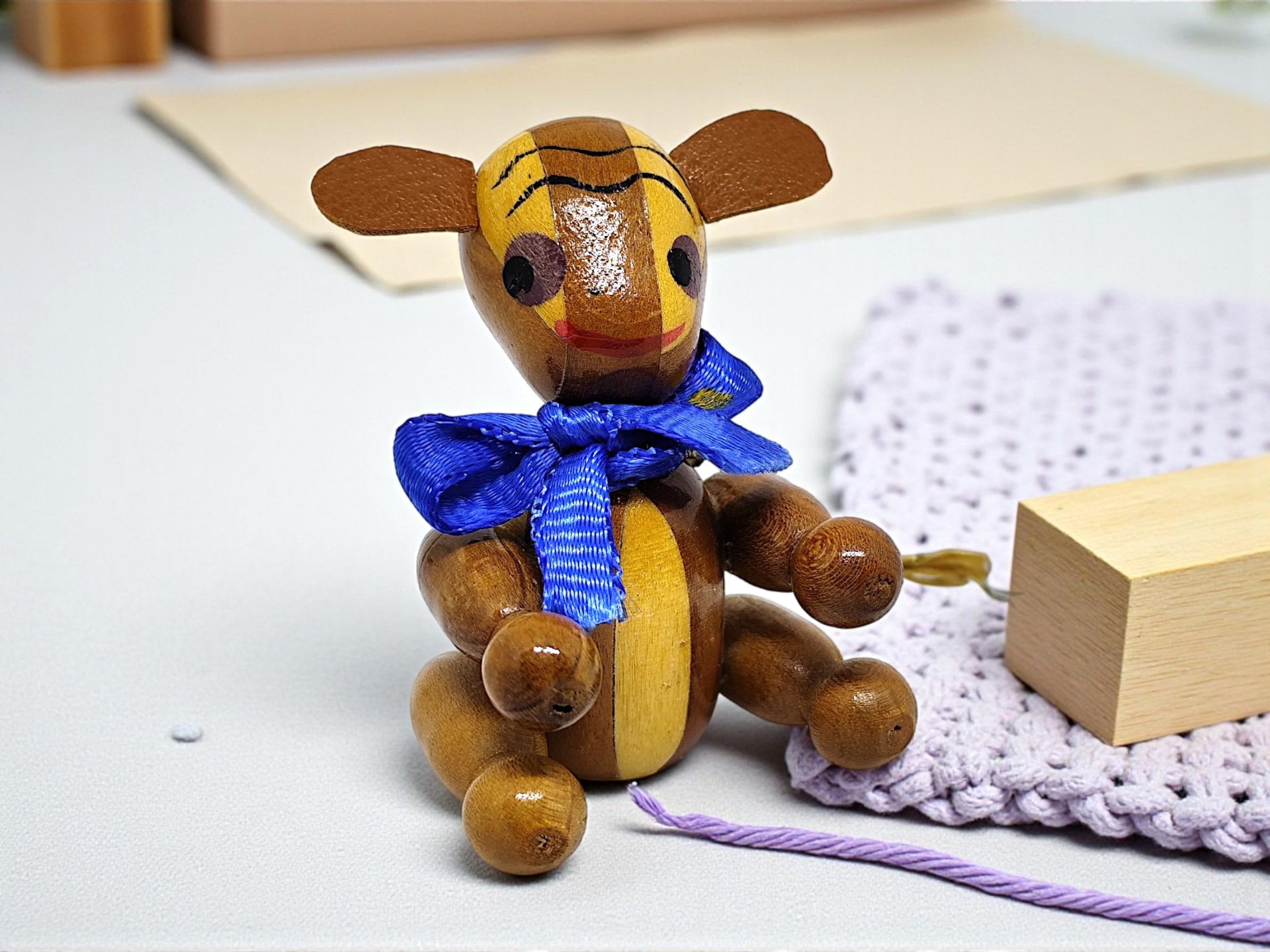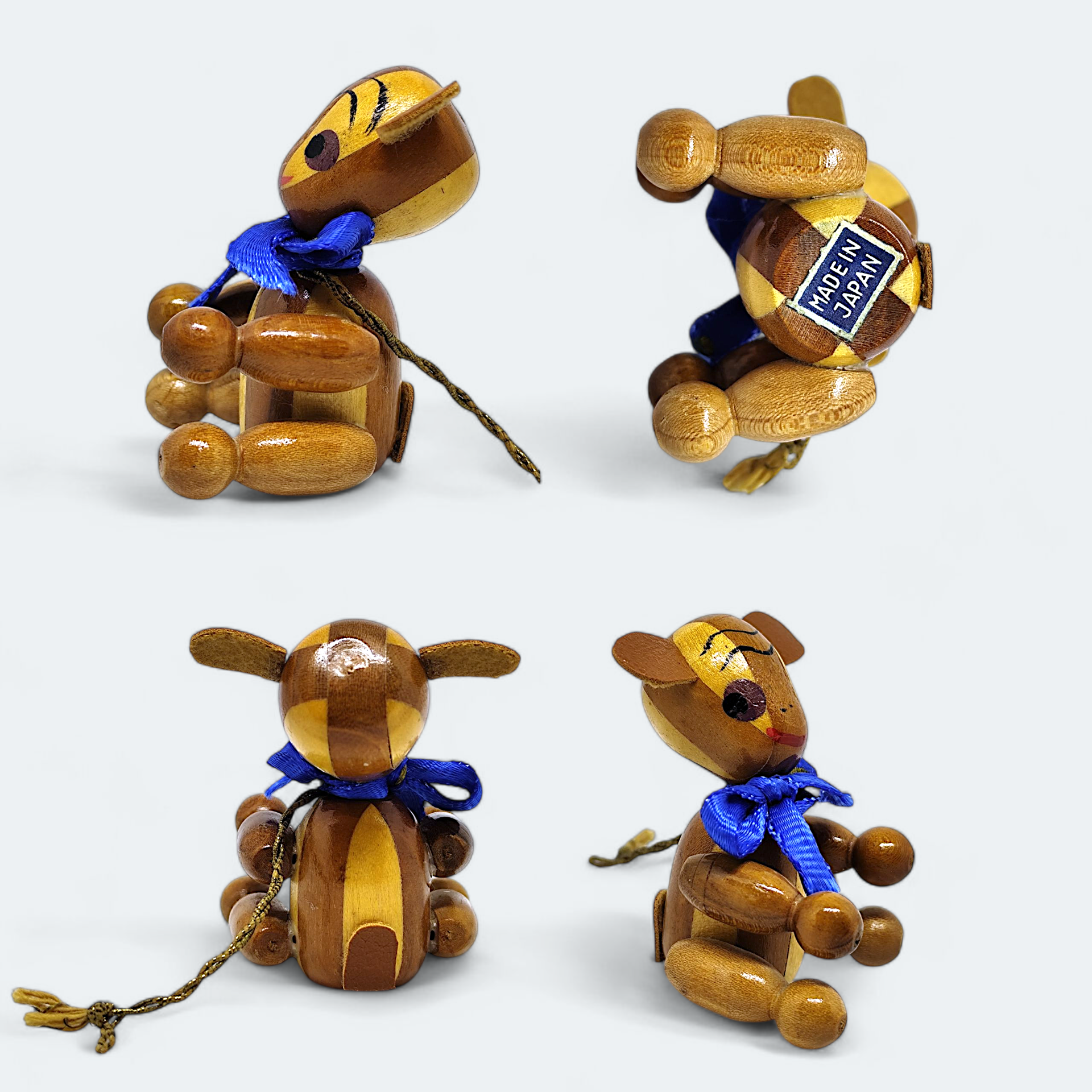 A charming vintage wooden toy, made in Japan. This cute figure has a blue bow around its neck and is made of wood. It is probably supposed to represent a monkey. It can be hung.