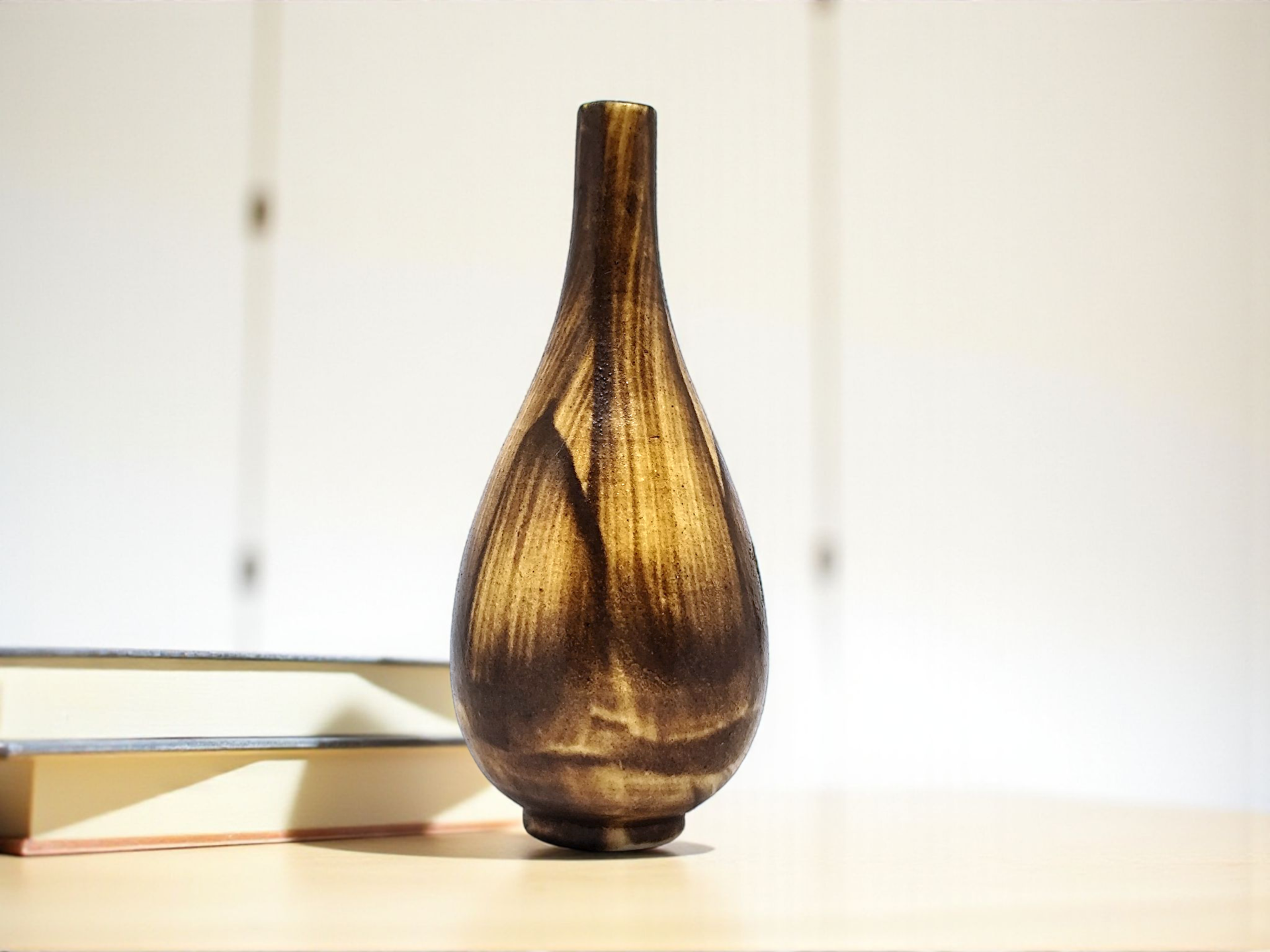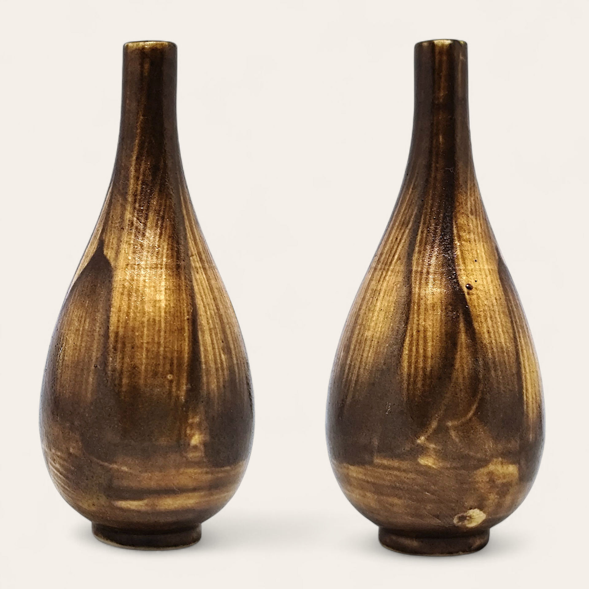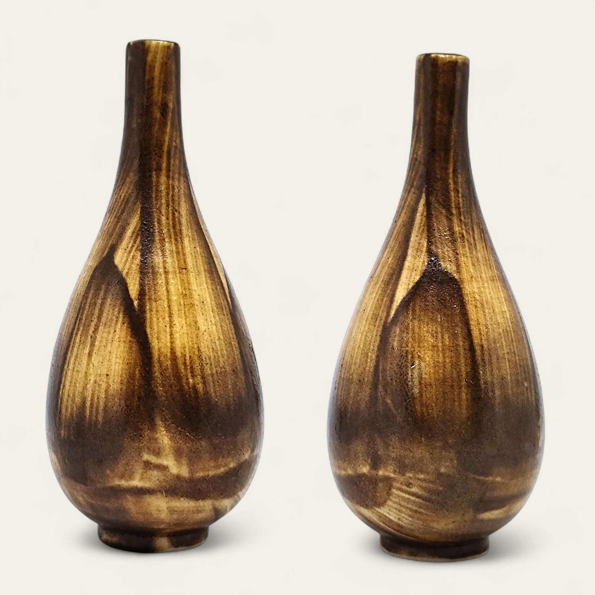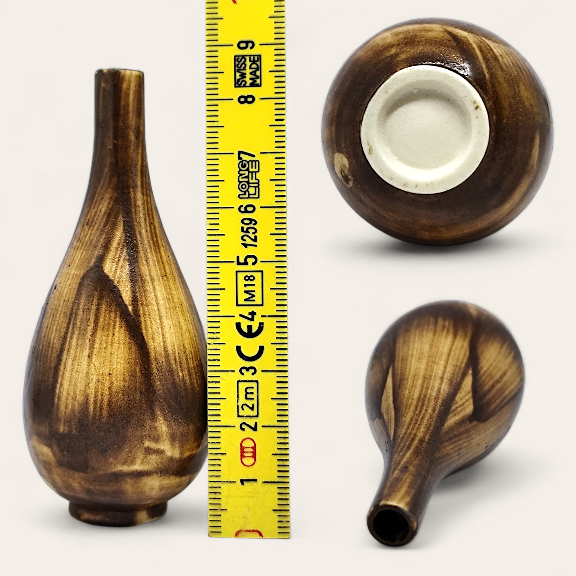 A decorative miniature vase in stoneware with a narrow neck, glaze and brown shades. Made in the Gunnar Nylund style. The vase is unsigned.