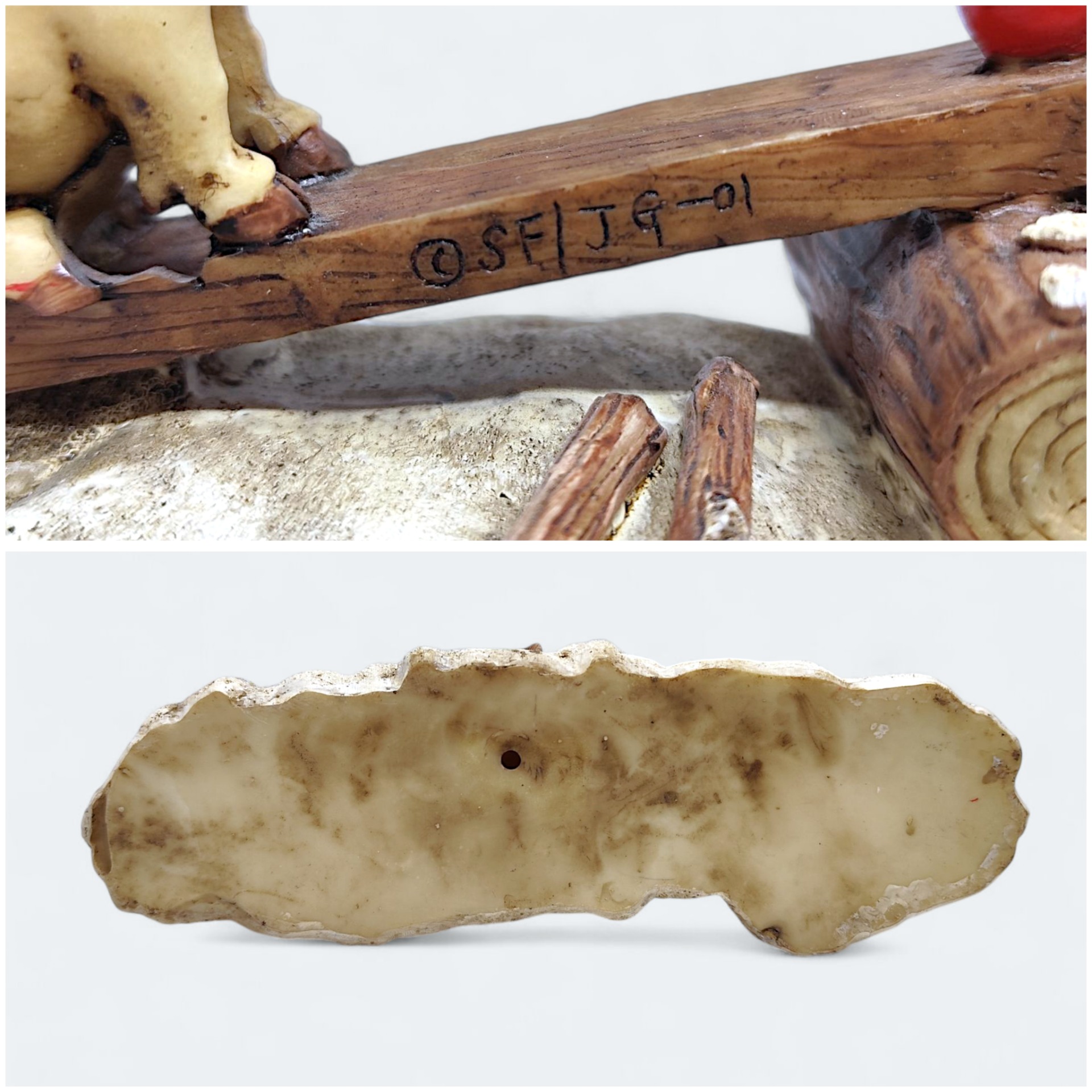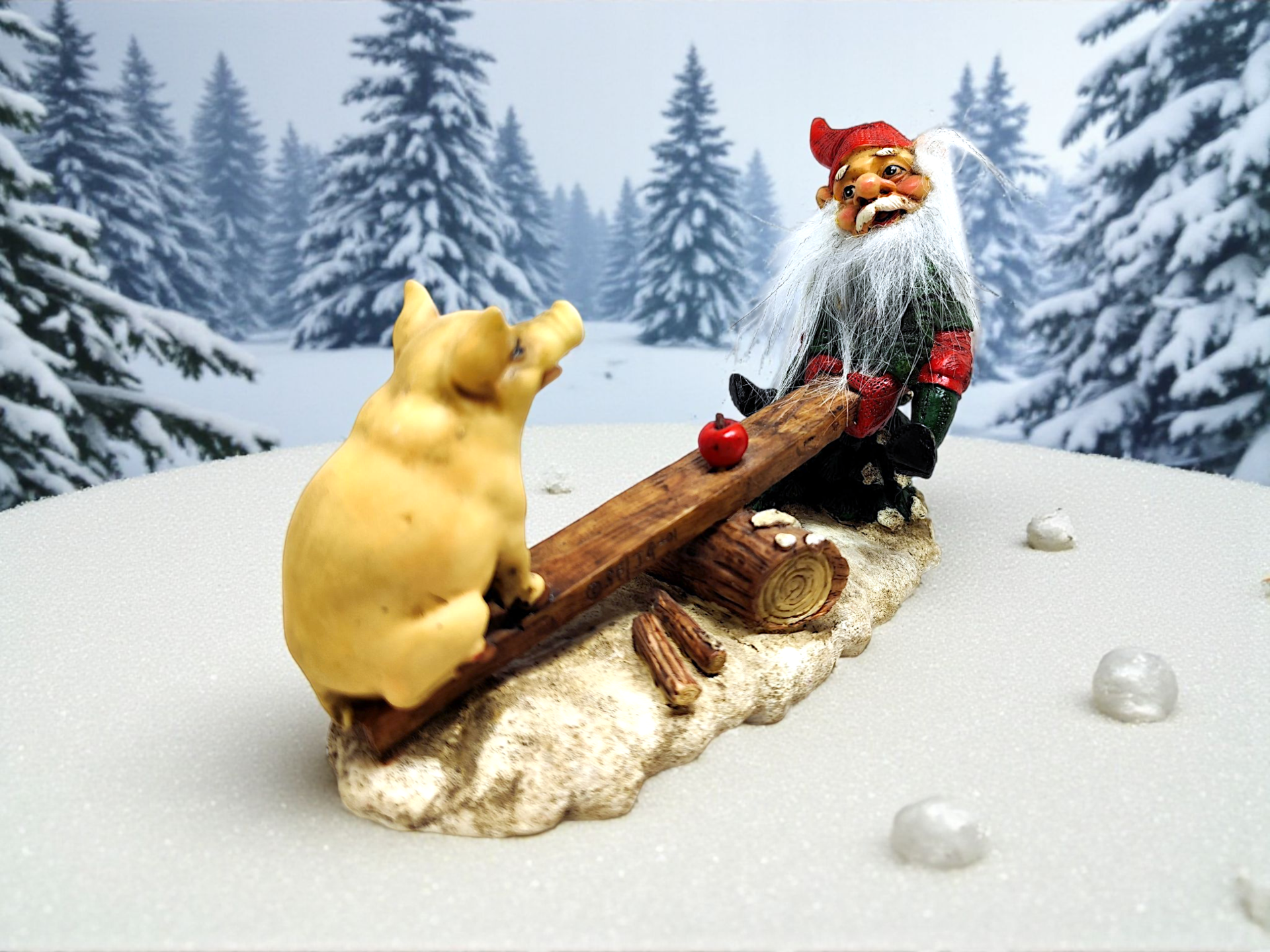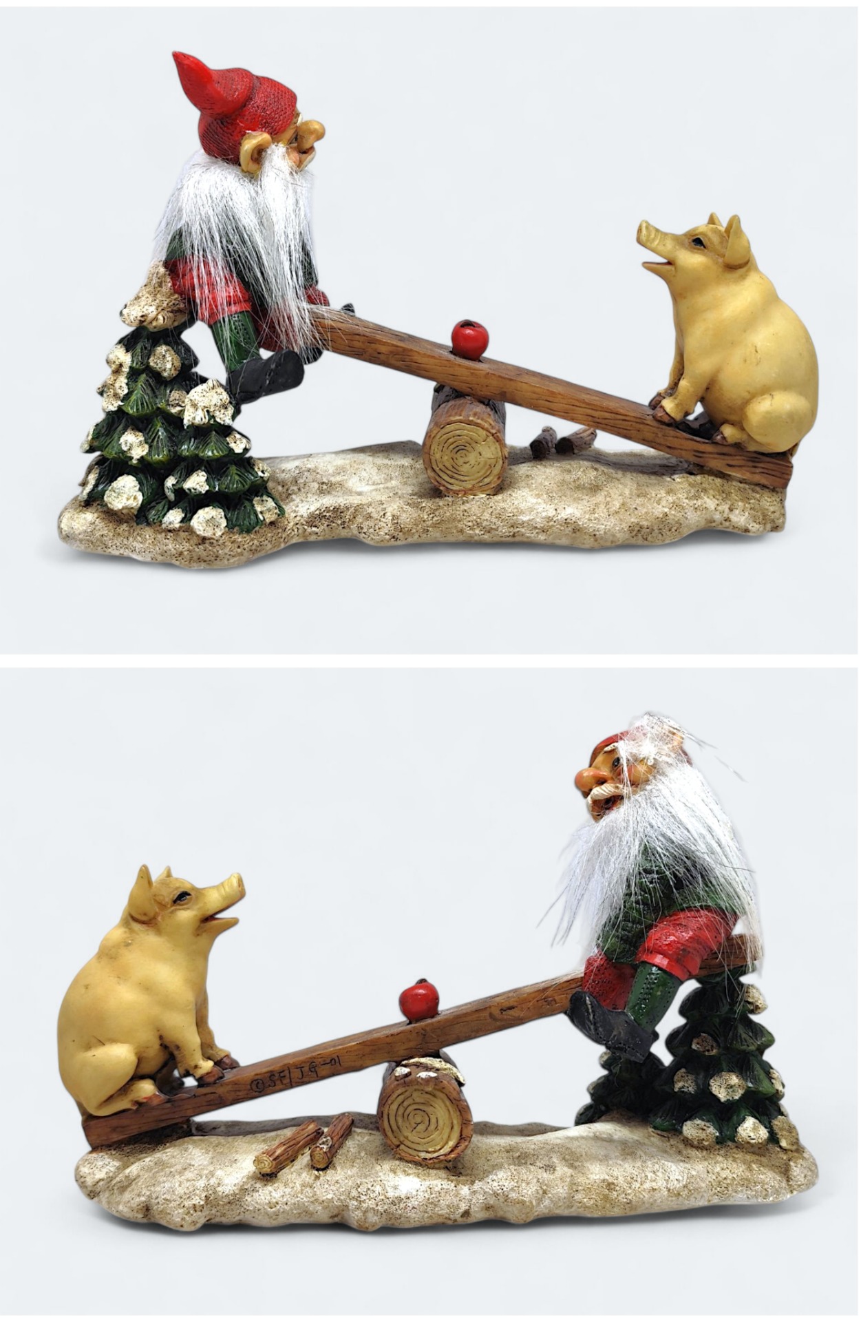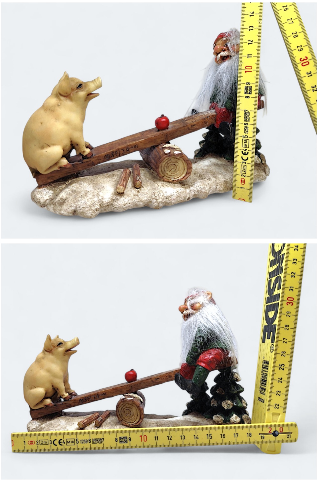 Traditional Swedish Santa with pig on seesaw. Made of resin or resin-like material in 2001. Marked SE/JG-01. Perfect for spreading Christmas spirit in the home.