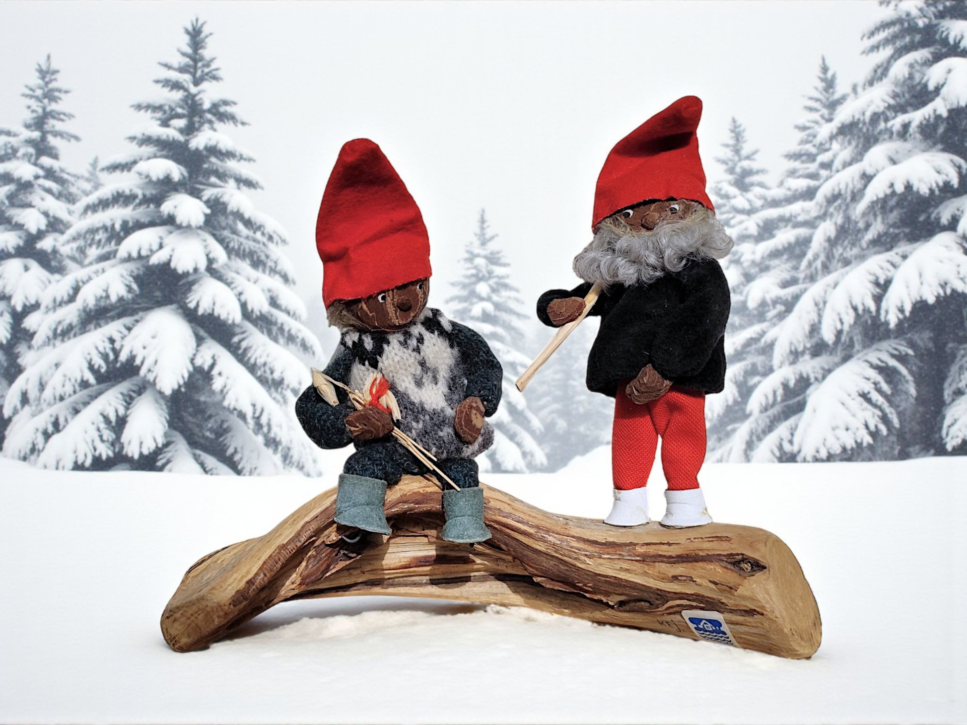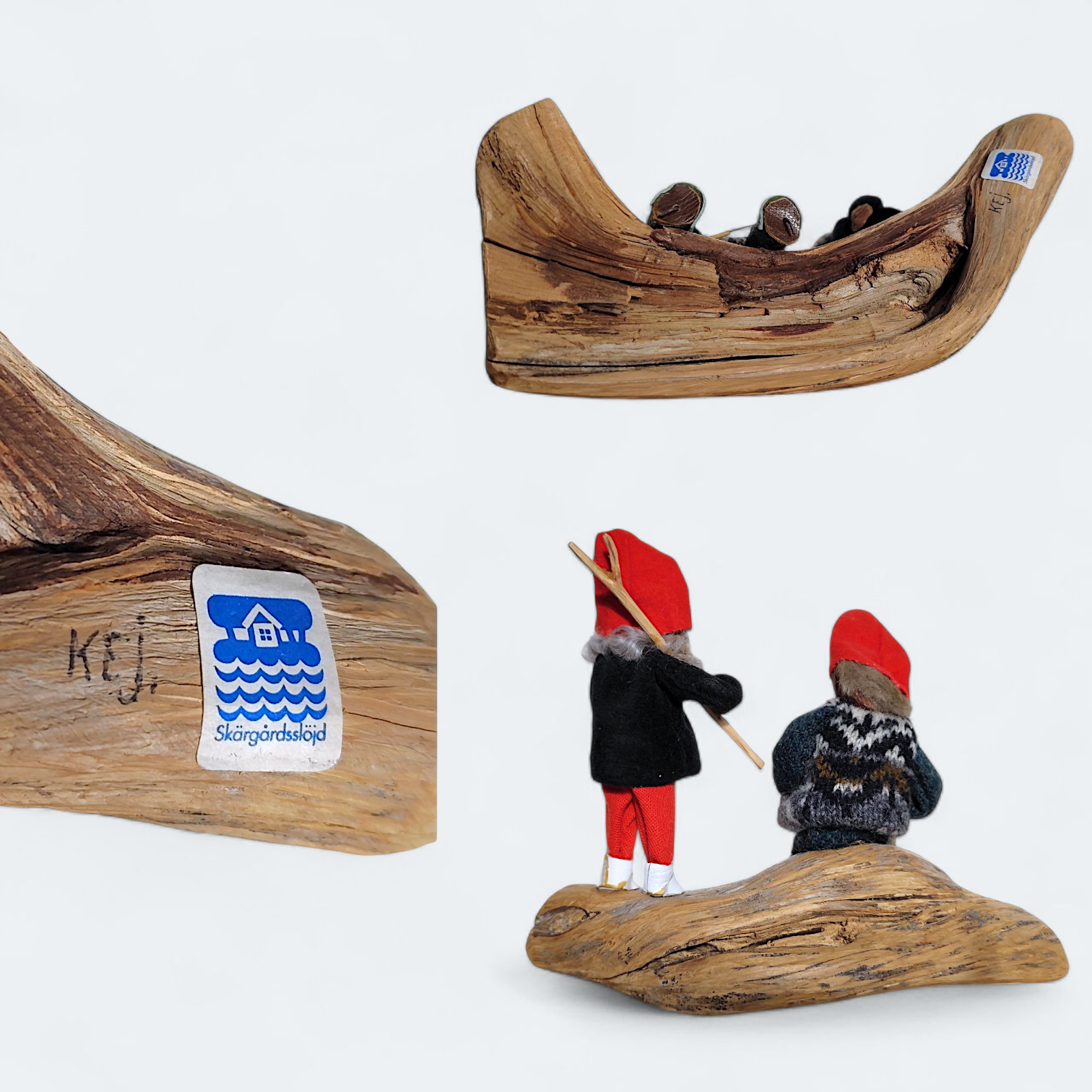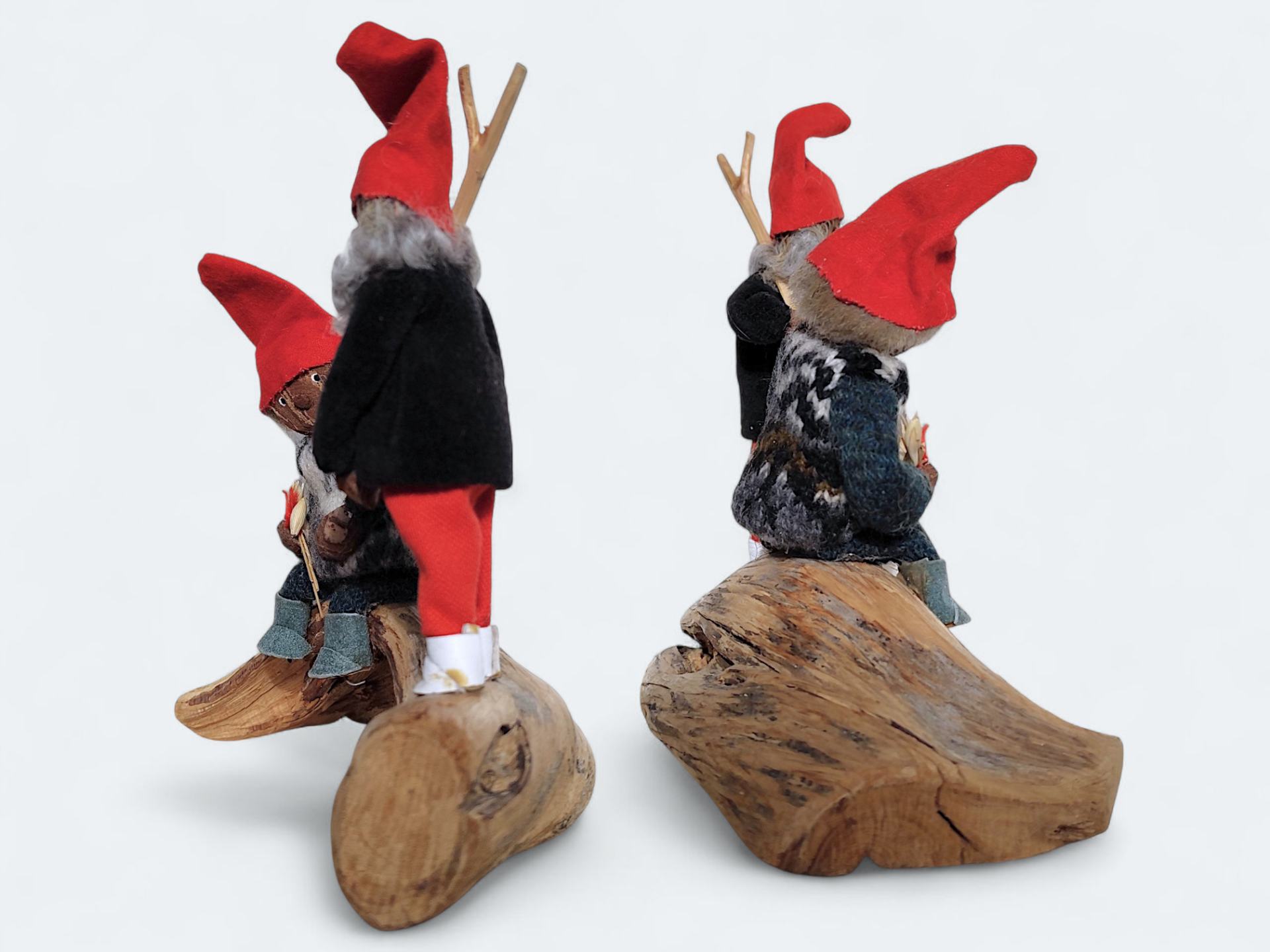 Two handmade gnomes from Skärgårdsslöjd KEJ, placed on a piece of driftwood. Perfect as a decorative detail during Christmas or as a unique interior detail all year round.
