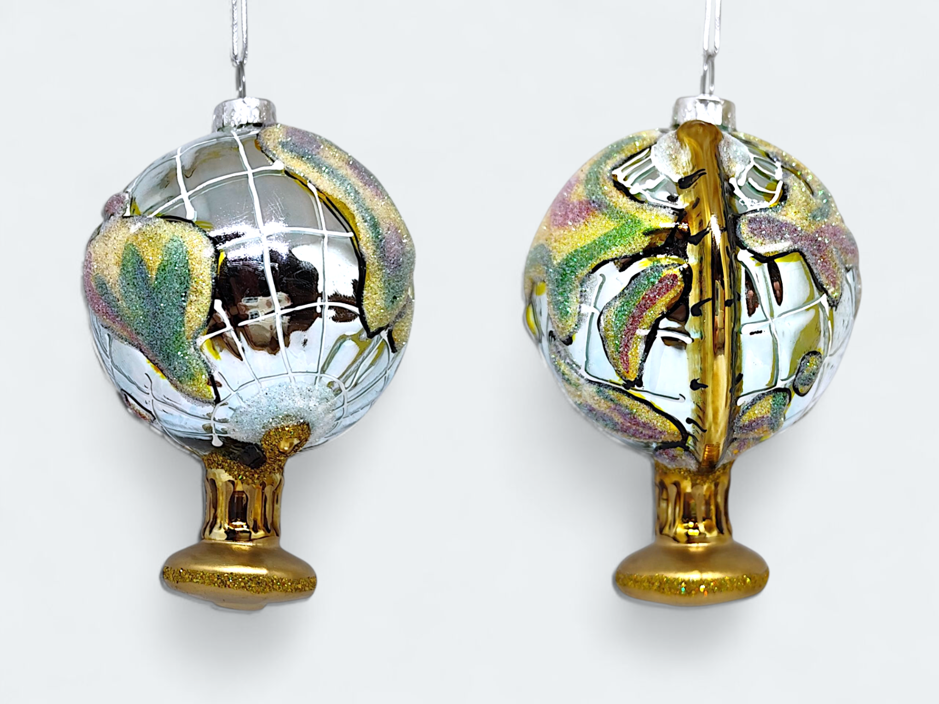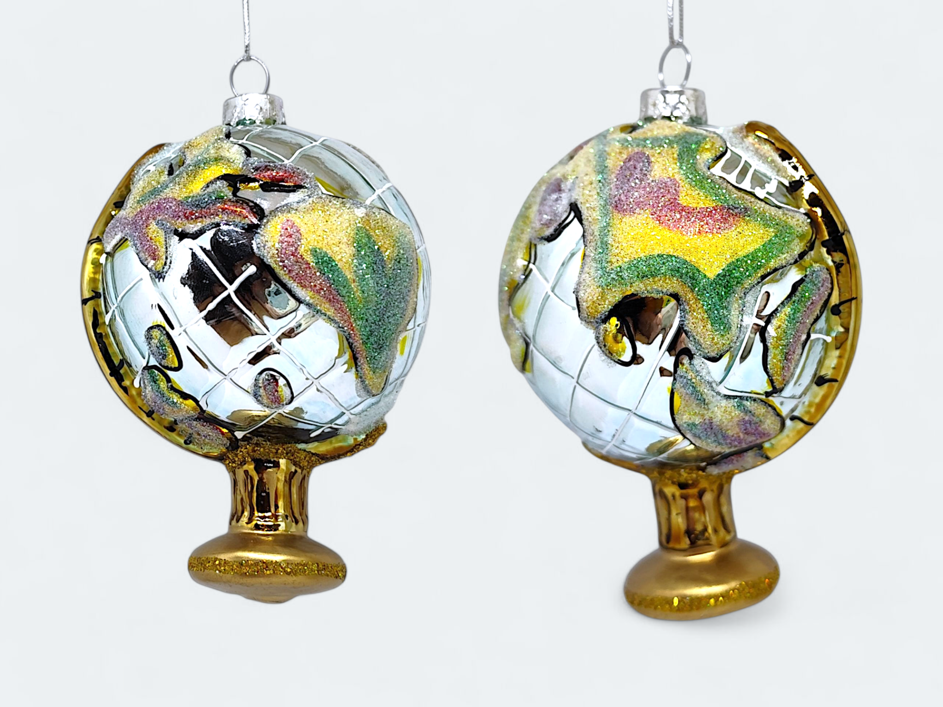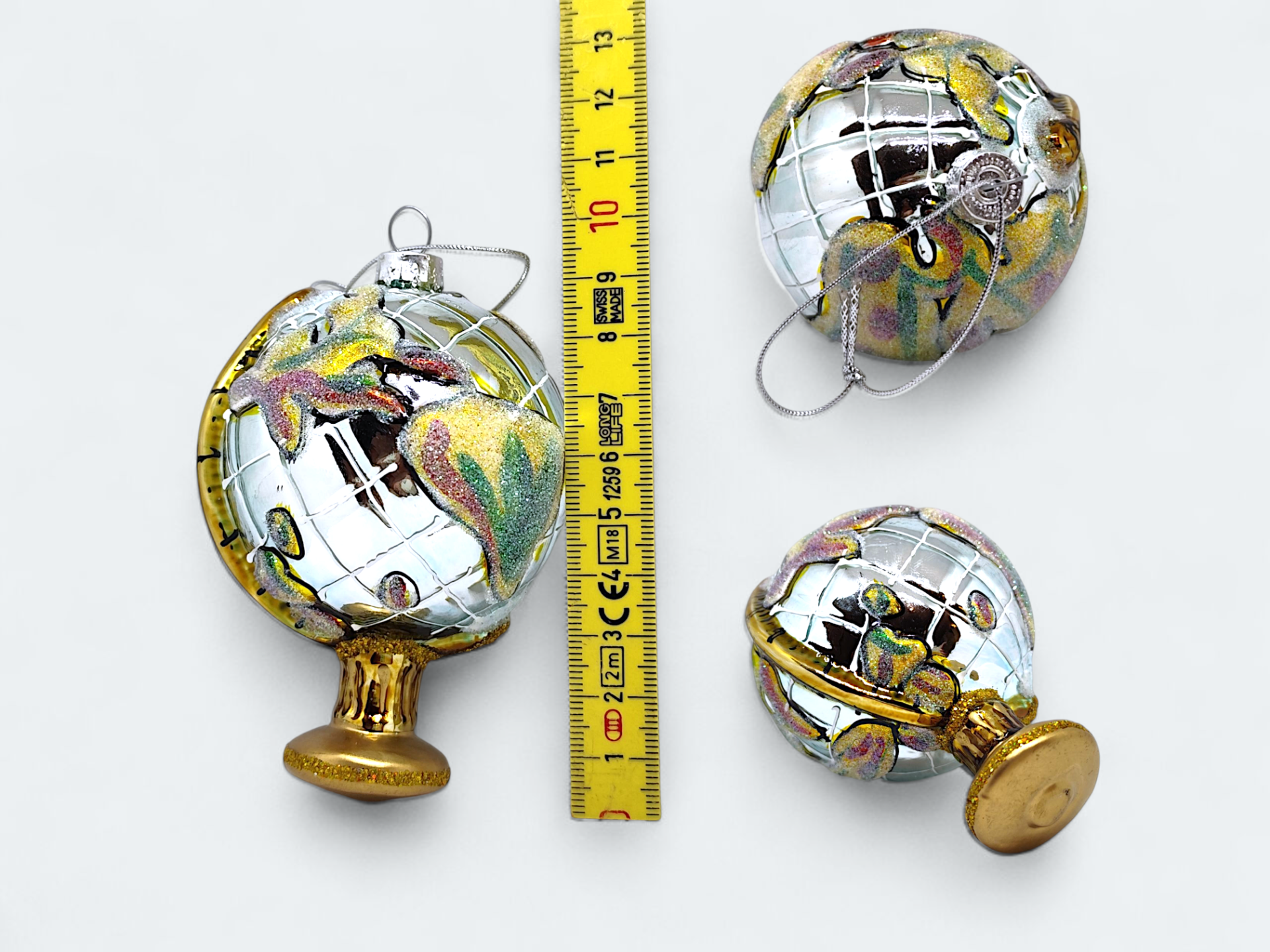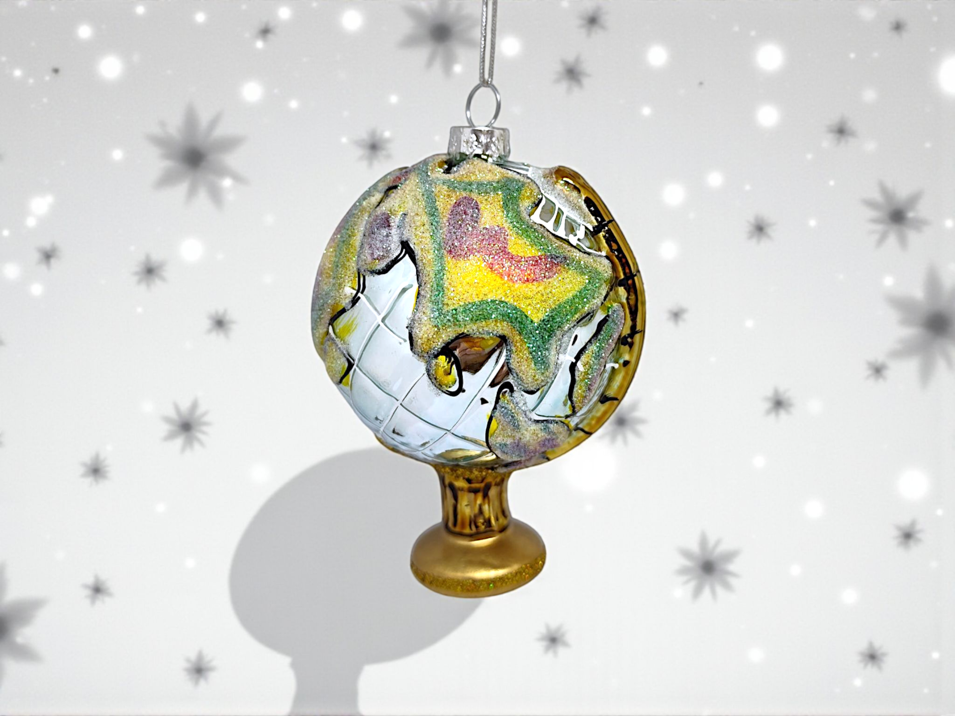 A Globus Christmas tree ornament. Made of glass. The Christmas tree ornament represents Planet Earth. It was made in Poland.