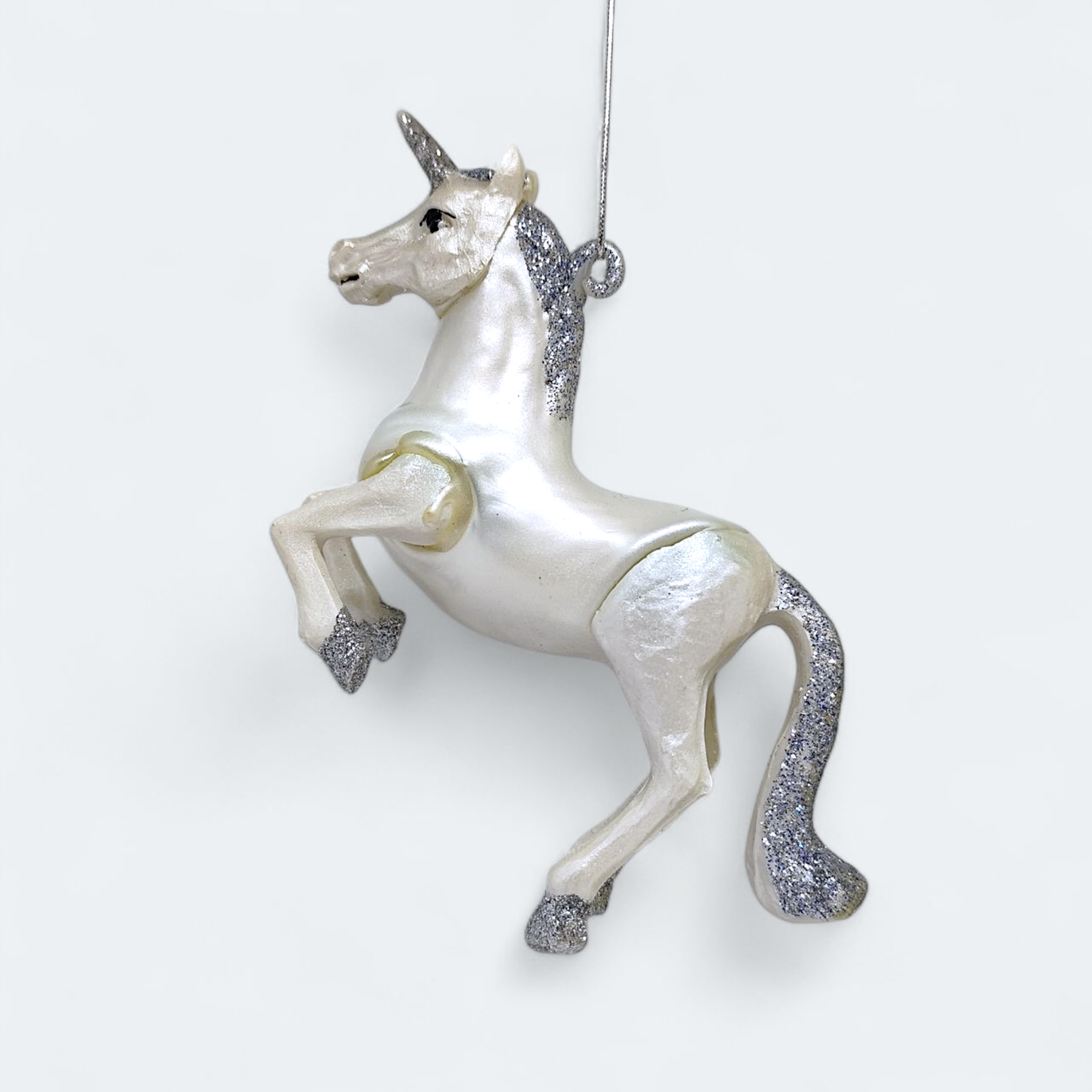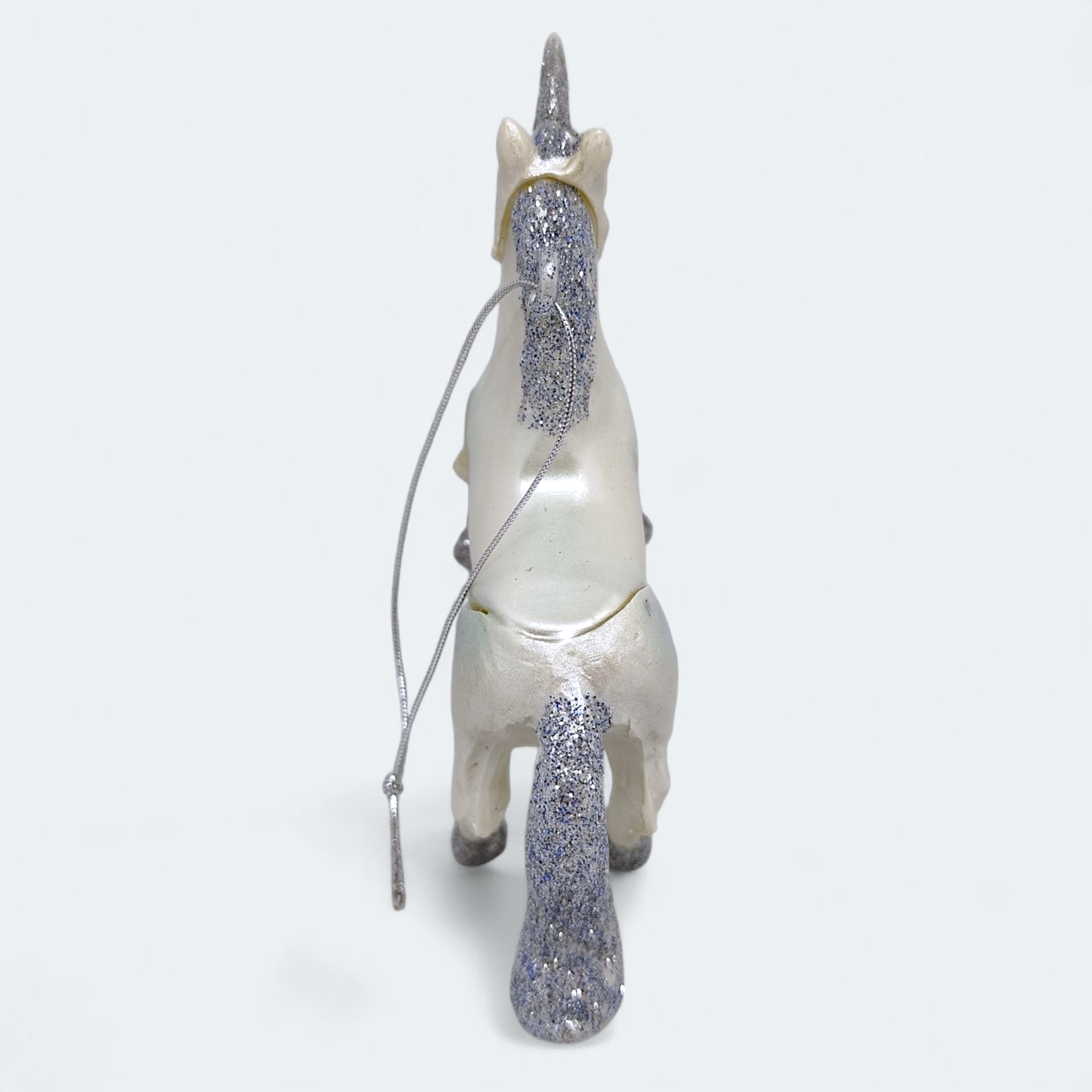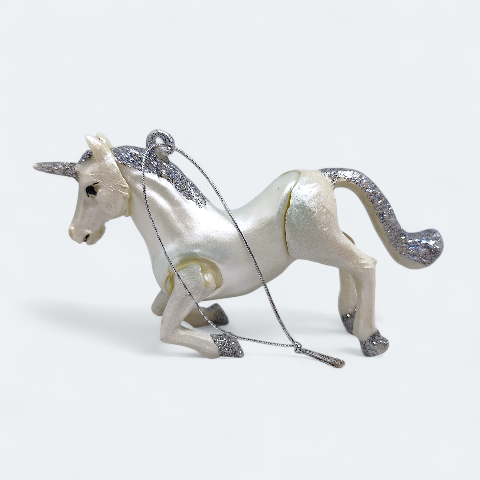 A Christmas tree ornament in the shape of a unicorn with glitter details. Made of glass. Perfect for creating a magical Christmas atmosphere.