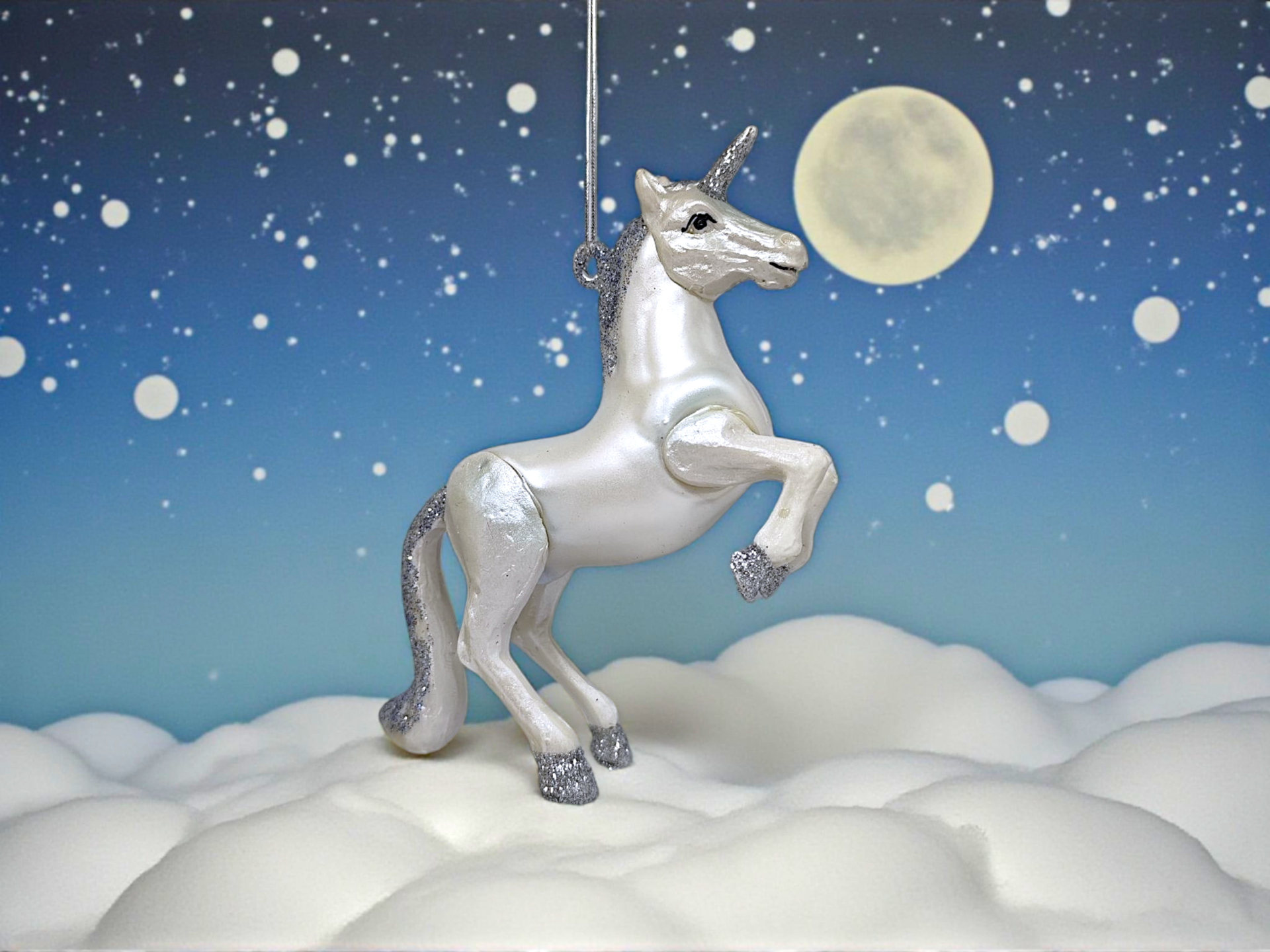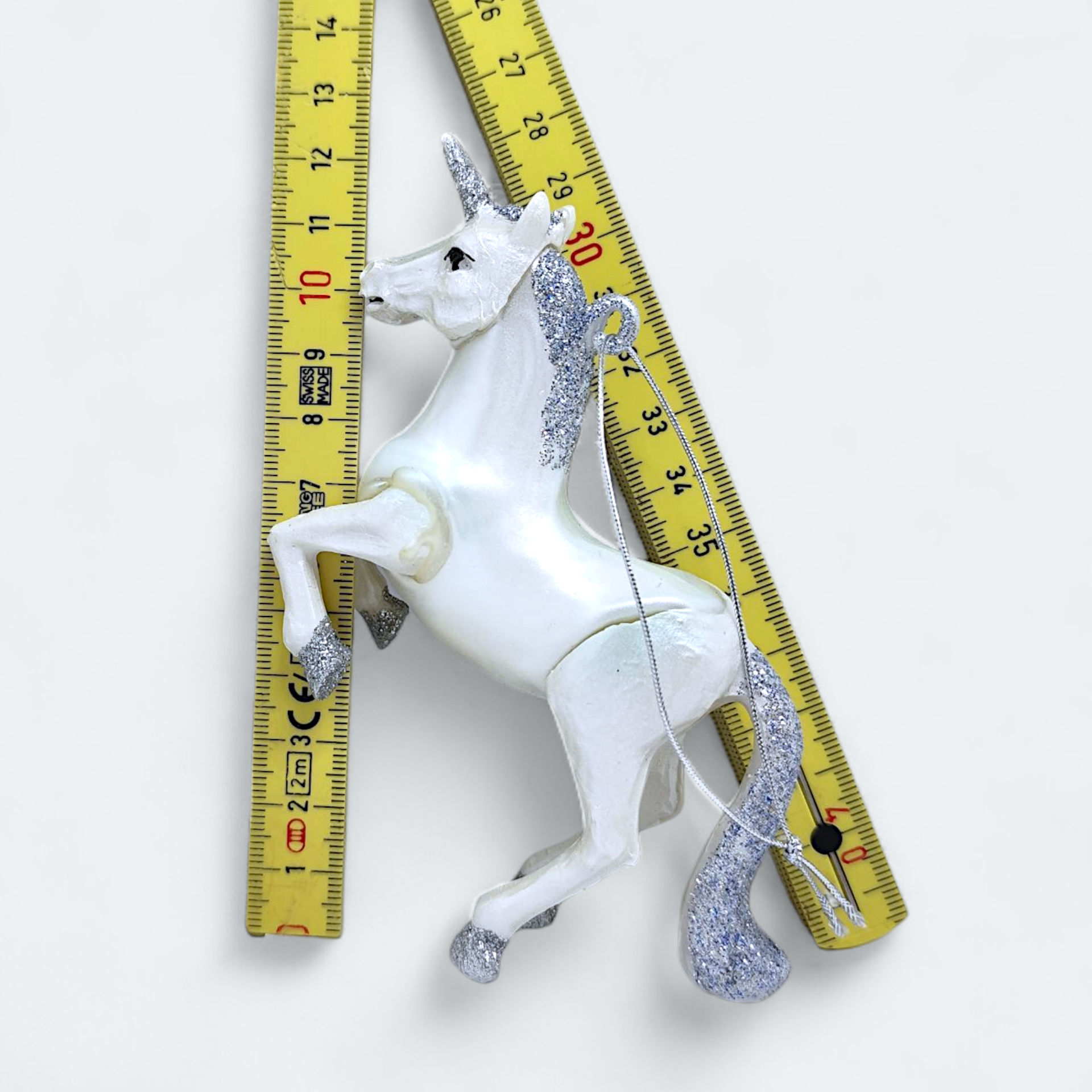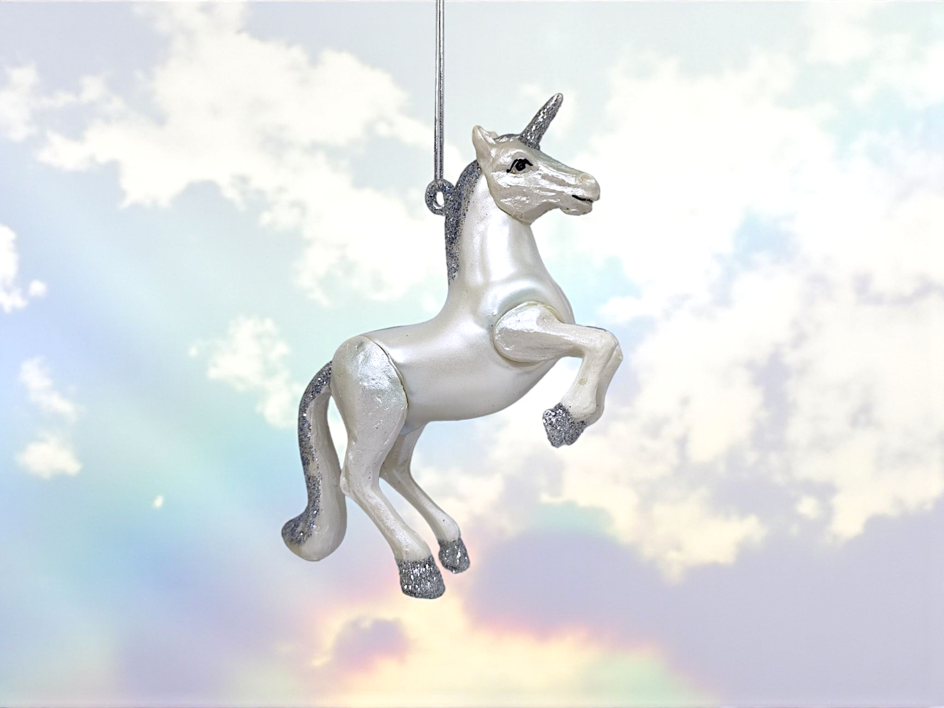 A Christmas tree ornament in the shape of a unicorn with glitter details. Made of glass. Perfect for creating a magical Christmas atmosphere.
