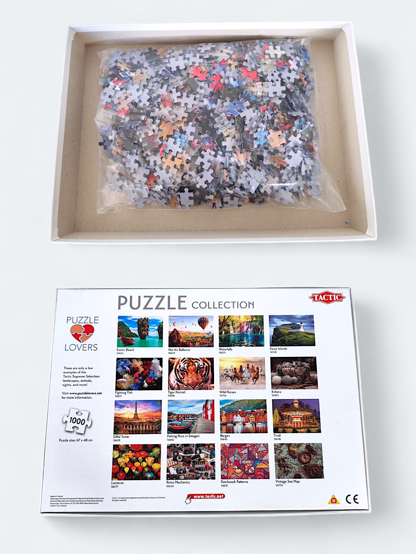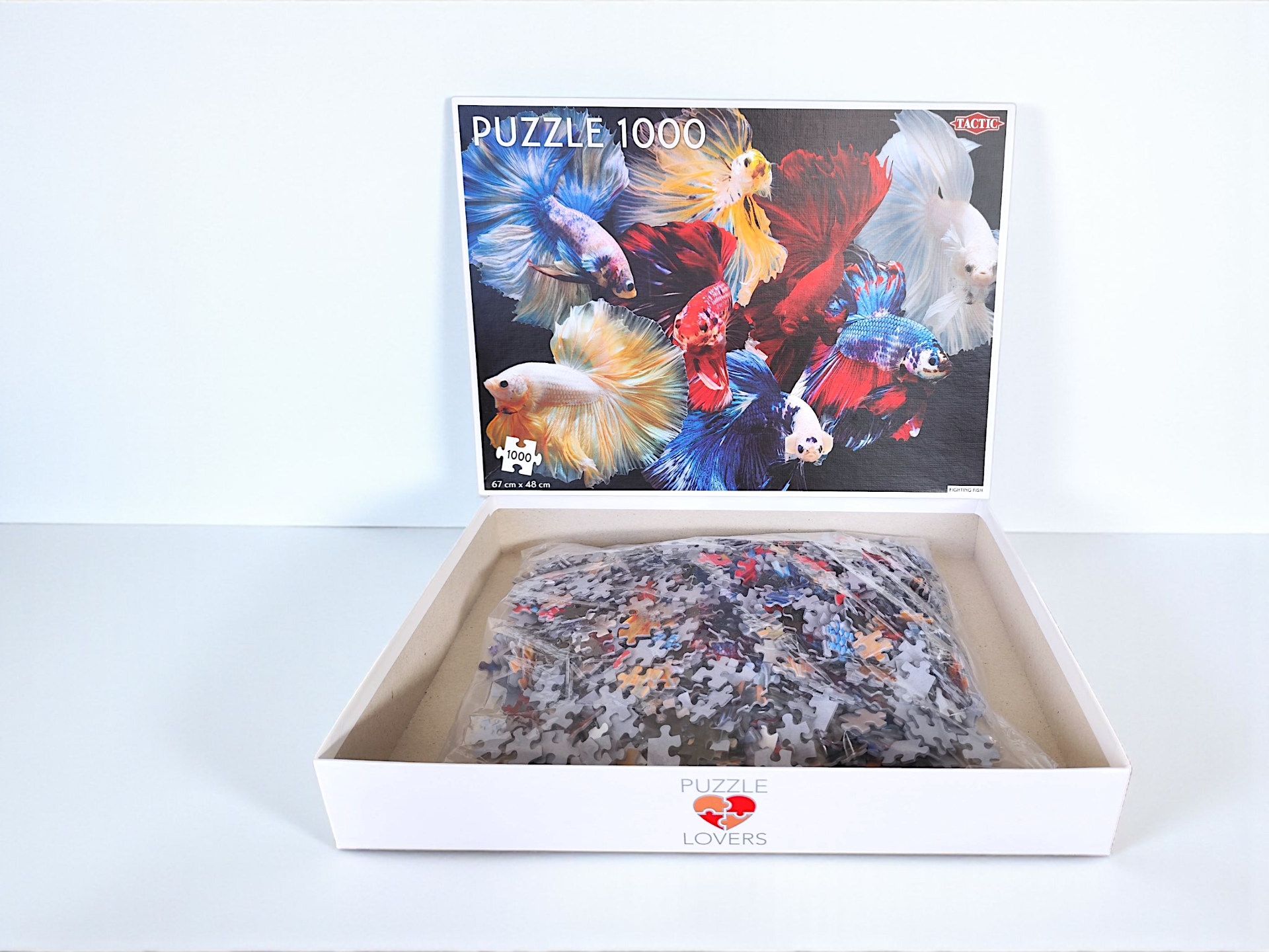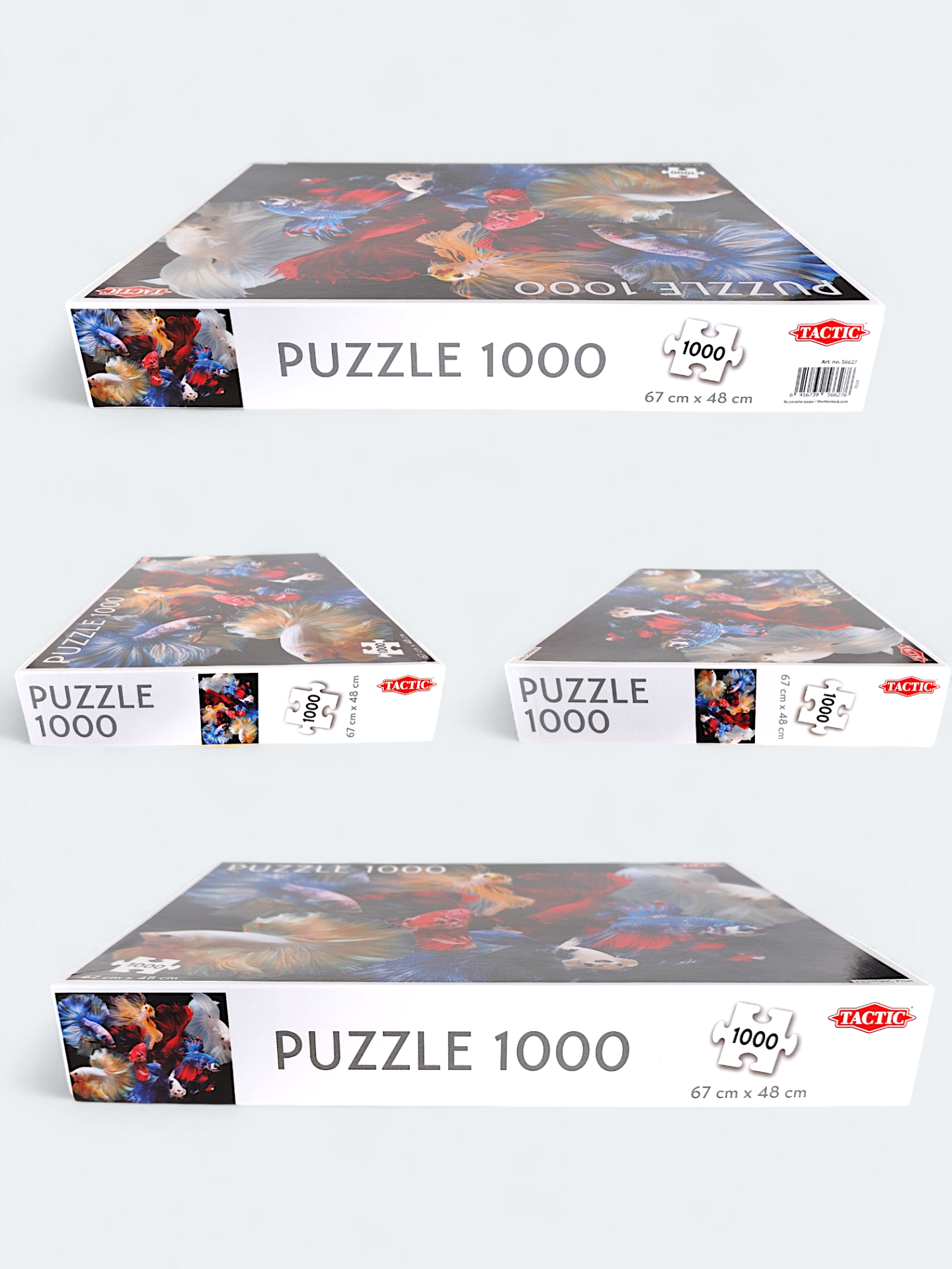1000 piece puzzle from Tactic. Dimensions: 67 cm x 48 cm. The image depicts a collection of colorful fish.