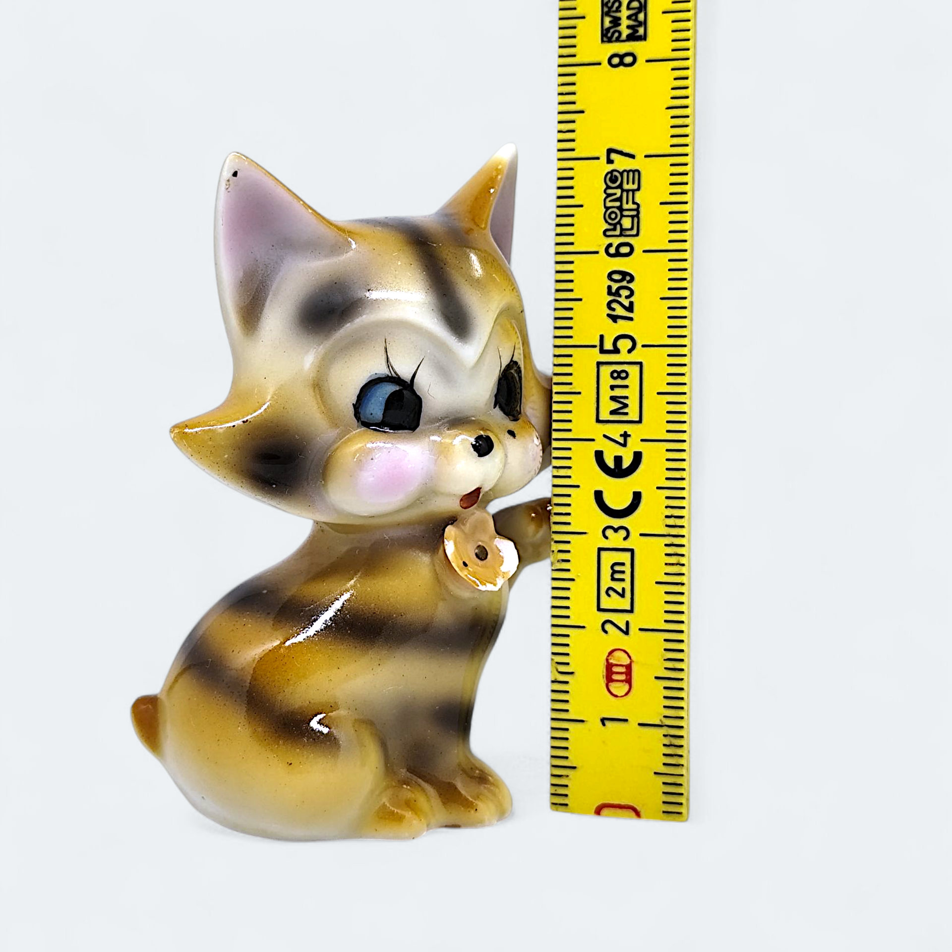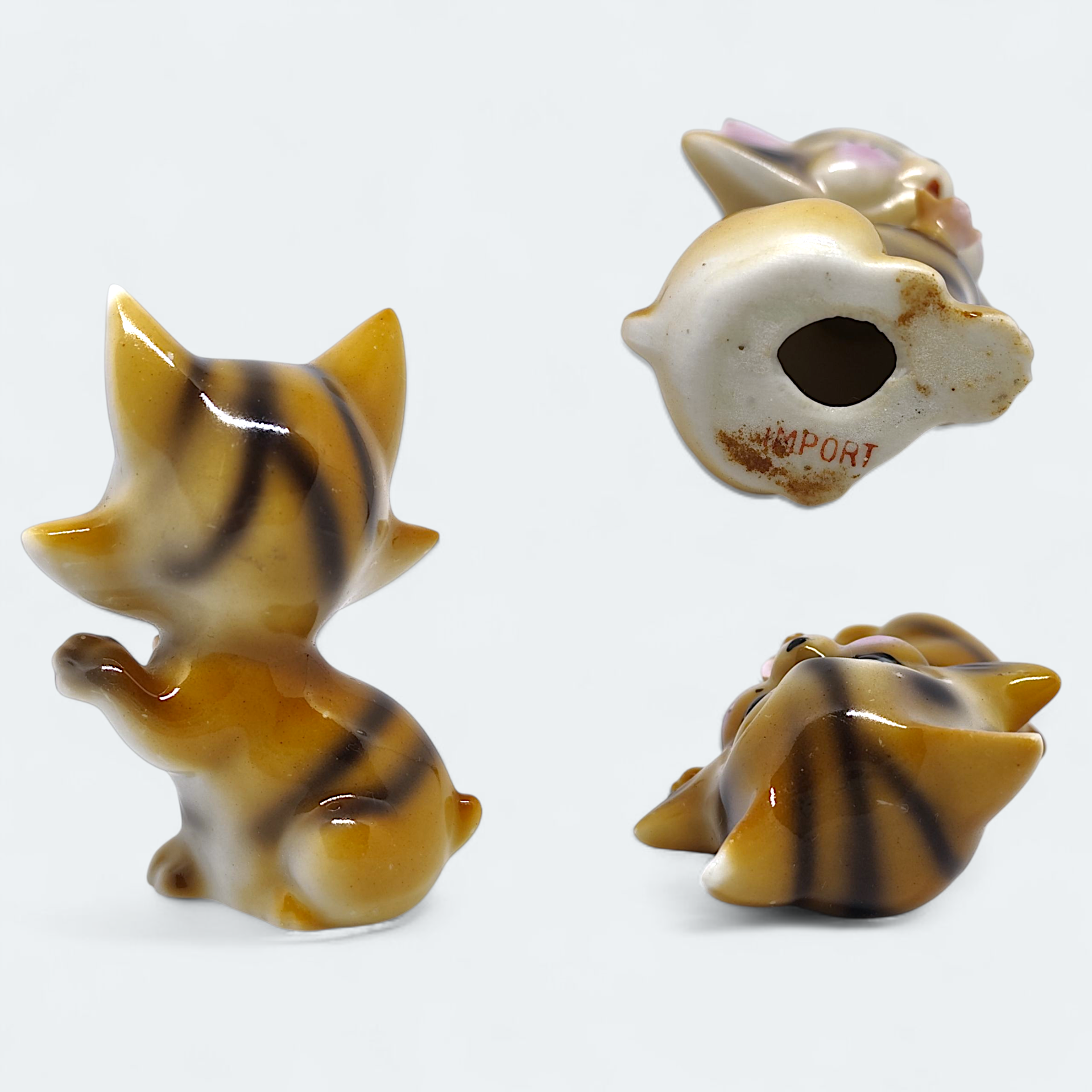 A vintage anthropomorphic orange cat figurine made of porcelain. This collectible was made in Japan in the 1950s. This gives it a unique touch to its design and is sought after by collectors. The figurine's imaginative and charming appearance makes it a desirable item for cat lovers and collectors of unique animal figurines.