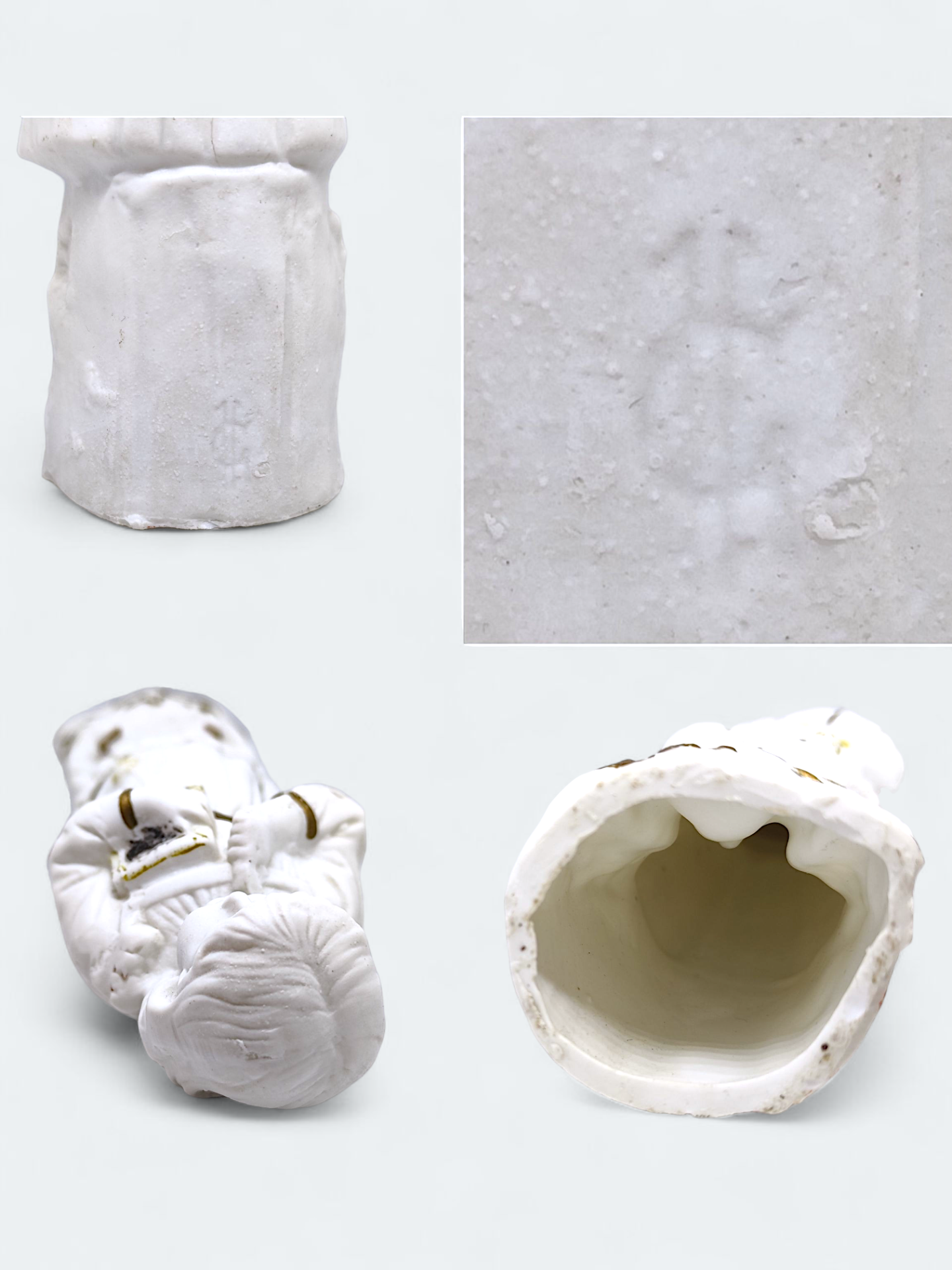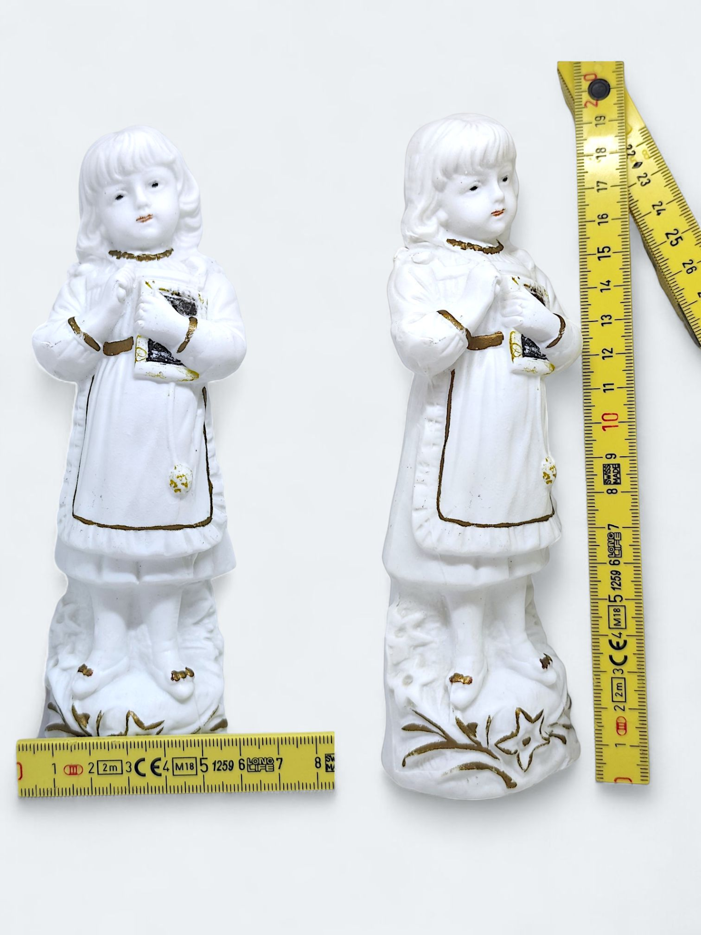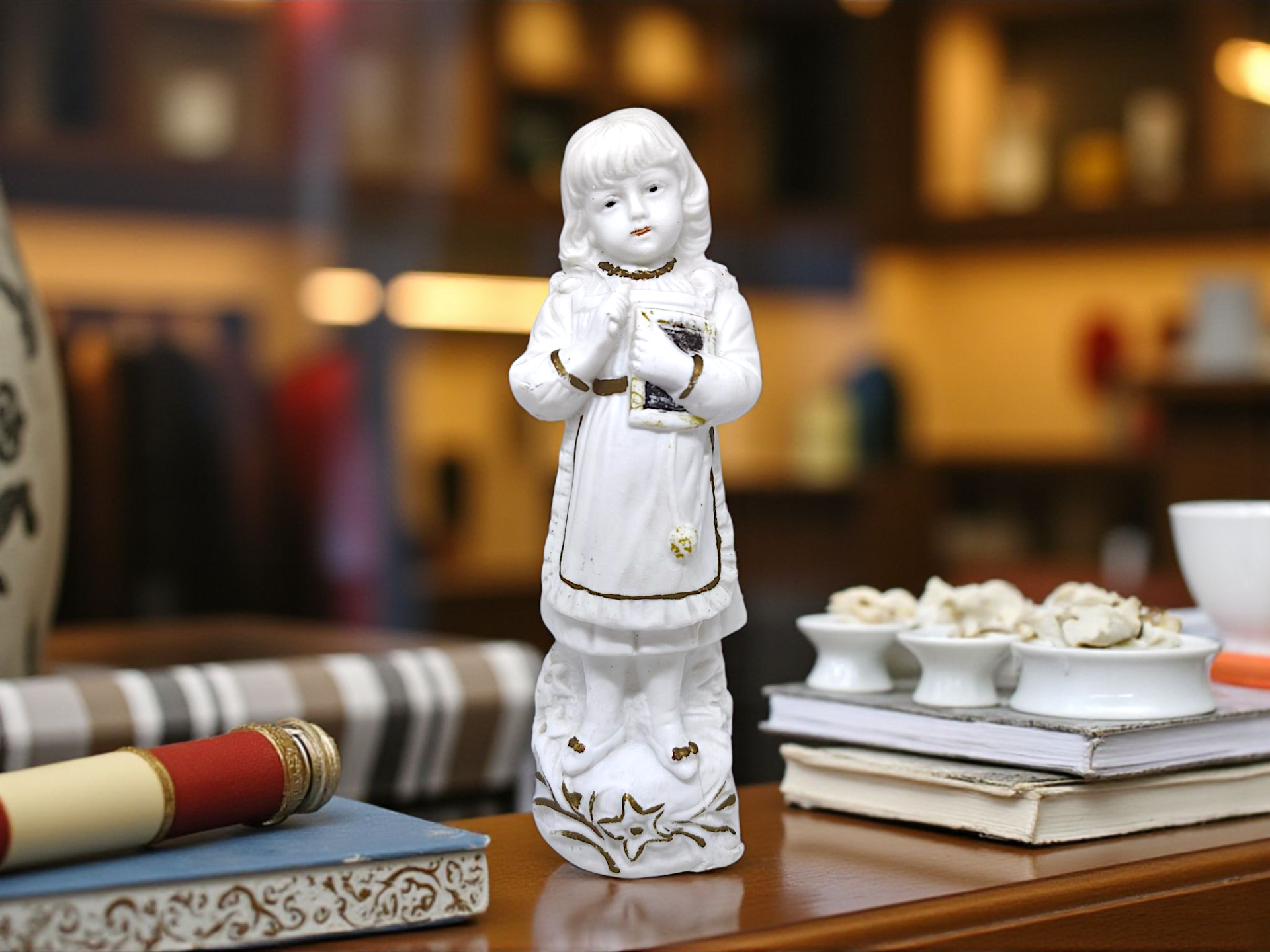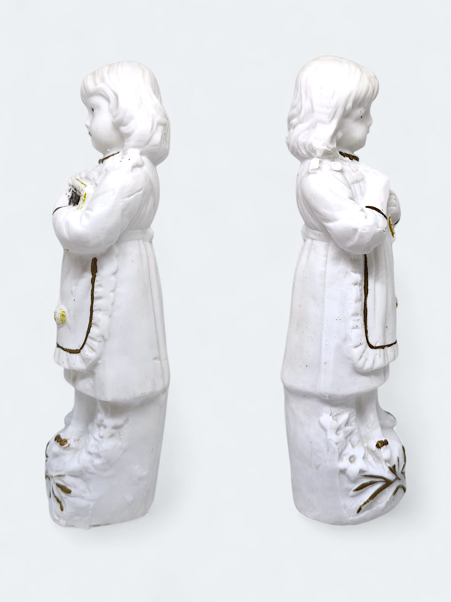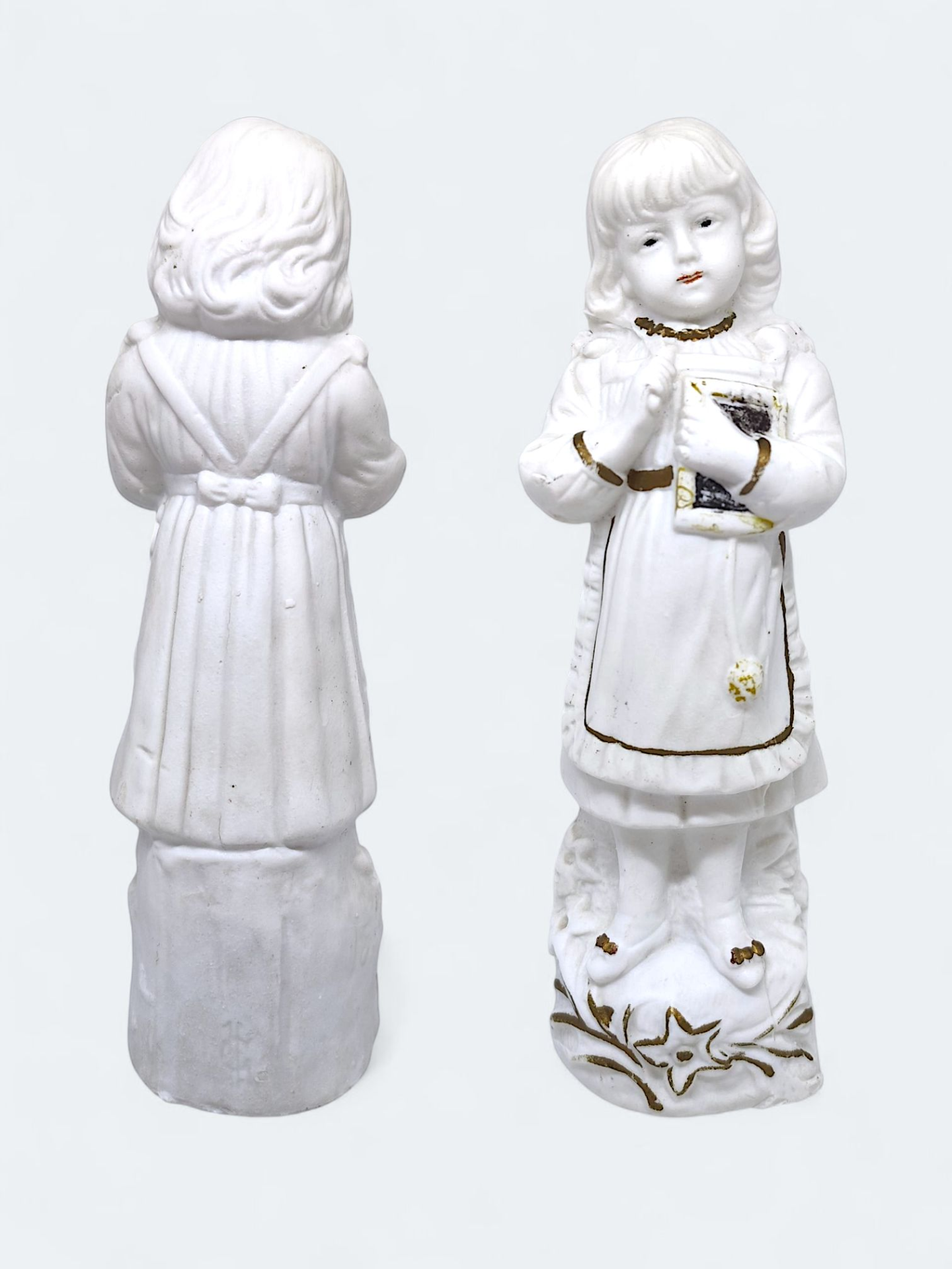 An antique Grafenthal bisque porcelain figurine of a girl holding a book. The figurine is detailed with gold accents and has a classic design. Made in Germany between 1879-1886.