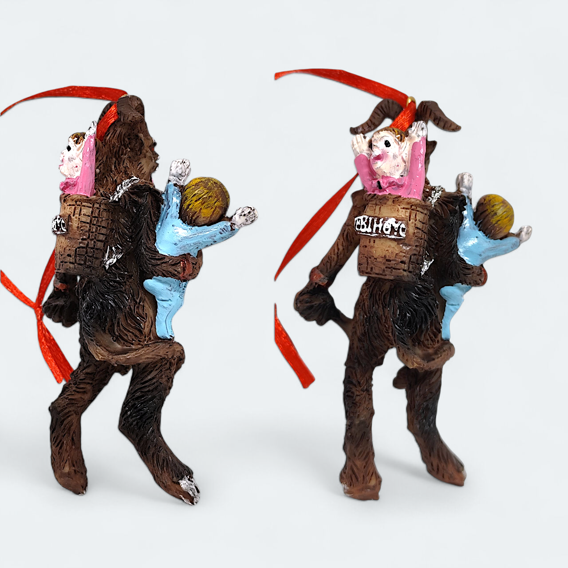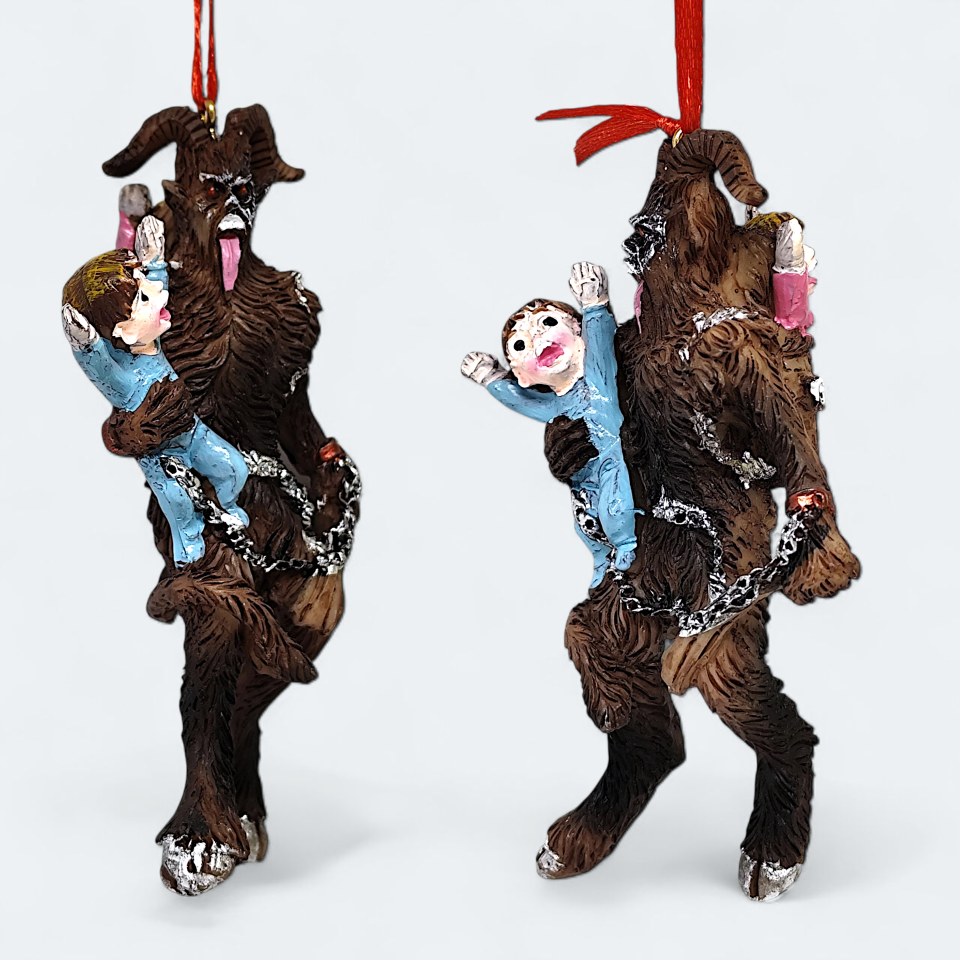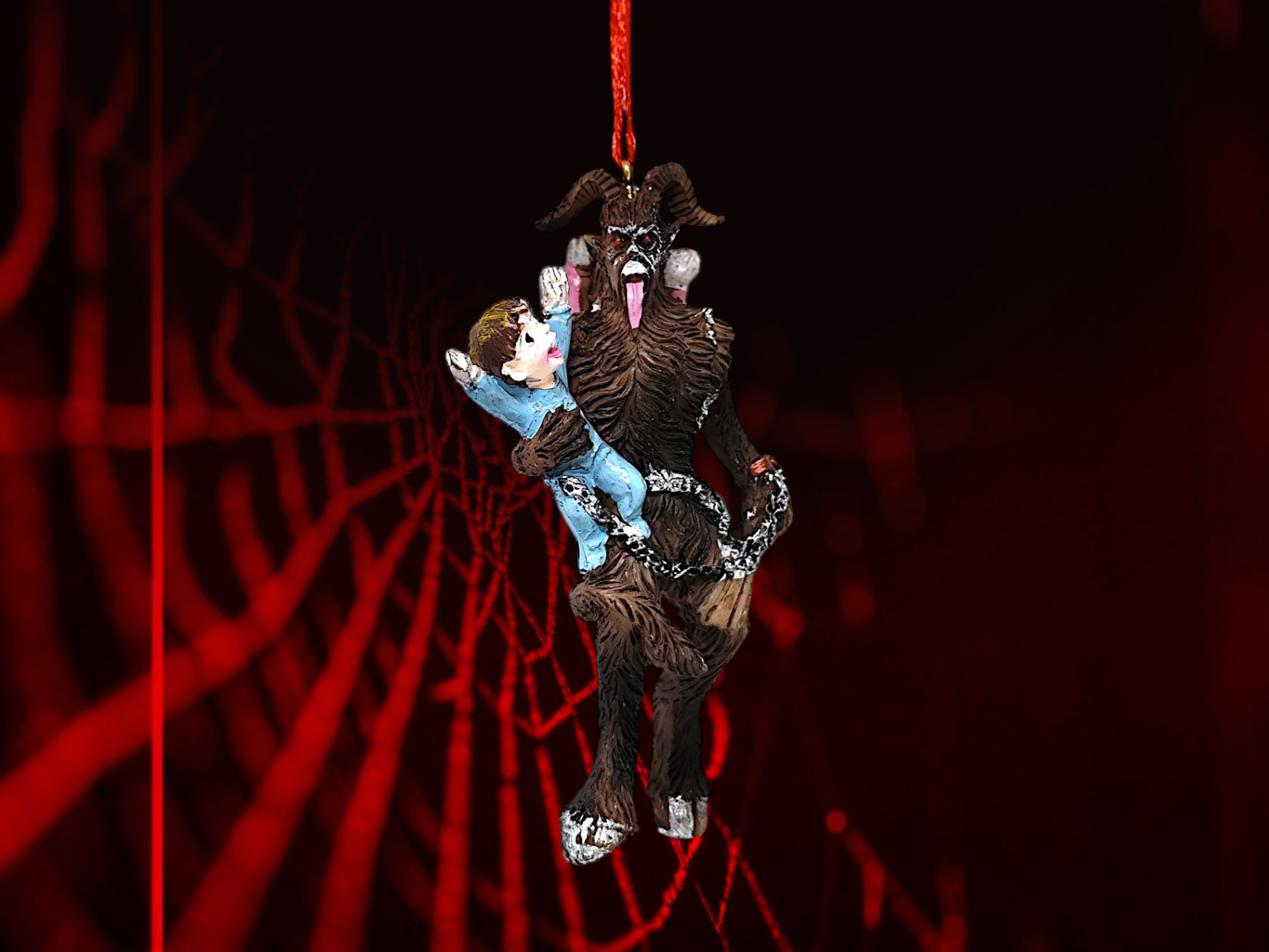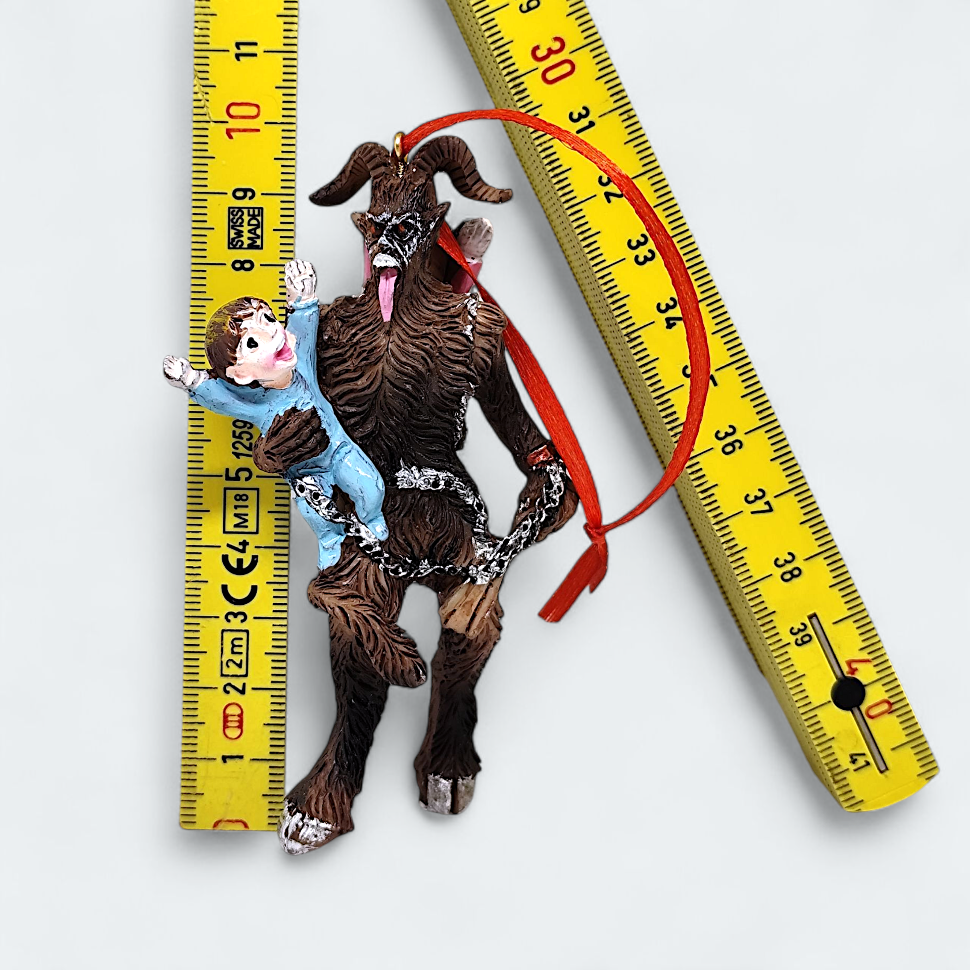 A decorative Krampus figure, perfect as a Christmas decoration. Krampus holds a child in his arms and has a chain around his body.