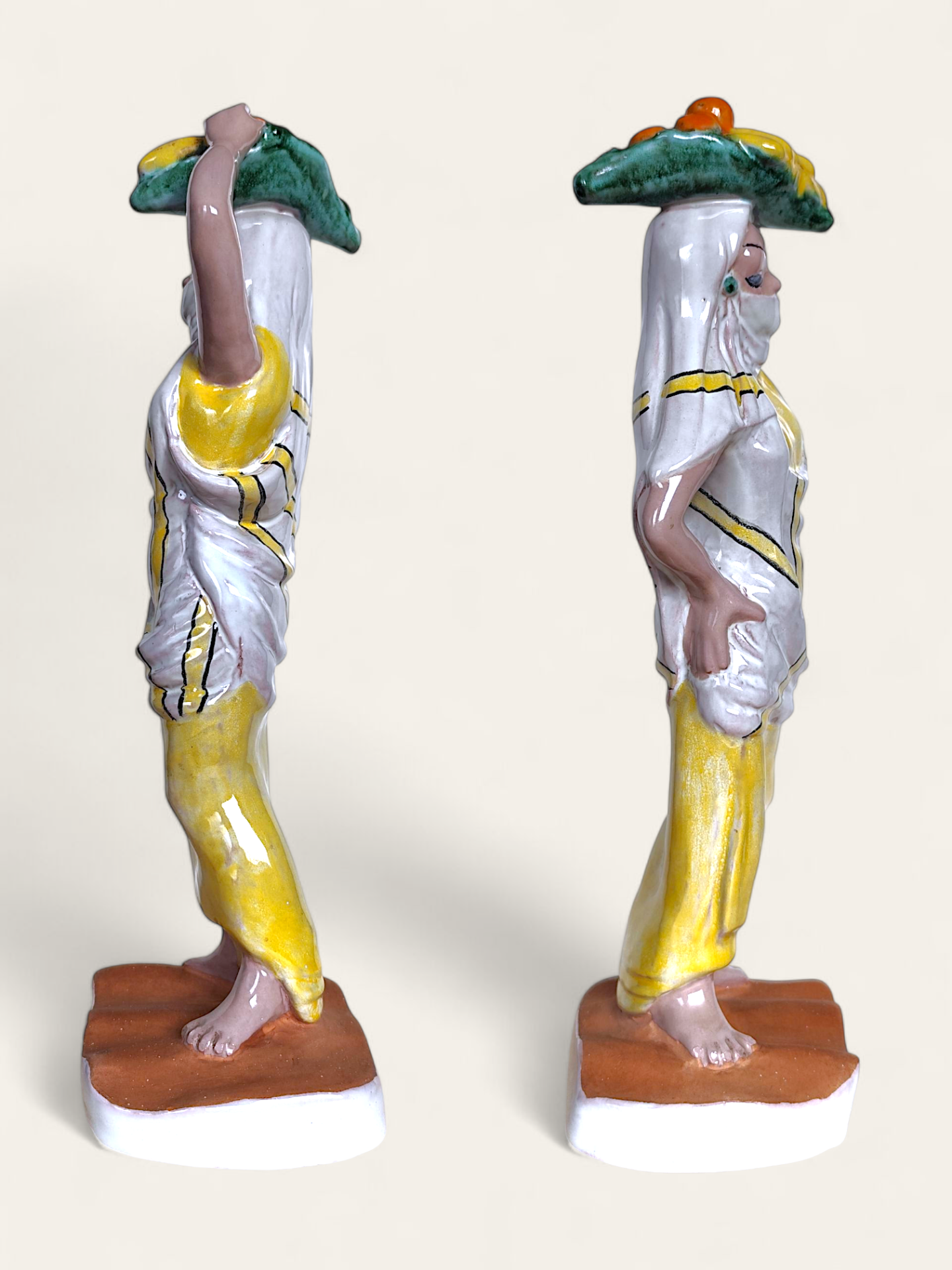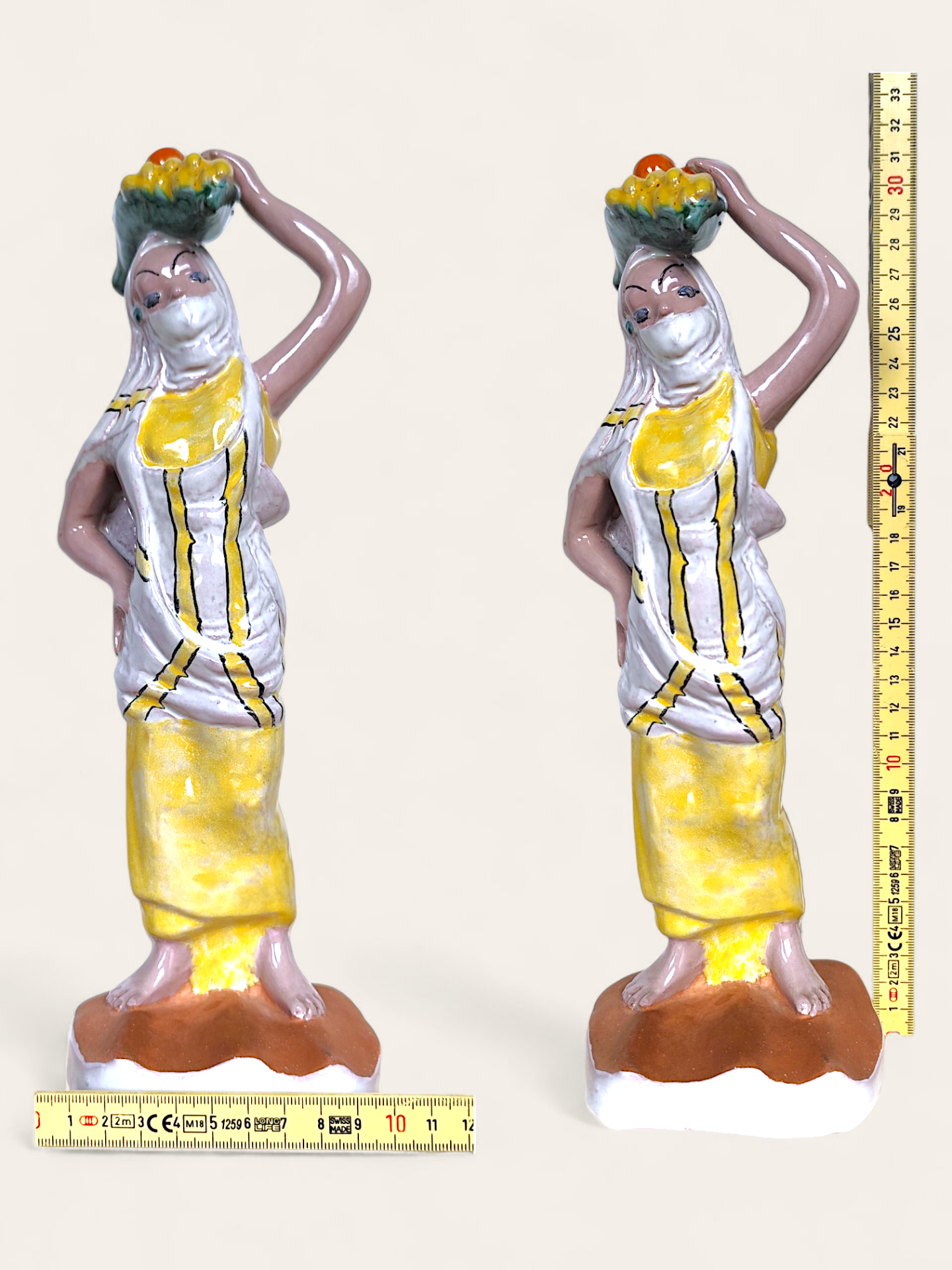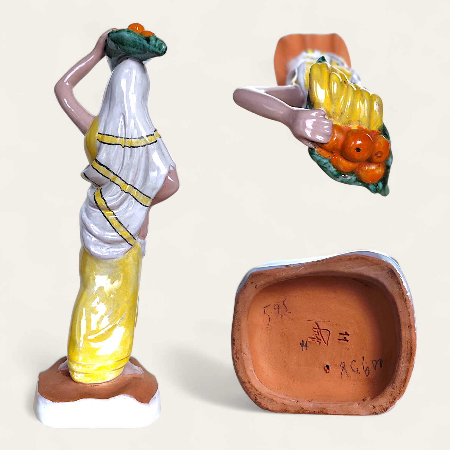 A vintage figurine depicting a woman carrying a bowl of fruit on her head. It is made of glazed ceramic in a style typical of the mid-20th century.