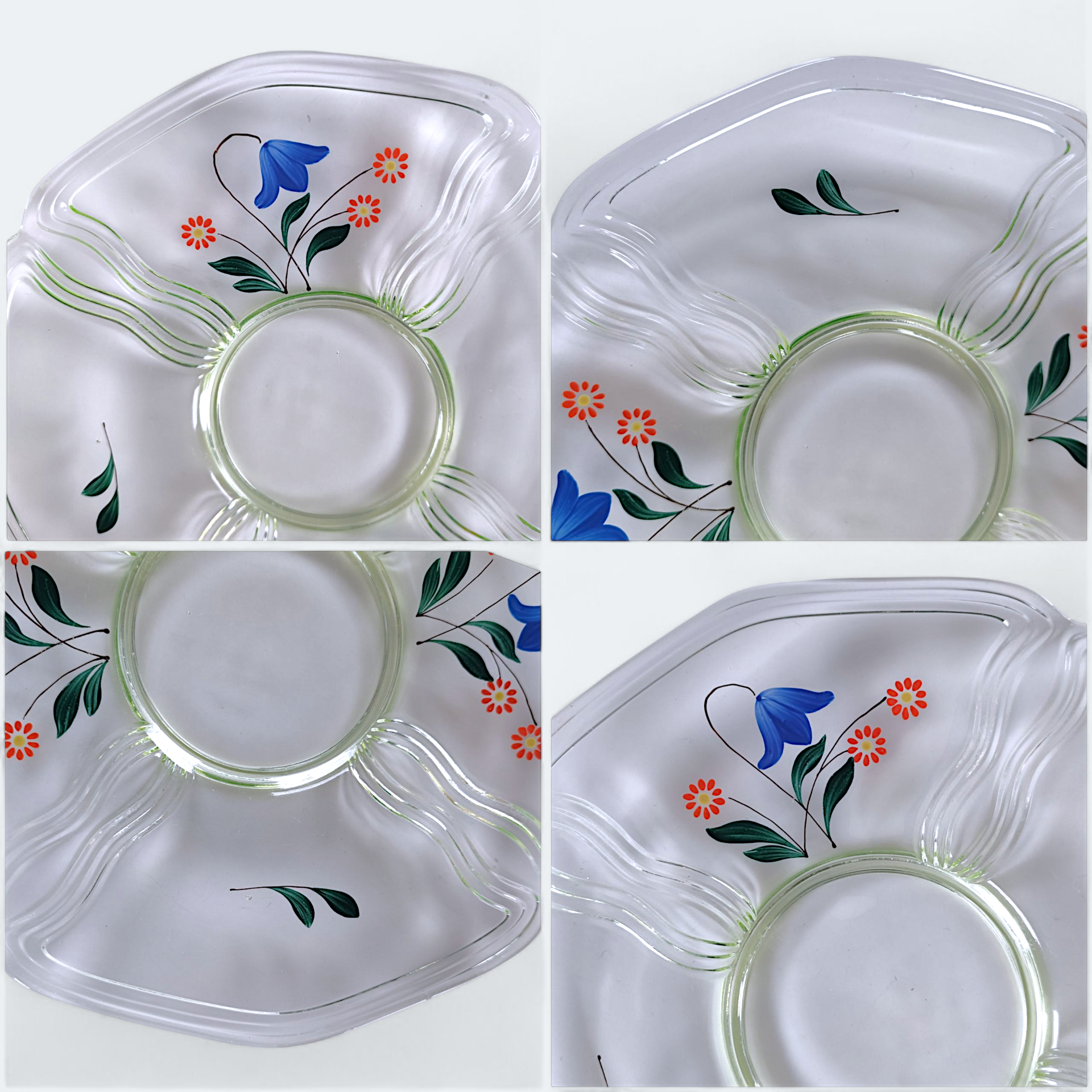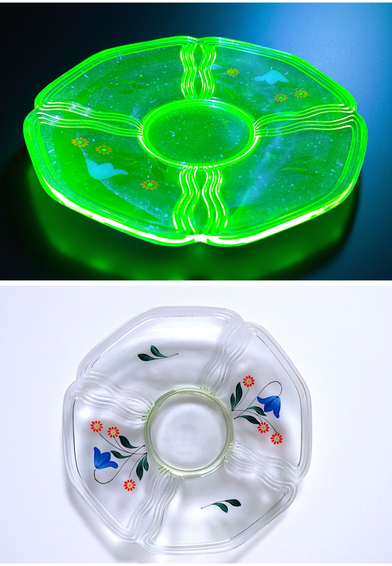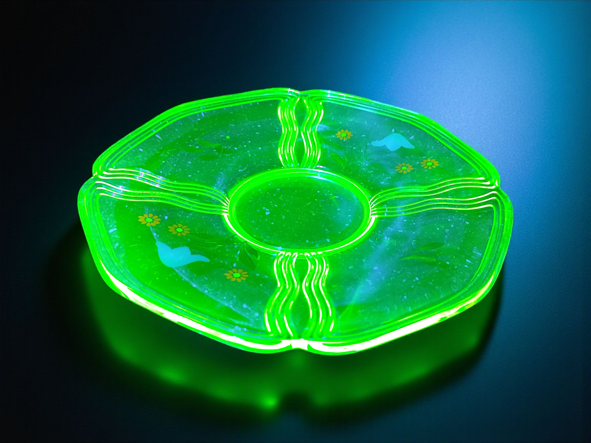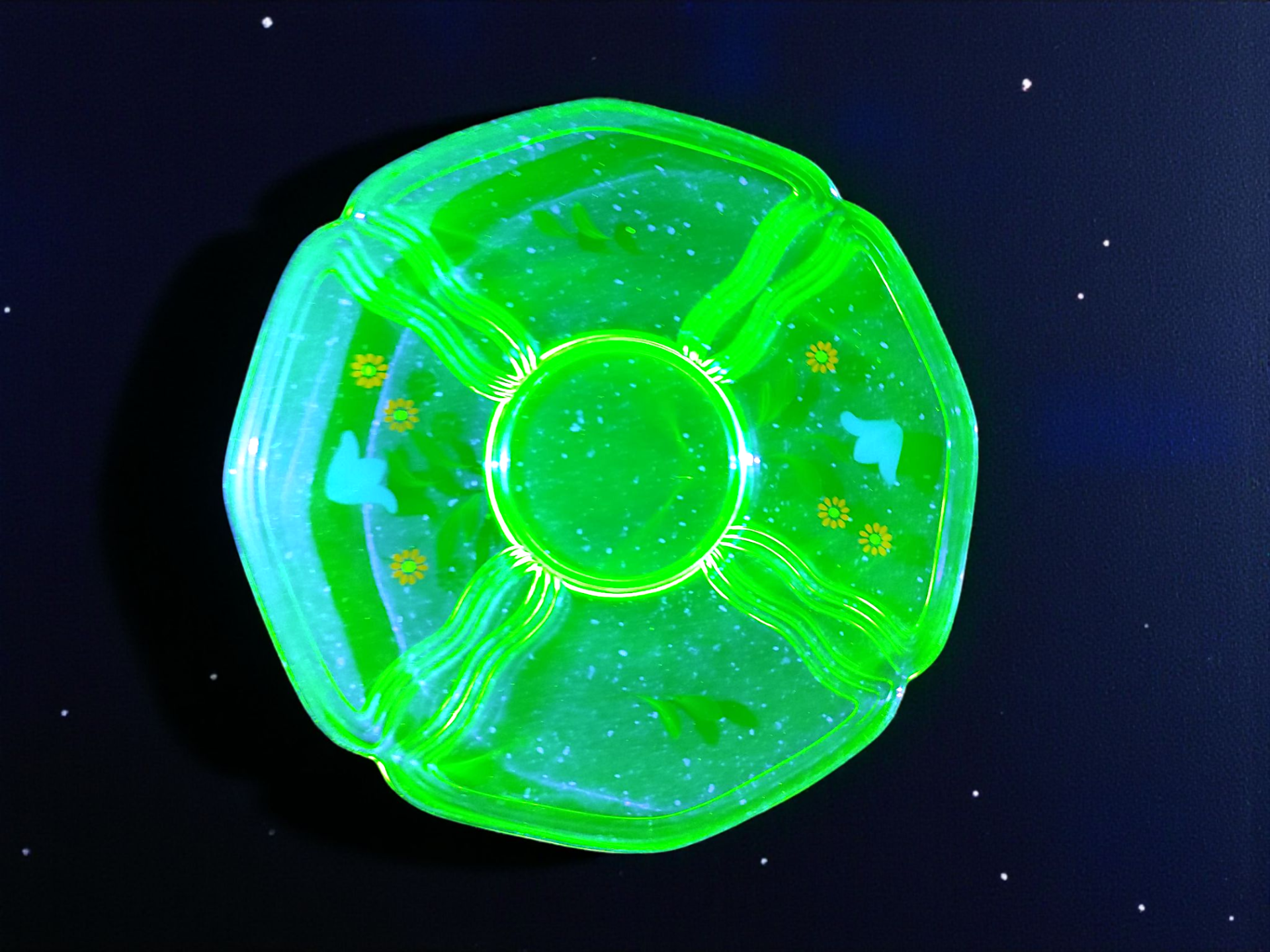 The dish is made of uranium glass, also known as vaseline glass.