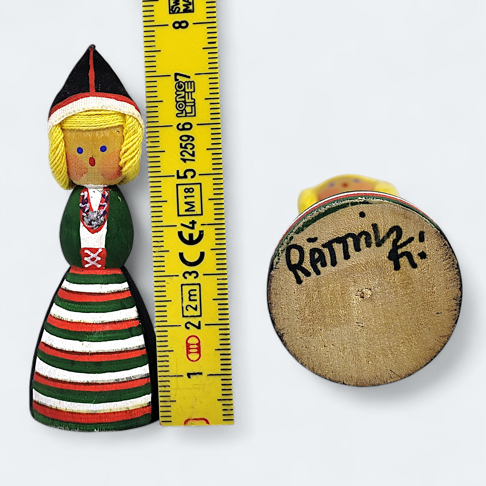 An older handmade wooden doll depicting a woman in traditional Rättvik folk costume. The doll is painted in detail with classic colors and patterns. Perfect as a decorative detail in the home or as part of a collection of folk art.