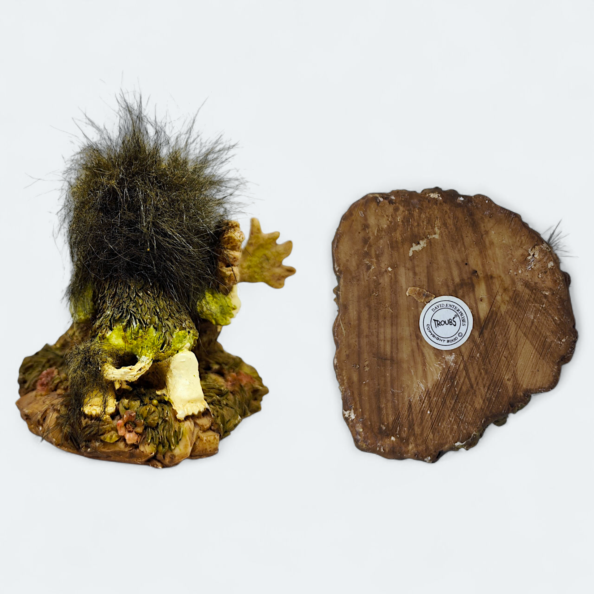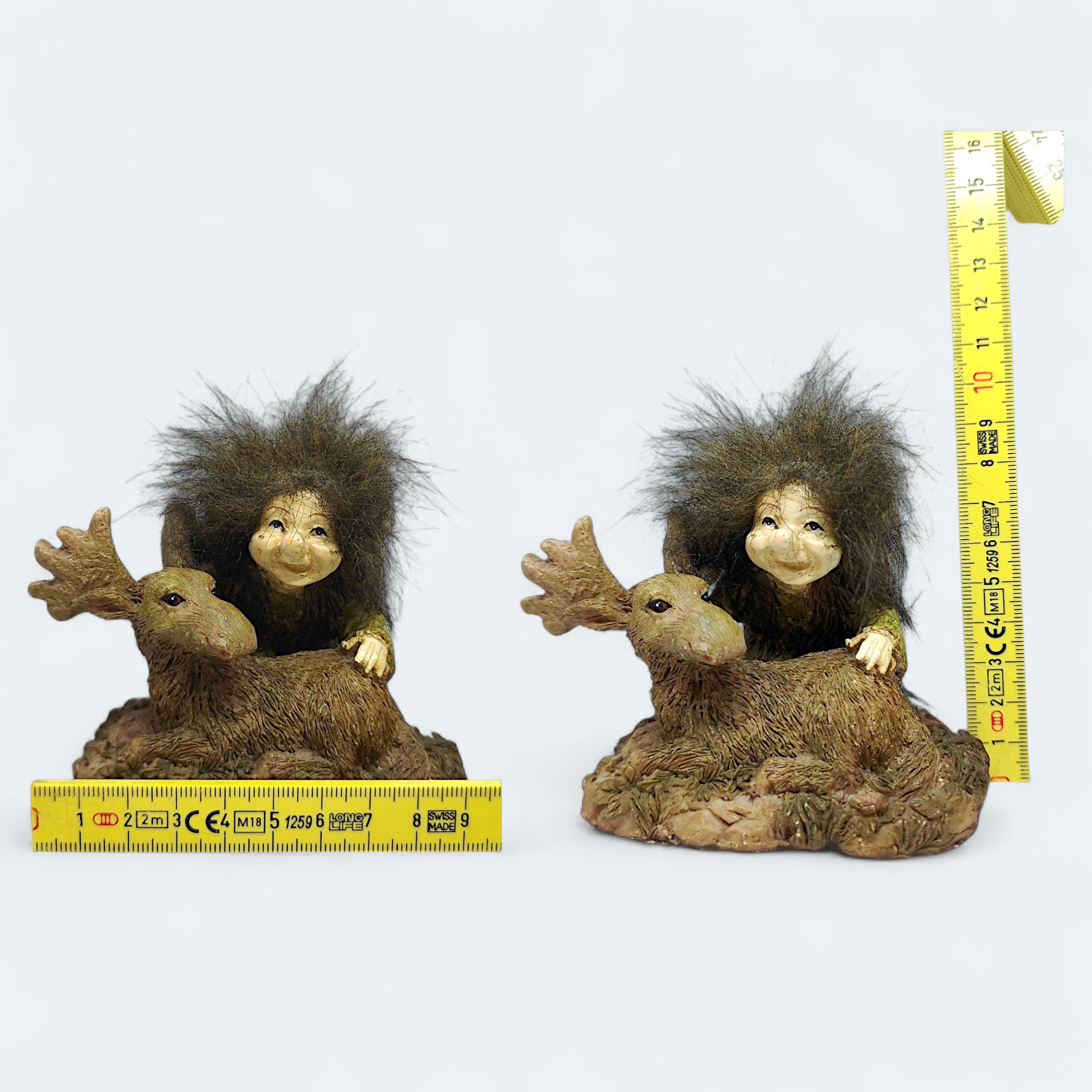 A troll figurine from David Enterprises Trolls Troubs. This figurine depicts a troll sitting behind a moose. Made of resin or resin-like material. Perfect for troll collectors or as a charming detail in the home.