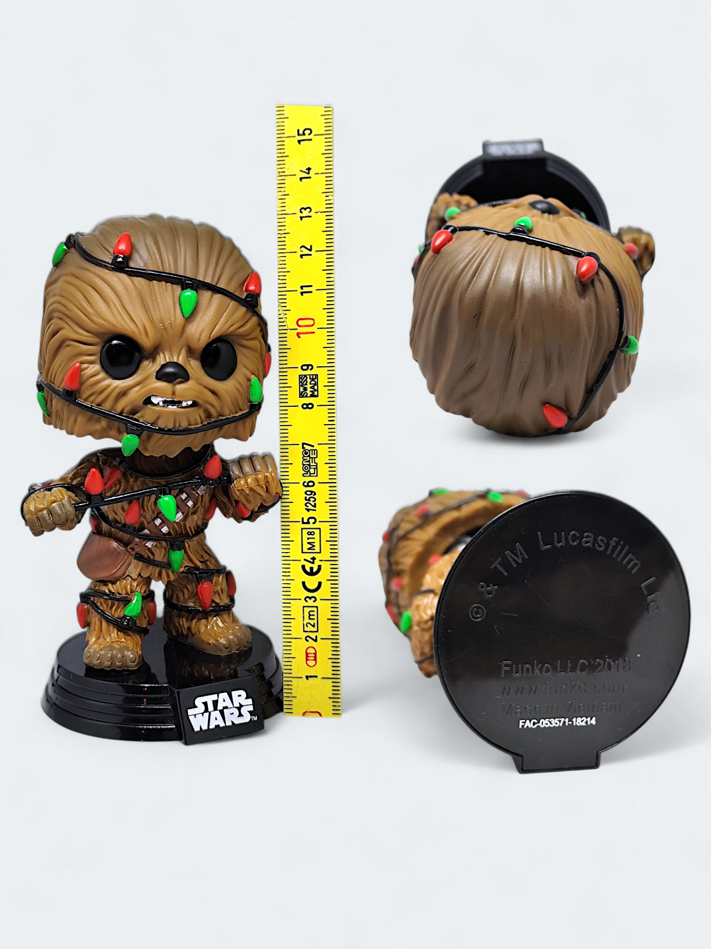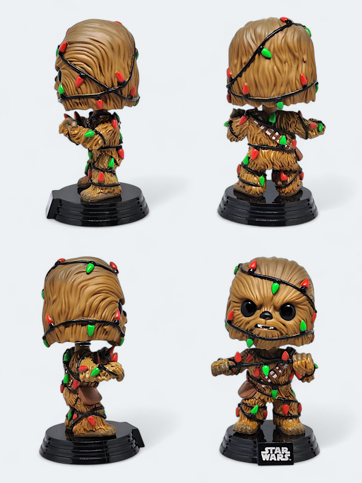 Funko Pop figure depicting my favorite Star Wars character, Chewbacca. Here it is in a Christmas theme wrapped in Christmas tree lights.