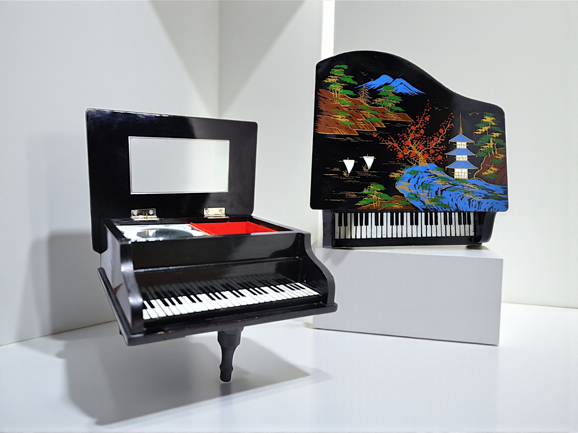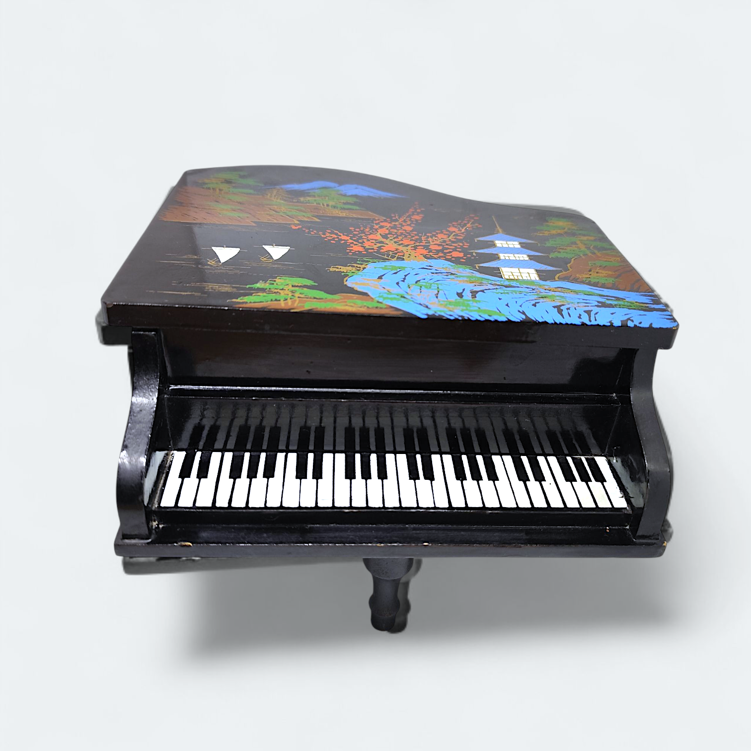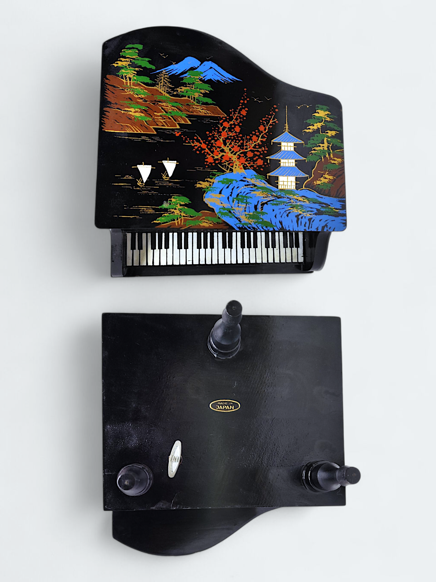 A vintage 70s wooden music box/jewelry box, depicting a black piano. Made in Japan. The jewelry box has a compartment with a mirror. It is decorated with a hand-painted image depicting a mountain in Japan, trees and a pagoda. The image is also decorated with mother-of-pearl inlays.