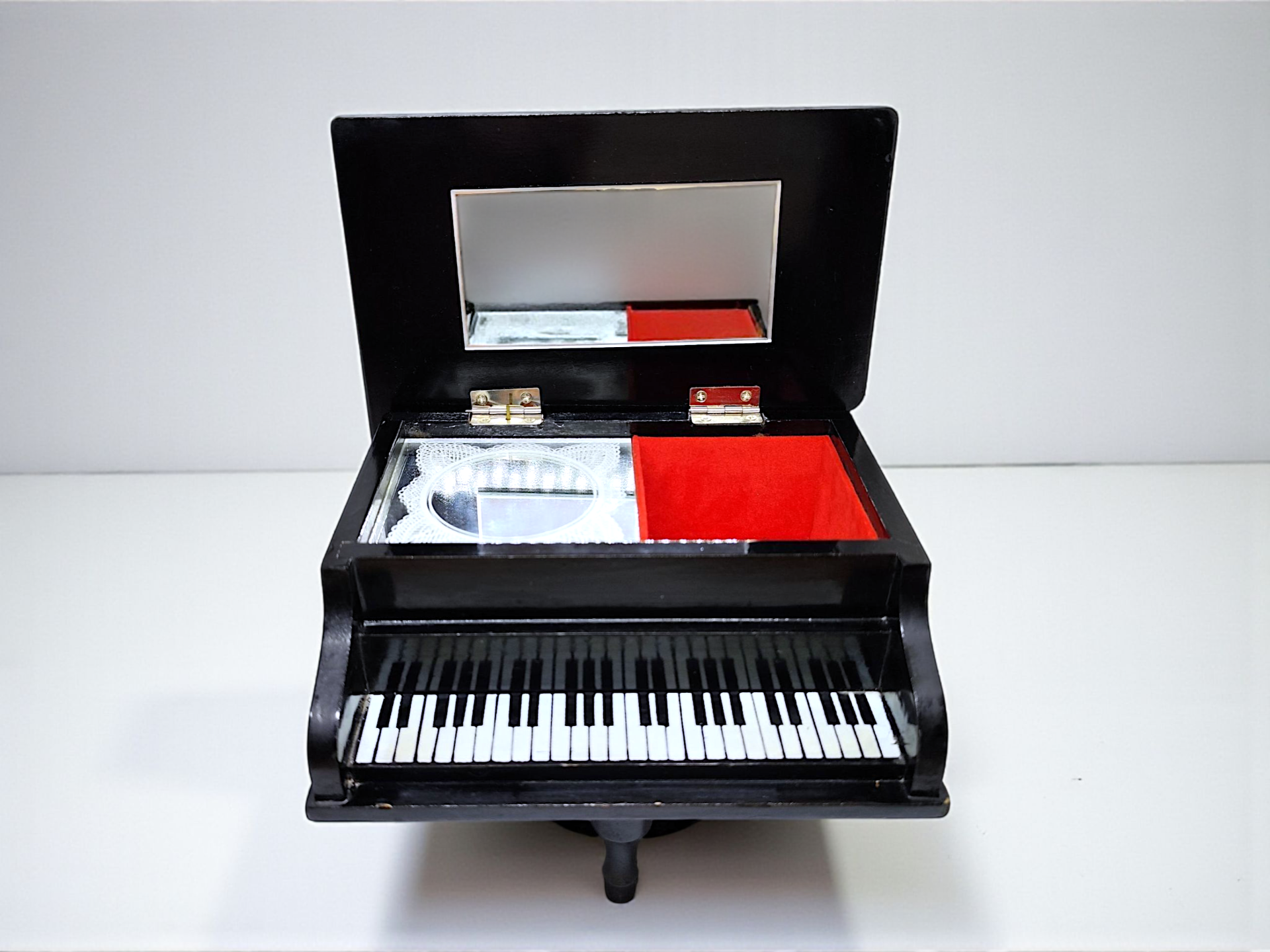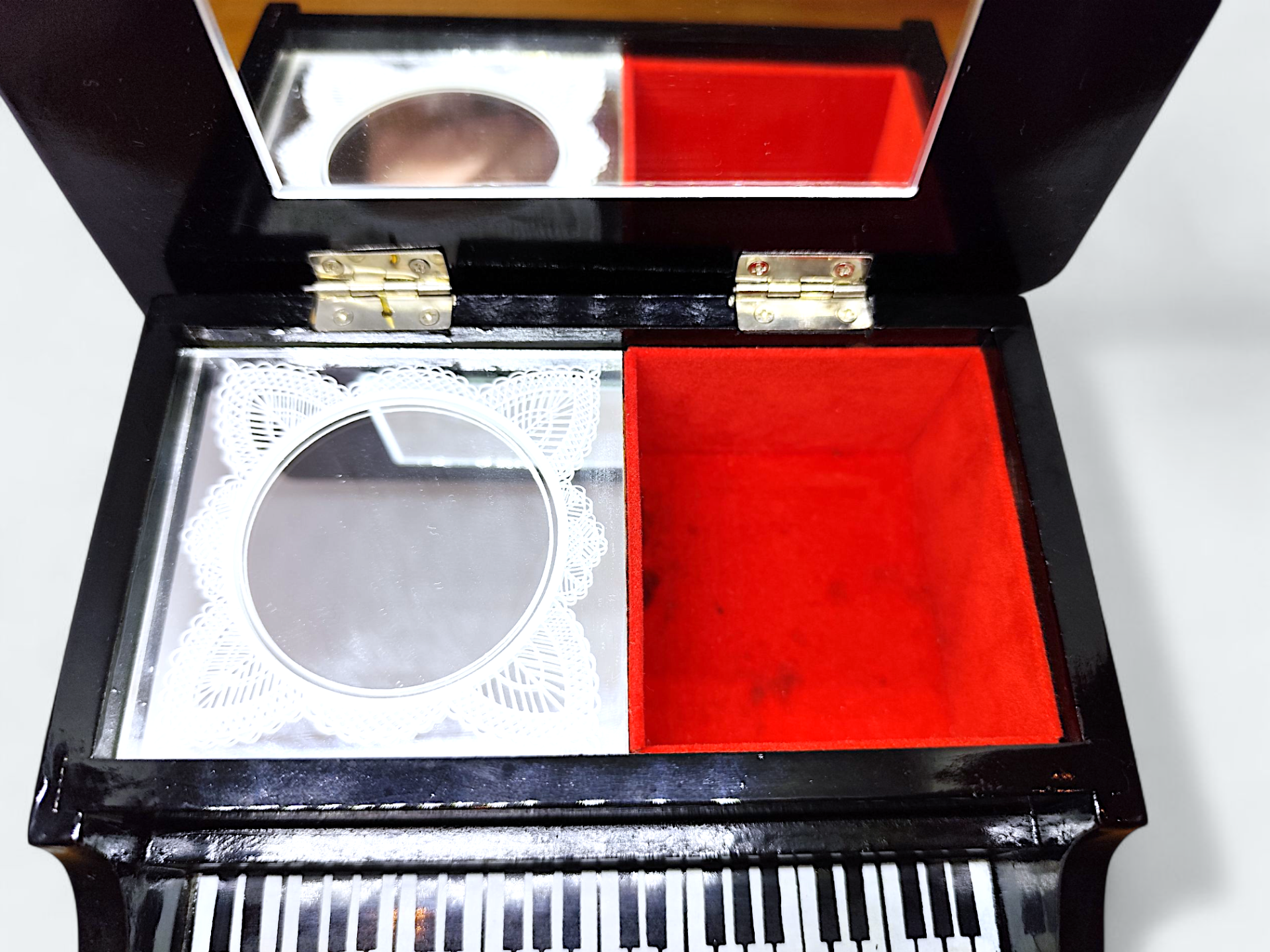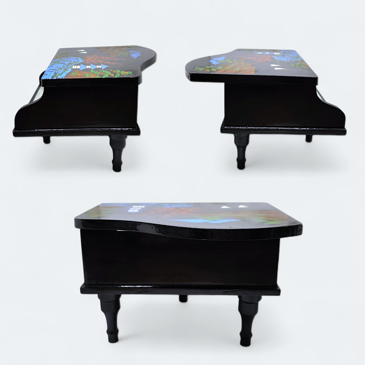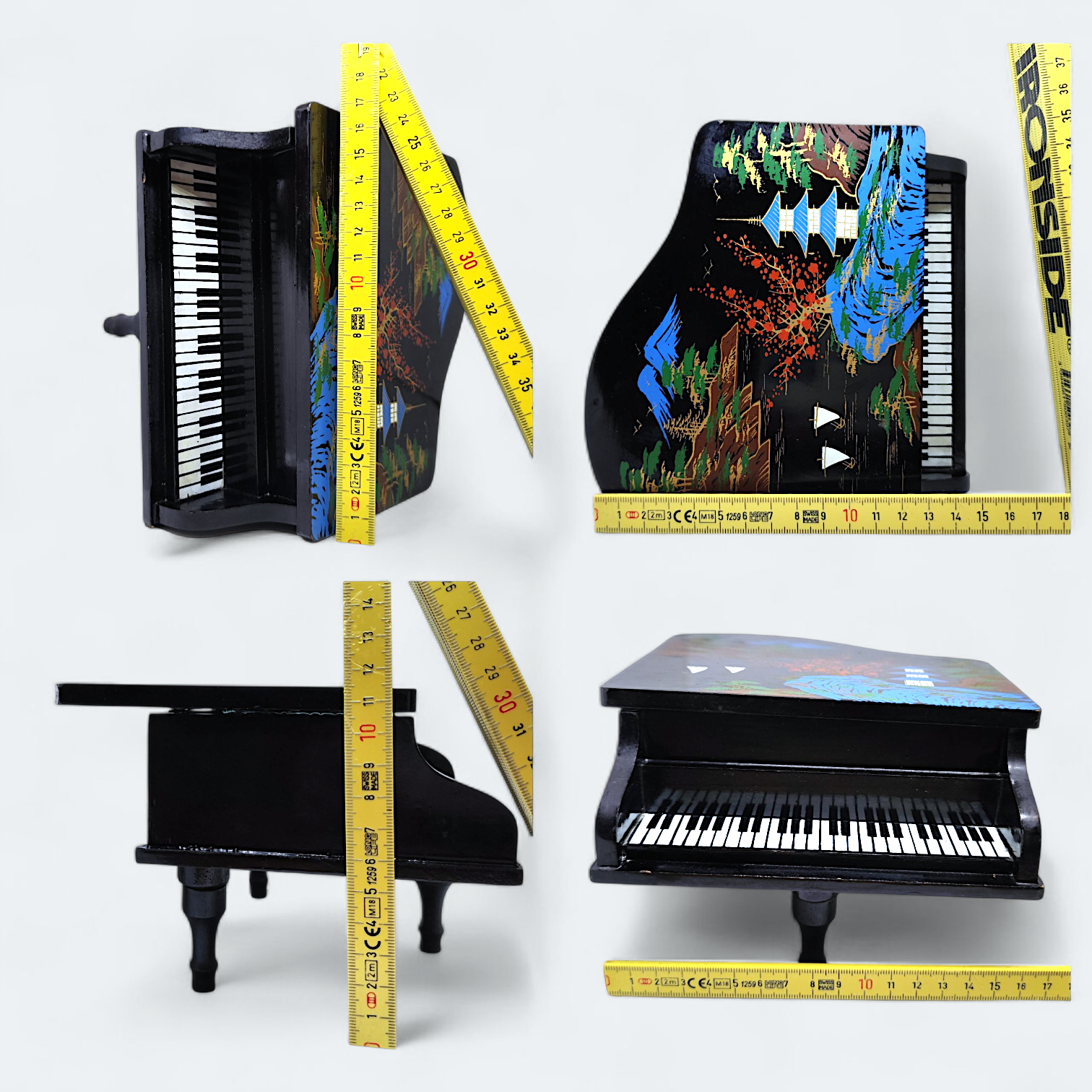 A vintage 70s wooden music box/jewelry box, depicting a black piano. Made in Japan. The jewelry box has a compartment with a mirror. It is decorated with a hand-painted image depicting a mountain in Japan, trees and a pagoda. The image is also decorated with mother-of-pearl inlays.