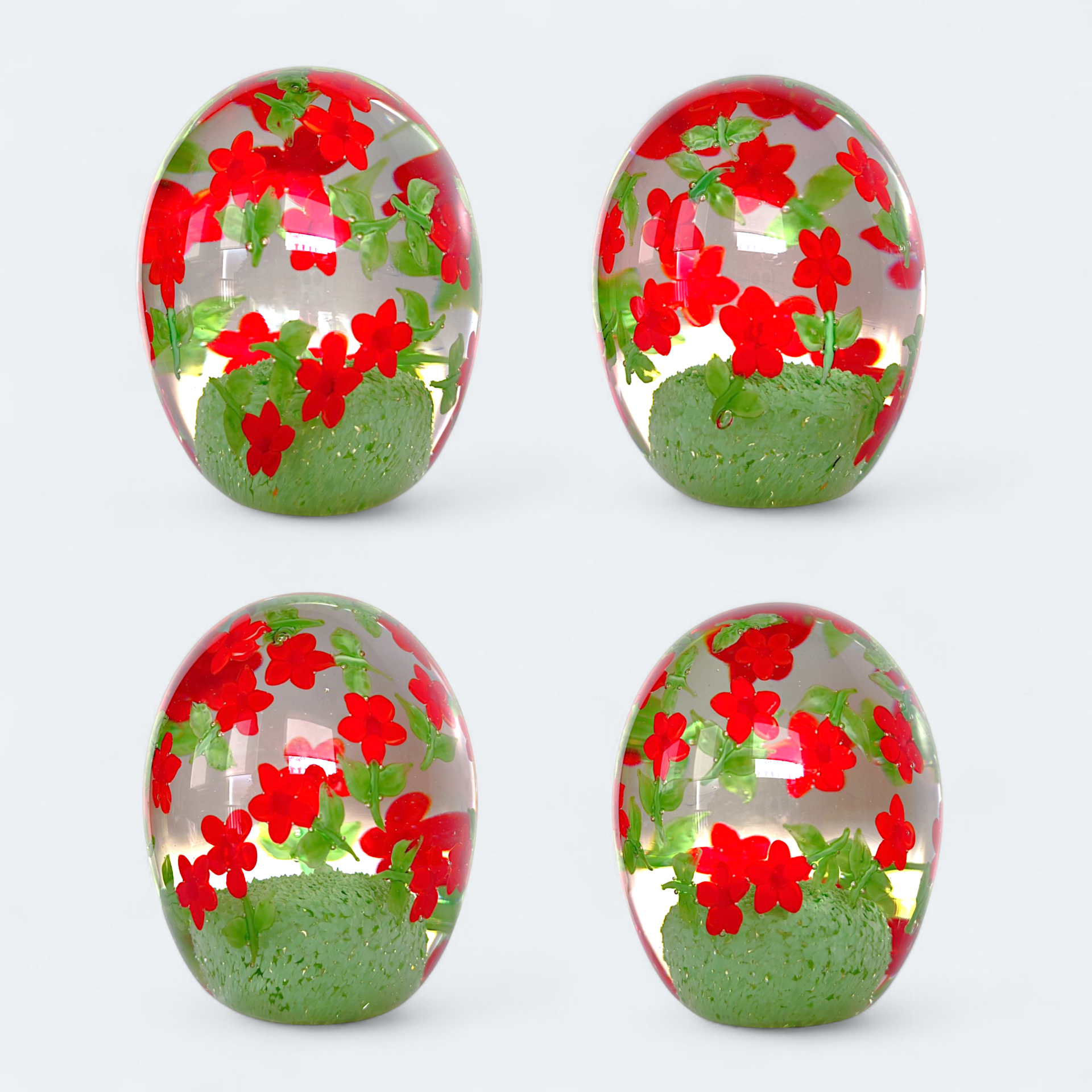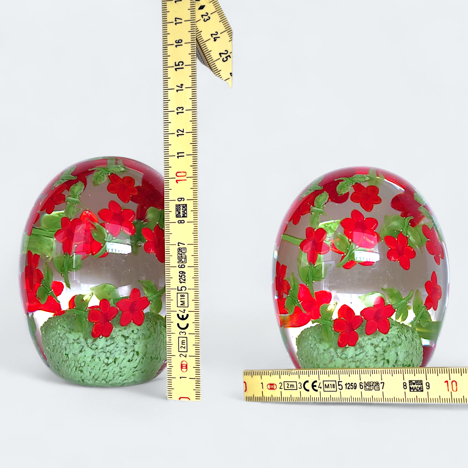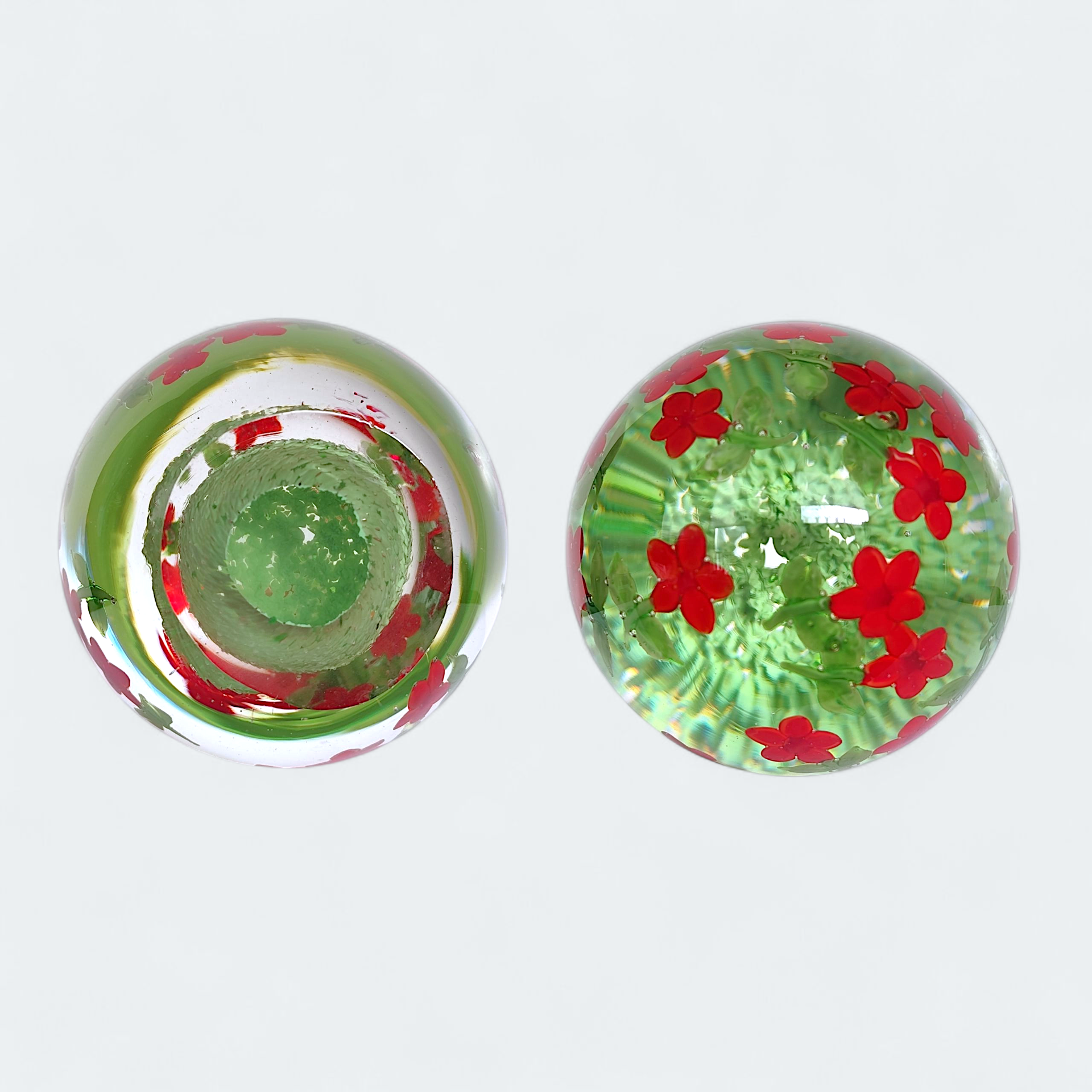 Handmade large glass paperweight with floral decorations captured in a glass ball. A nice and clean addition to any paperweight collection. Made in the 60s-70s.