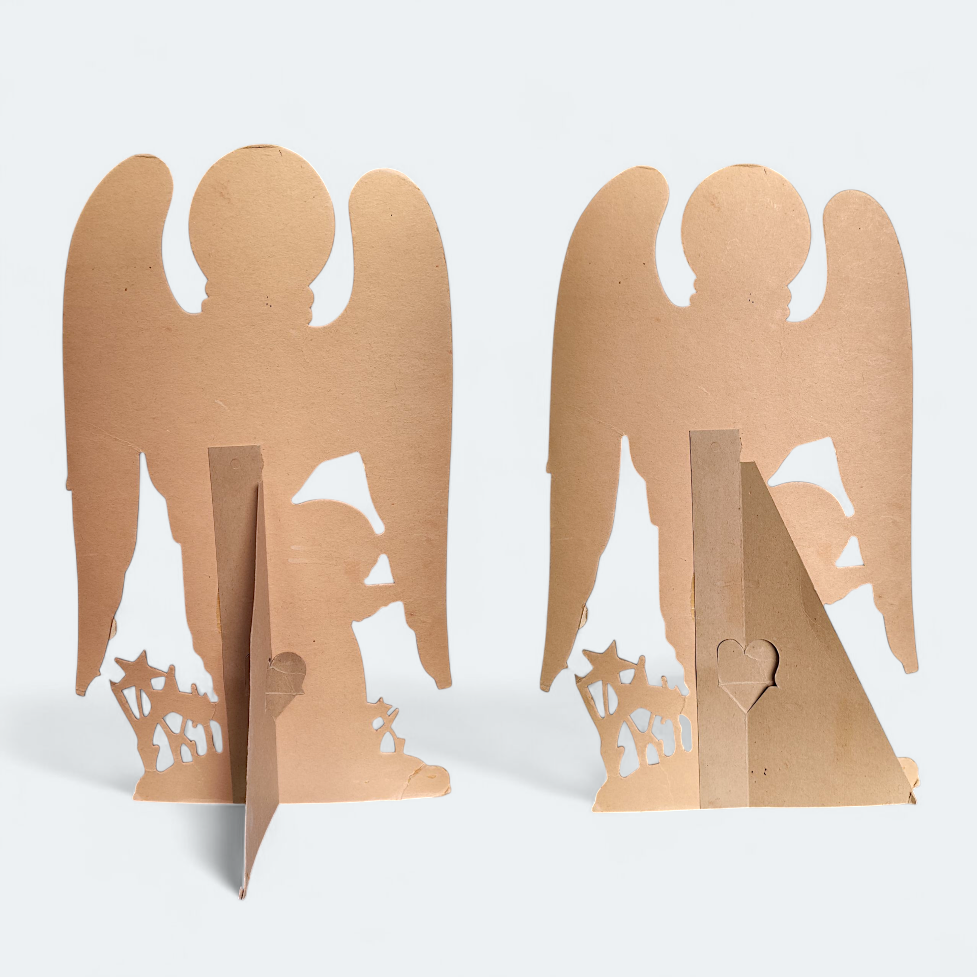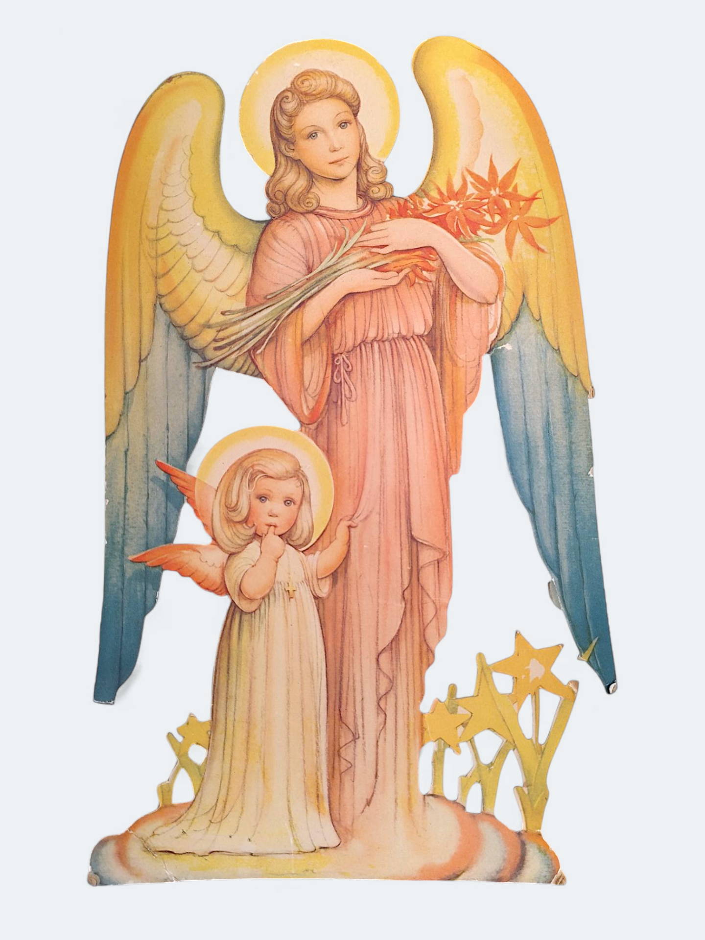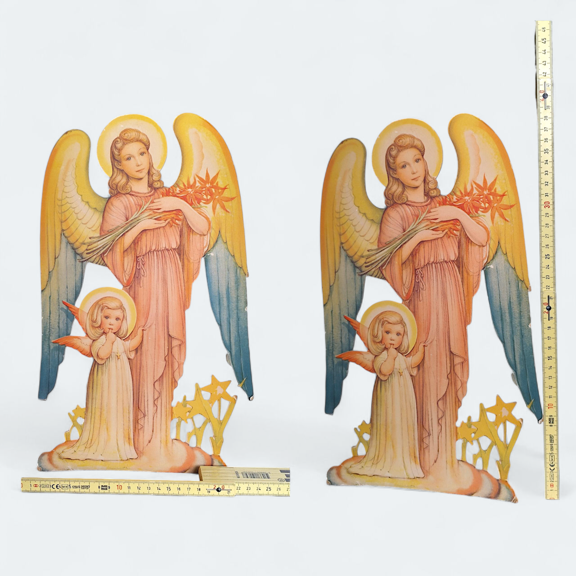 Rare antique angel with angel child. Made of cardboard with support on the back. Made in the first part of the 20th century. Resembles a large bookmark.