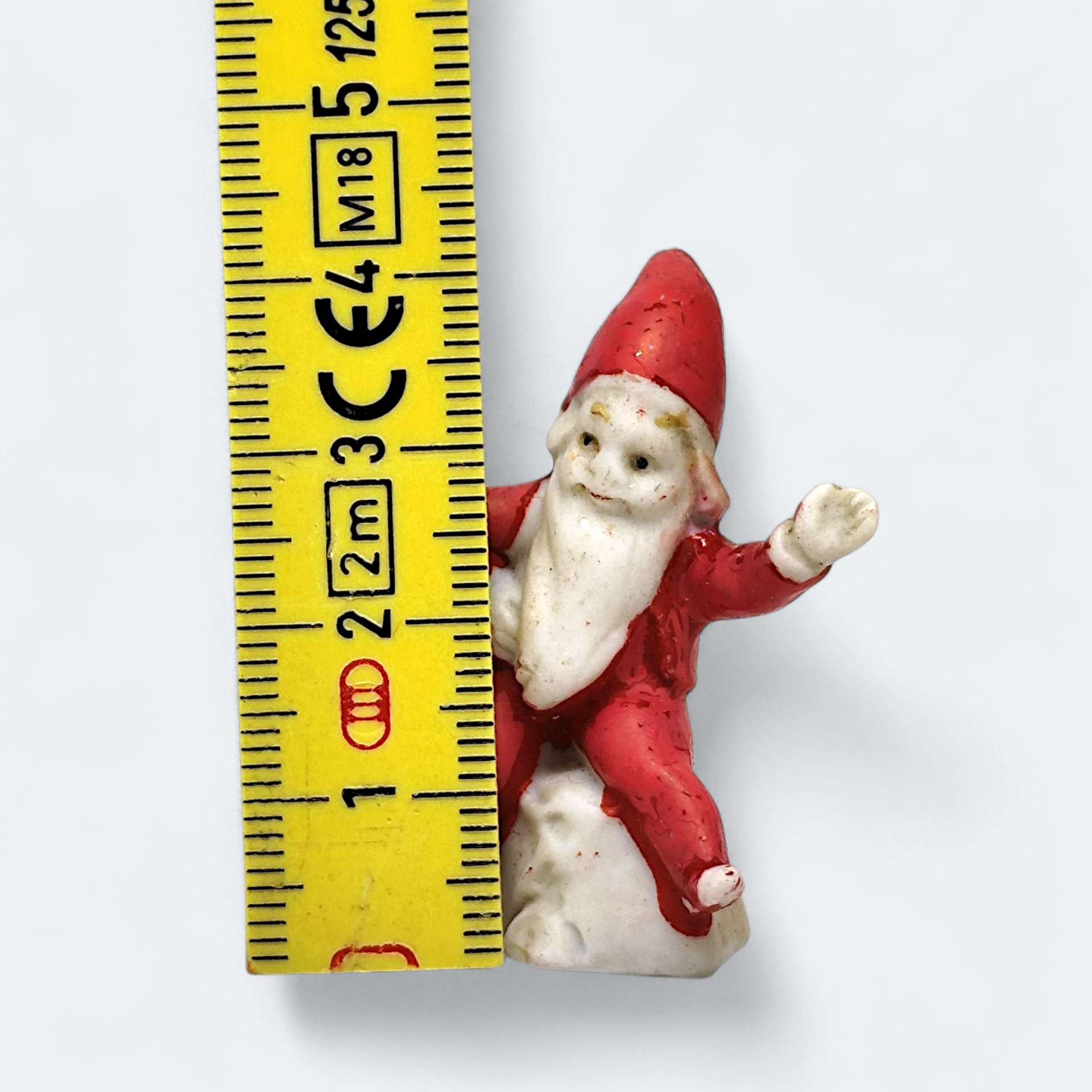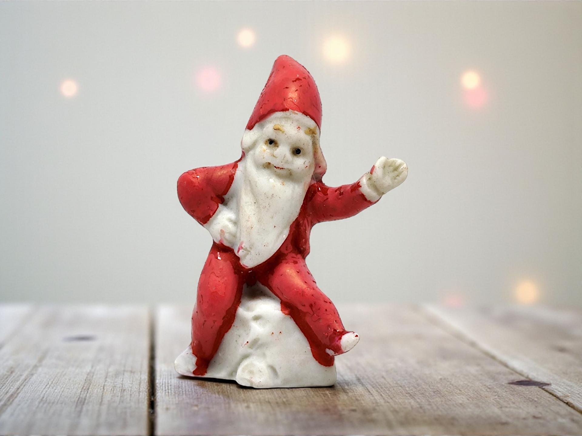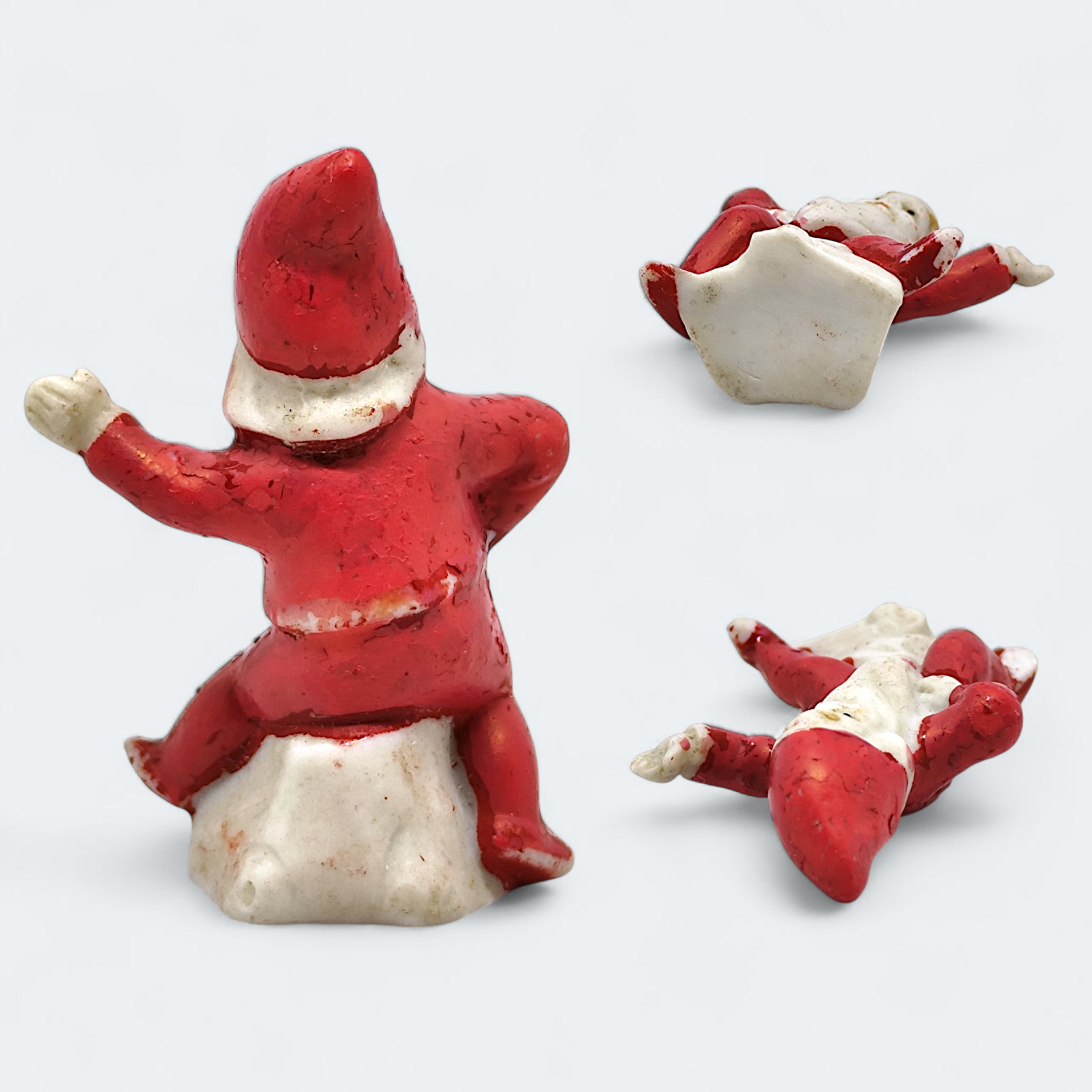 A vintage miniature German Santa Claus figure sitting on a rock. Made of porcelain in the first half of the 20th century. Perfect for Christmas decoration.