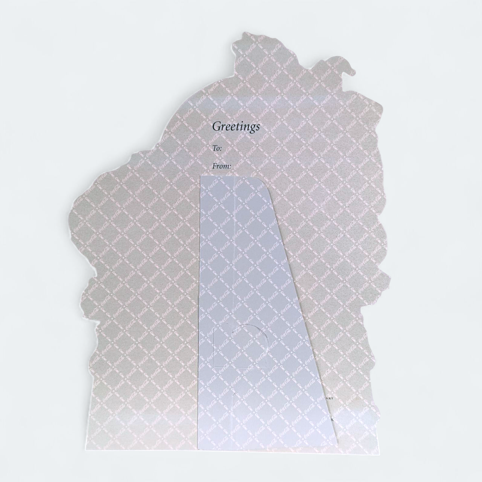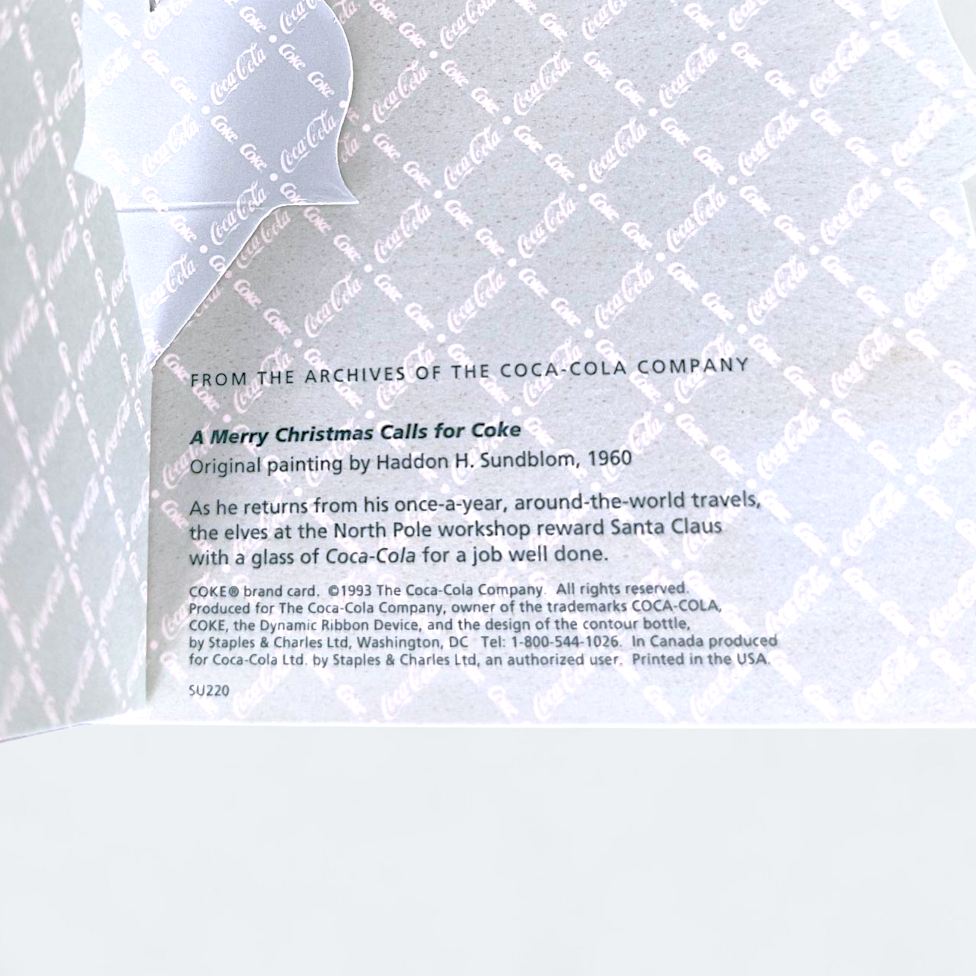 Coca-Cola Stand-ups card from 1993. The card is from The Archives of the Coca-Cola Company. The motif is a painting by Haddon H. Sundblom from 1960, depicting Santa Claus with Coca-Cola and elves.