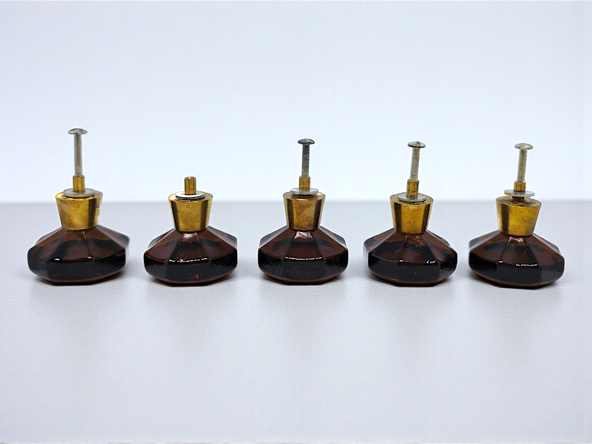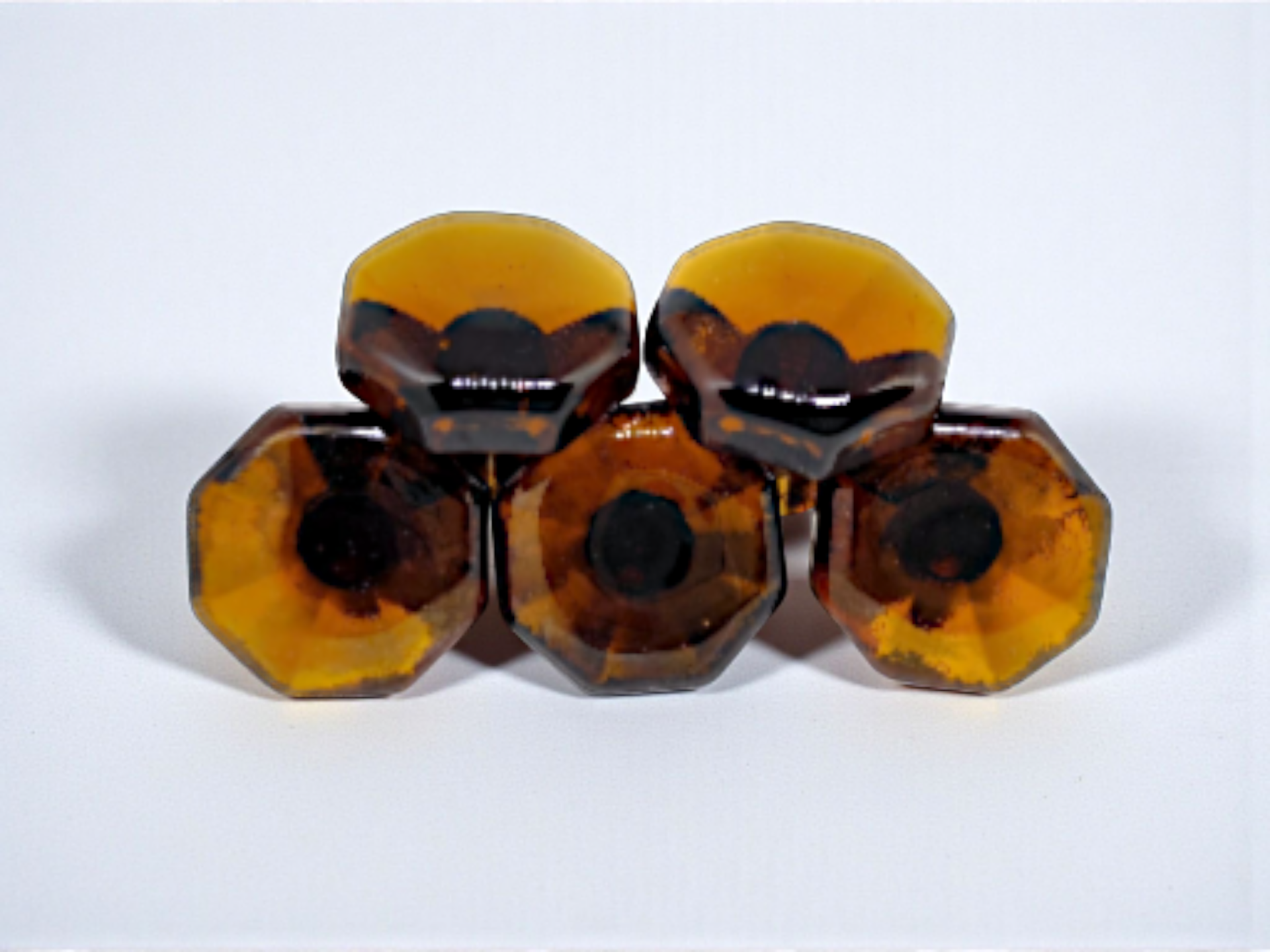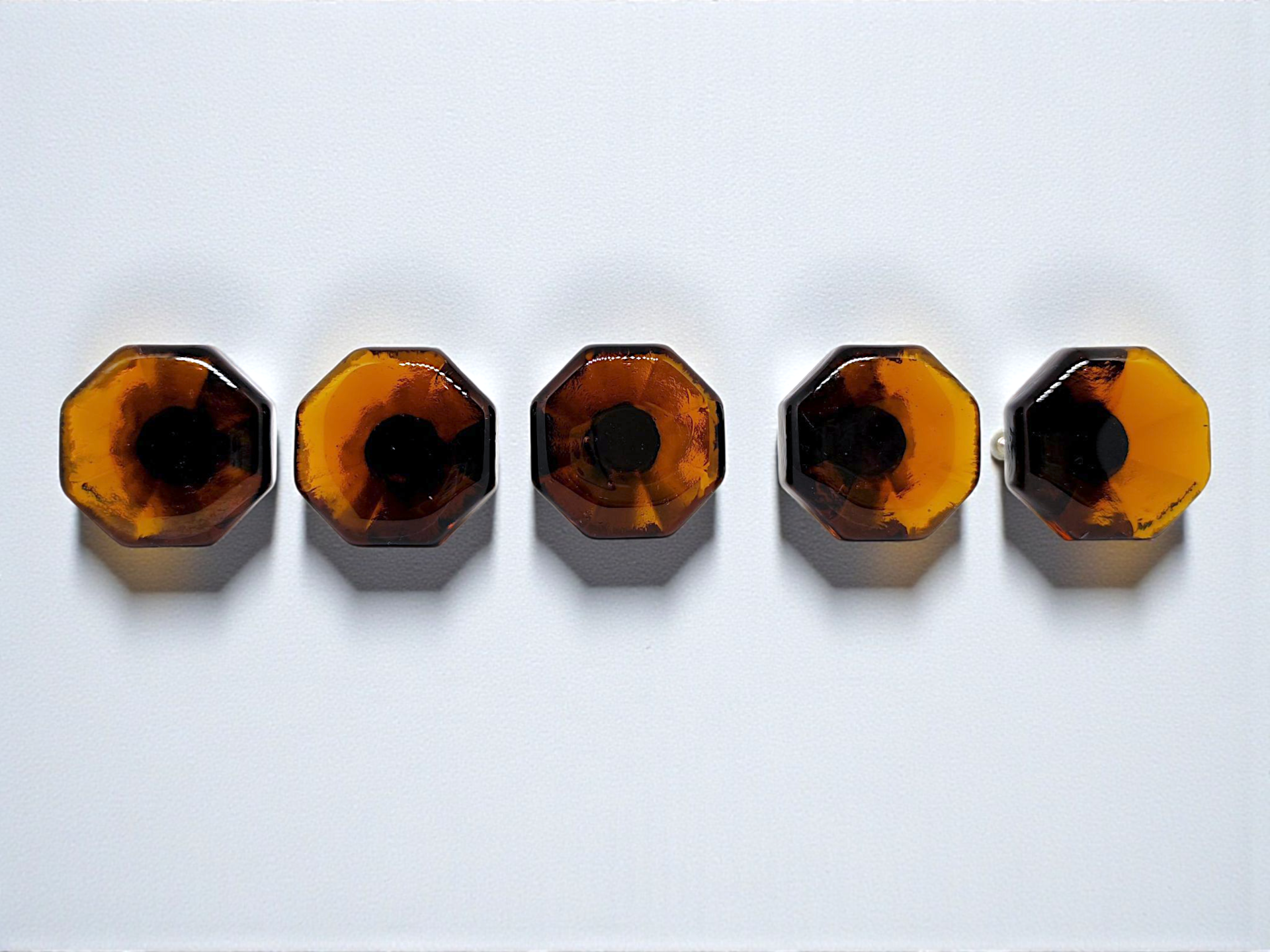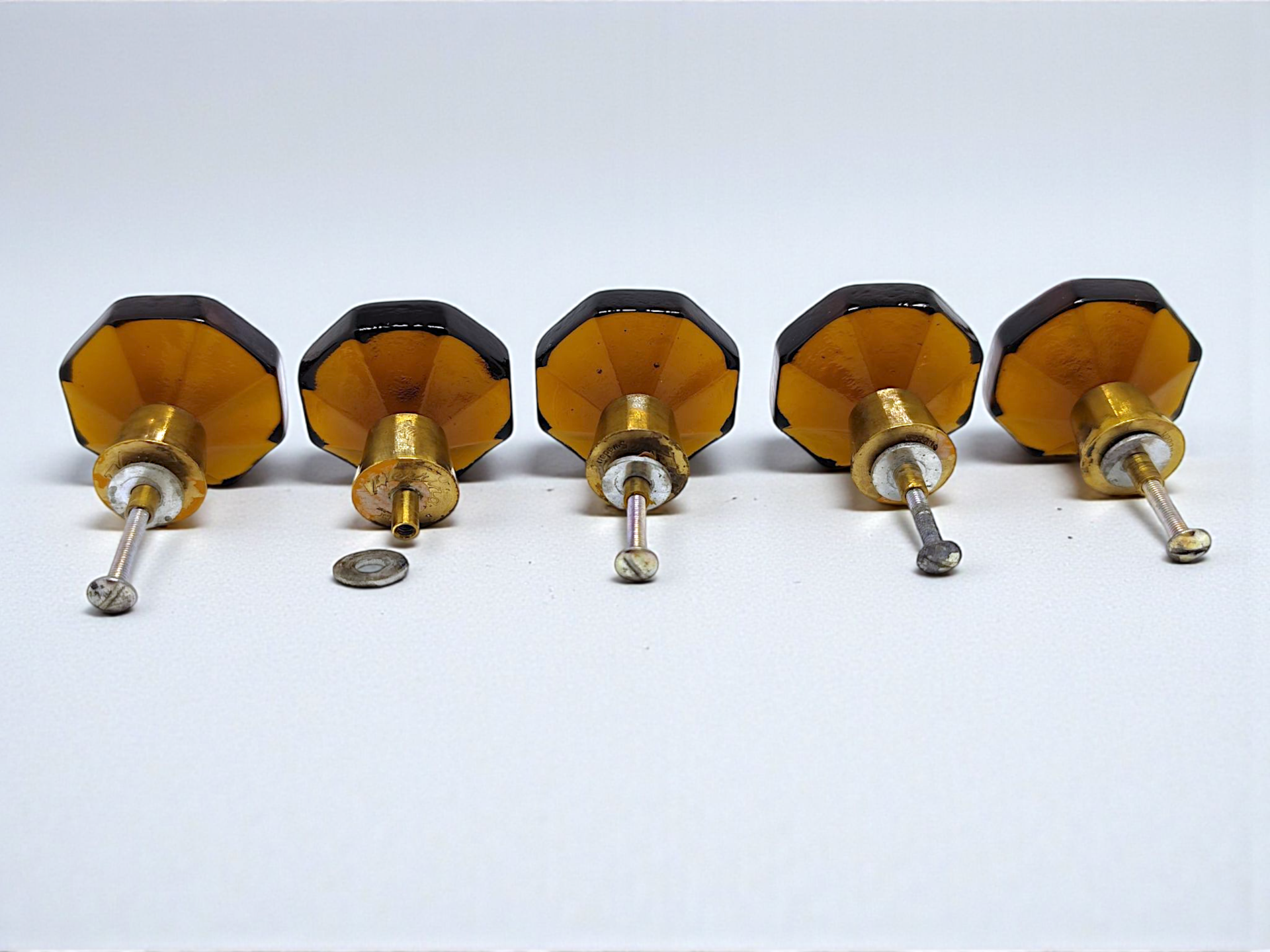 Five hexagonal shaped amber glass knobs/handles. These are often used as fittings for furniture, cabinets and drawers.