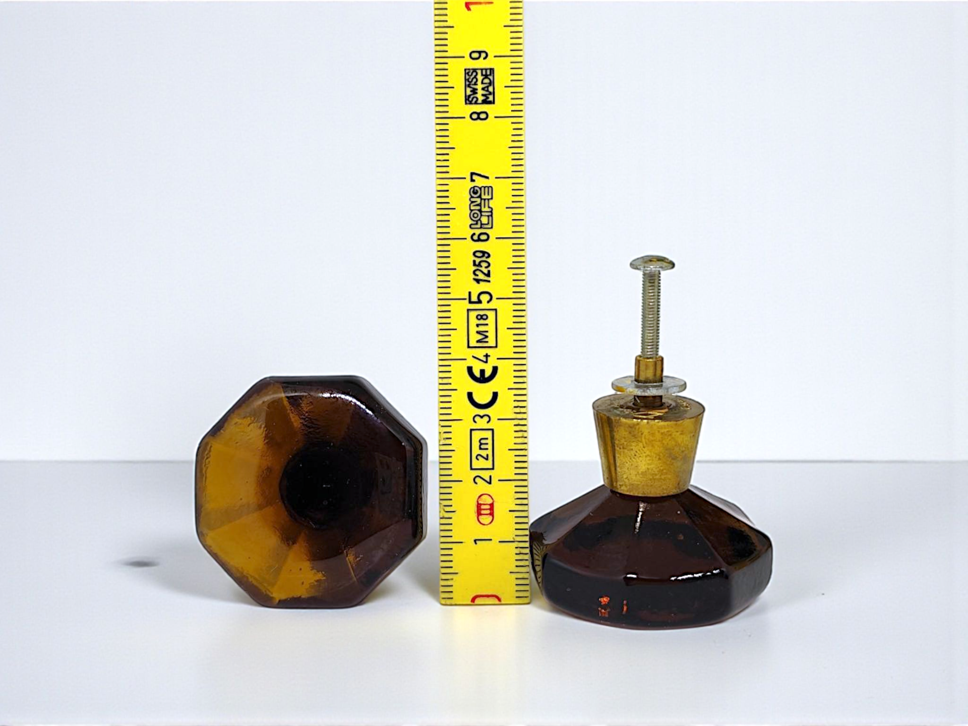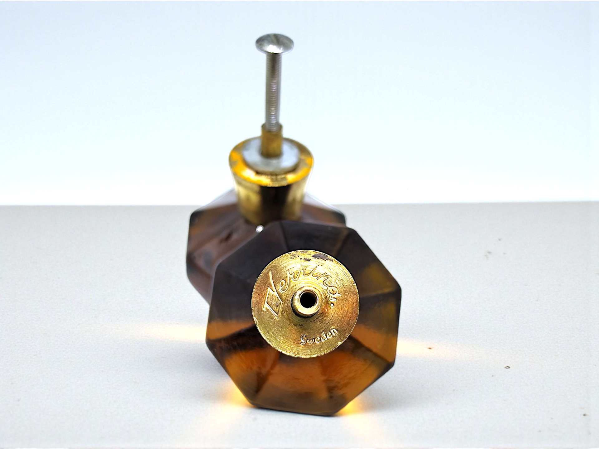 Amber glass is made by mixing sulfur, iron and carbon in the glass formula. Marked with Verrina Sweden. The handle of the knobs is made of brass. Made in the 60s.