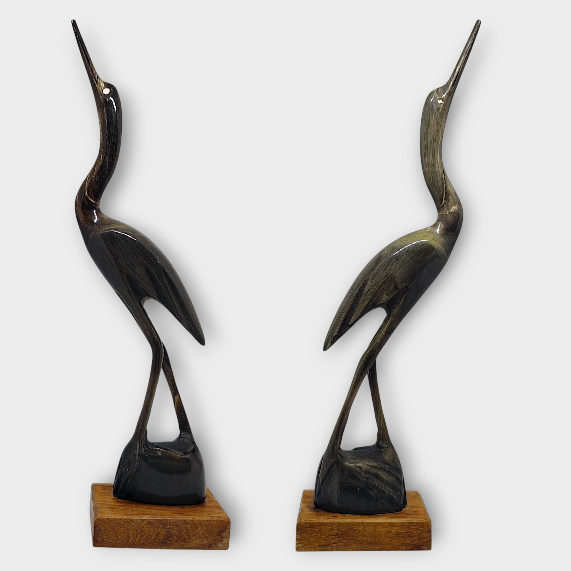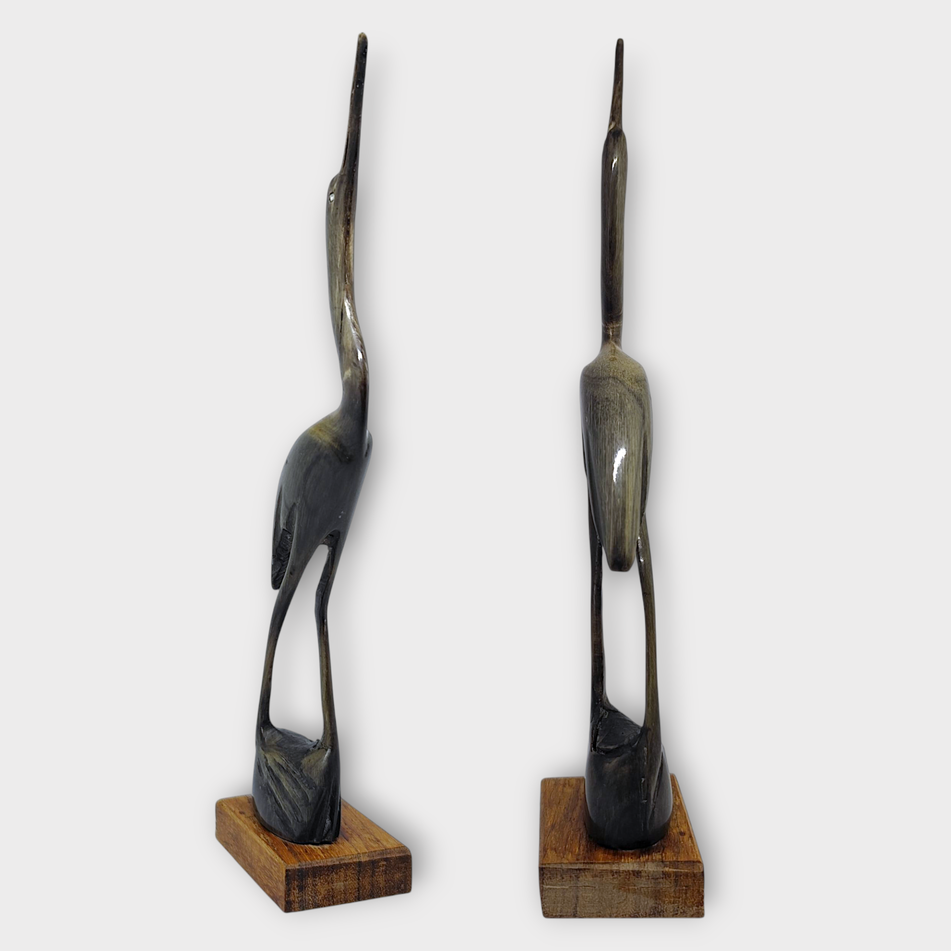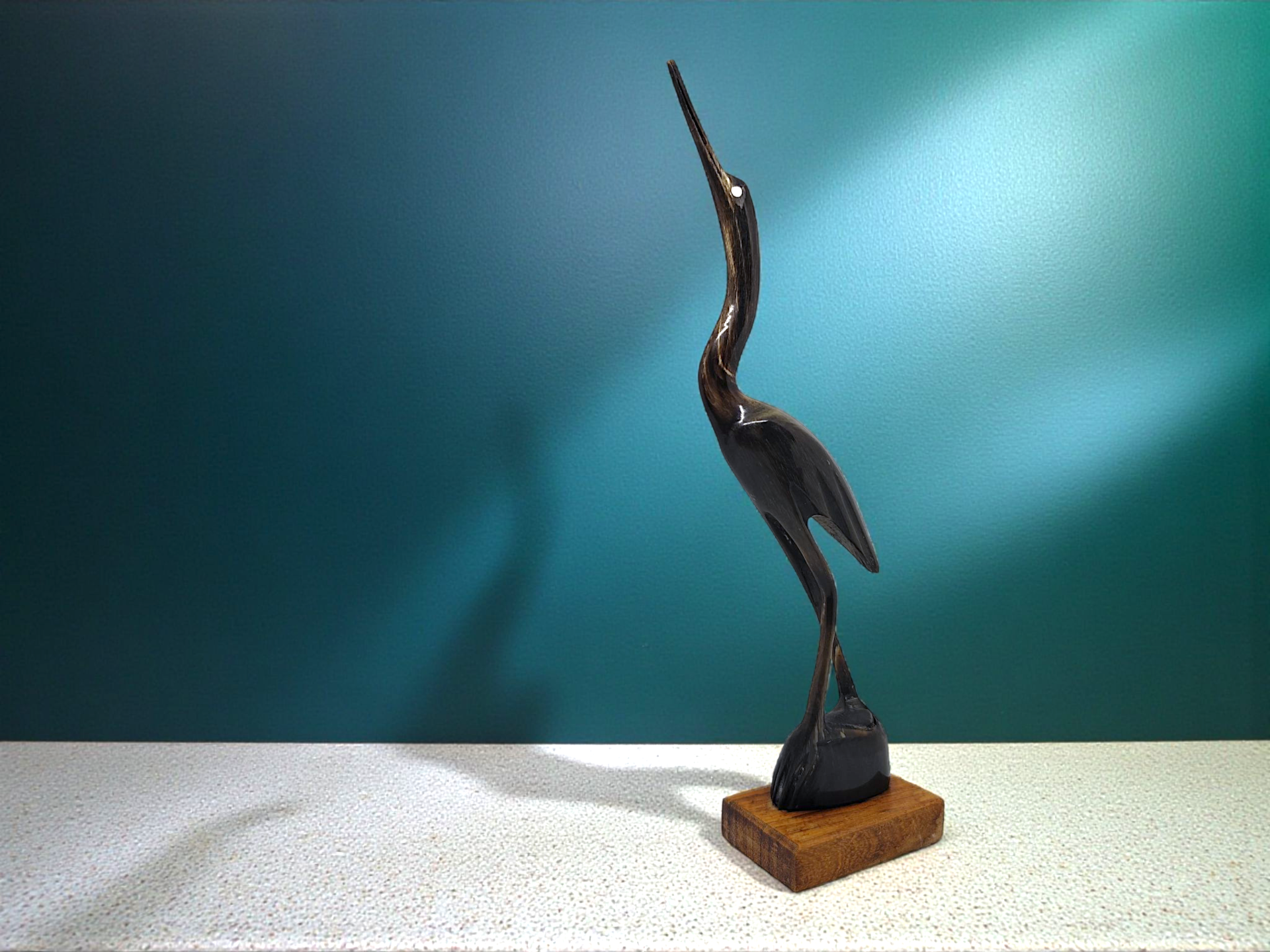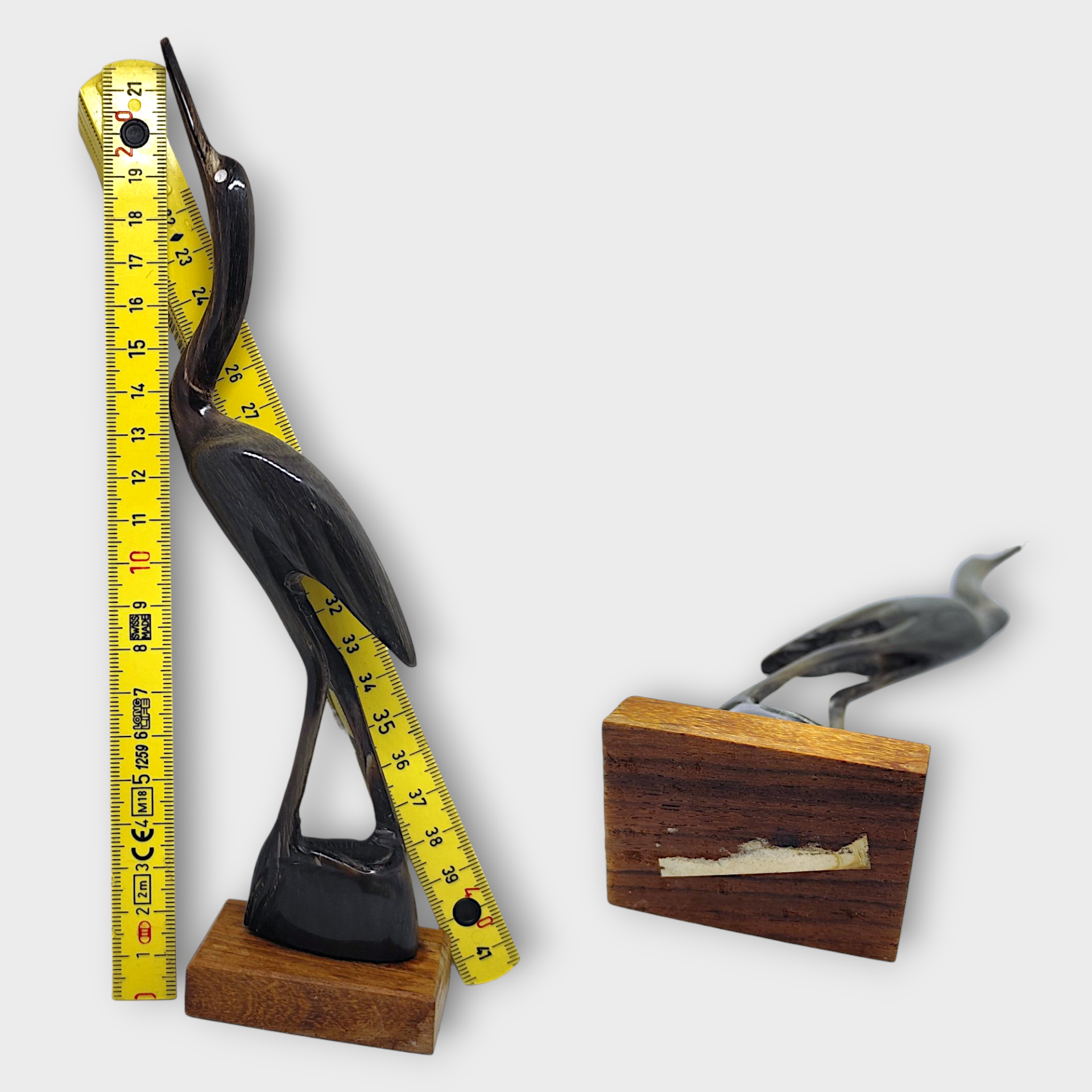Handmade bird sculpture depicting a crane. Made of water buffalo horn and wood. Made in the 60s. Unsigned and unmarked.