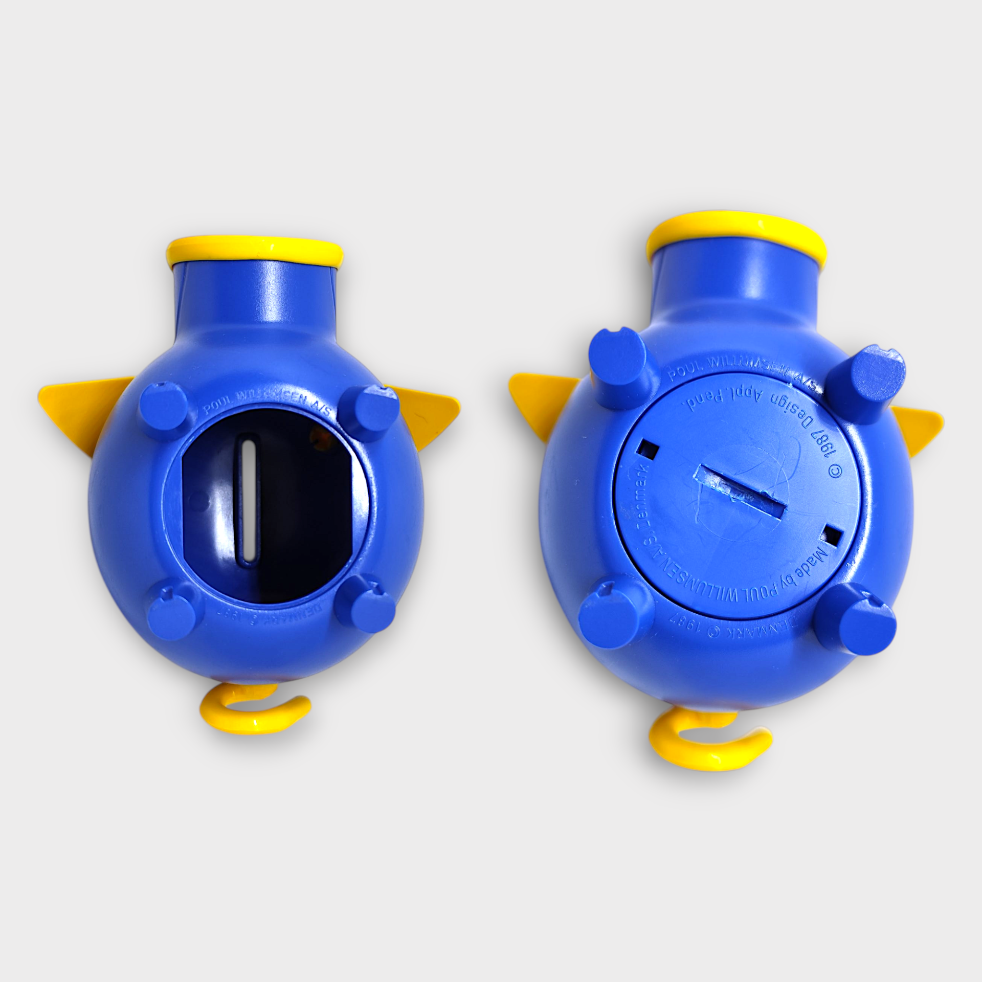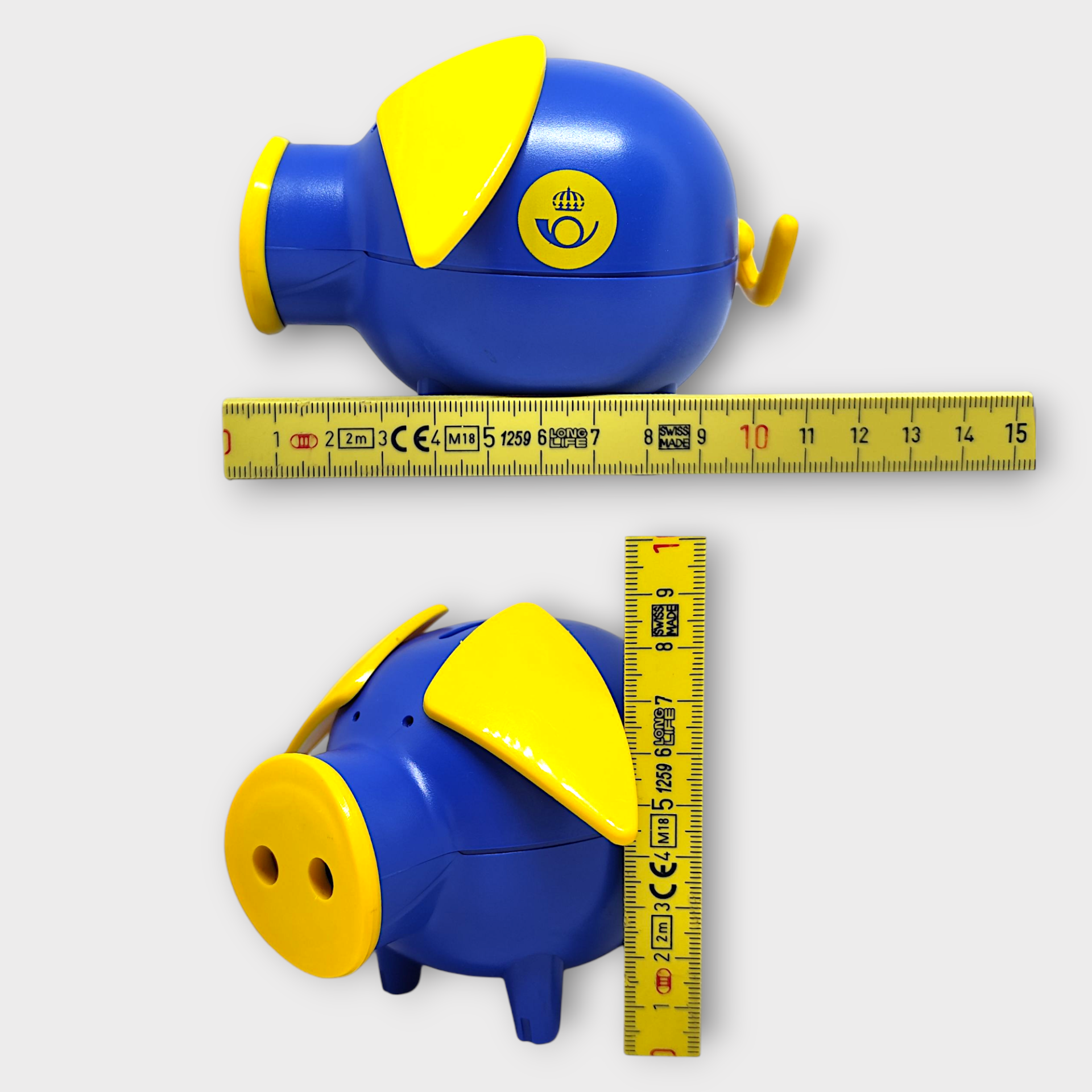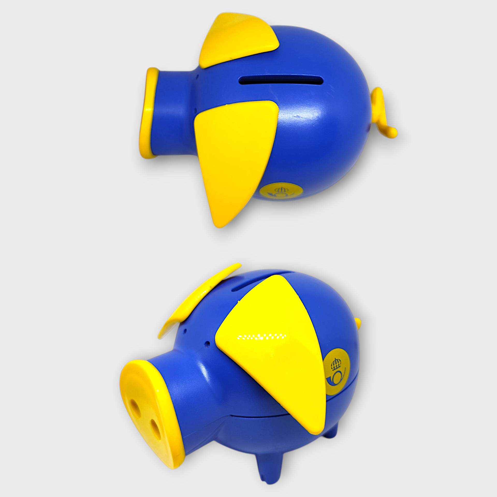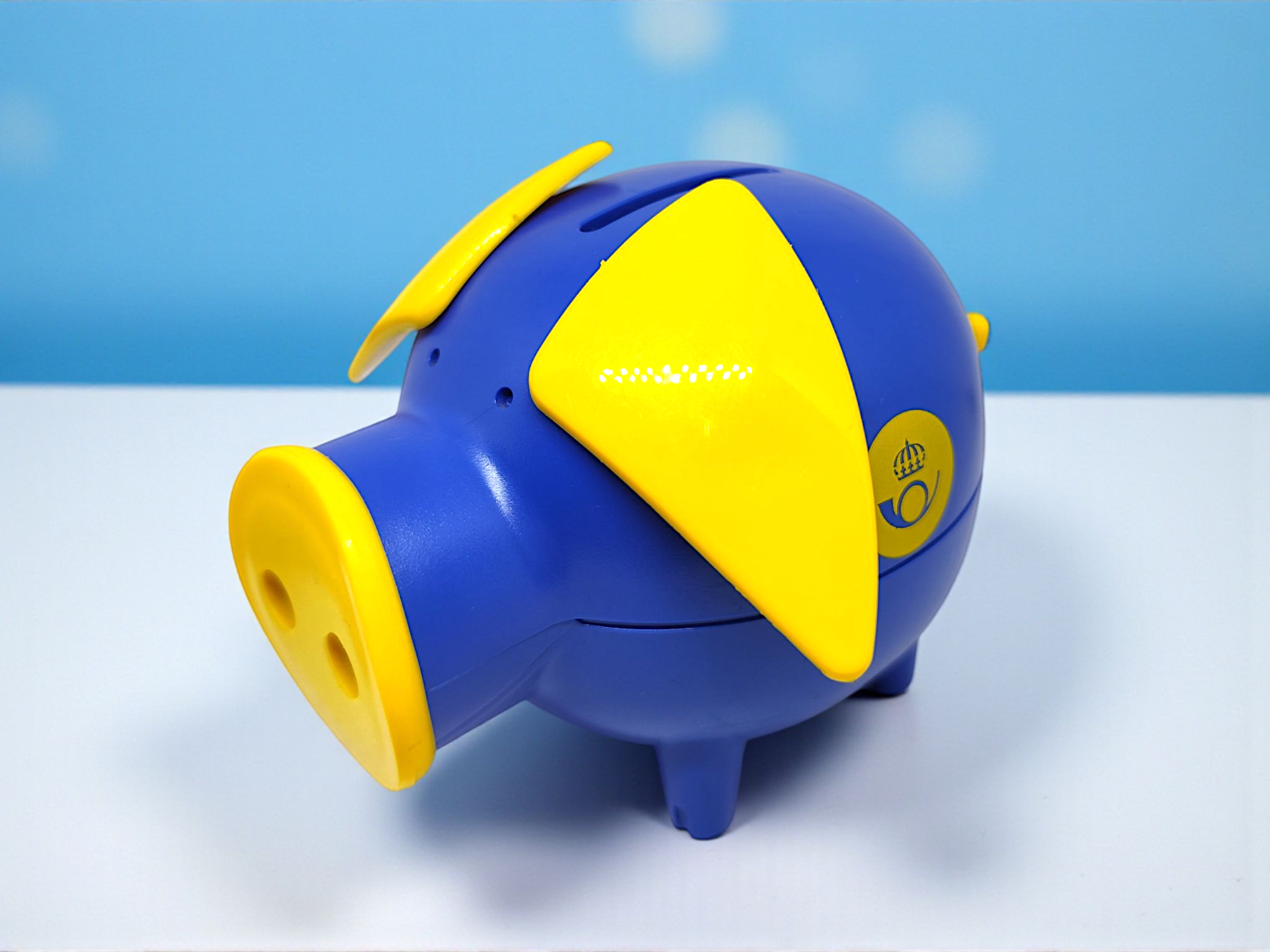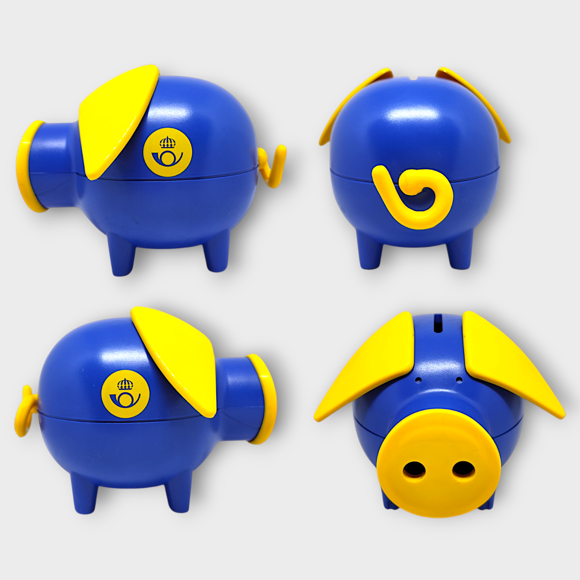 A vintage plastic piggy bank from 1987. Design Appl Pend. Made by Poul Willumsen Denmark. The piggy bank is from the Postsparbanken with the Swedish post office logo. Perfect for saving money in.