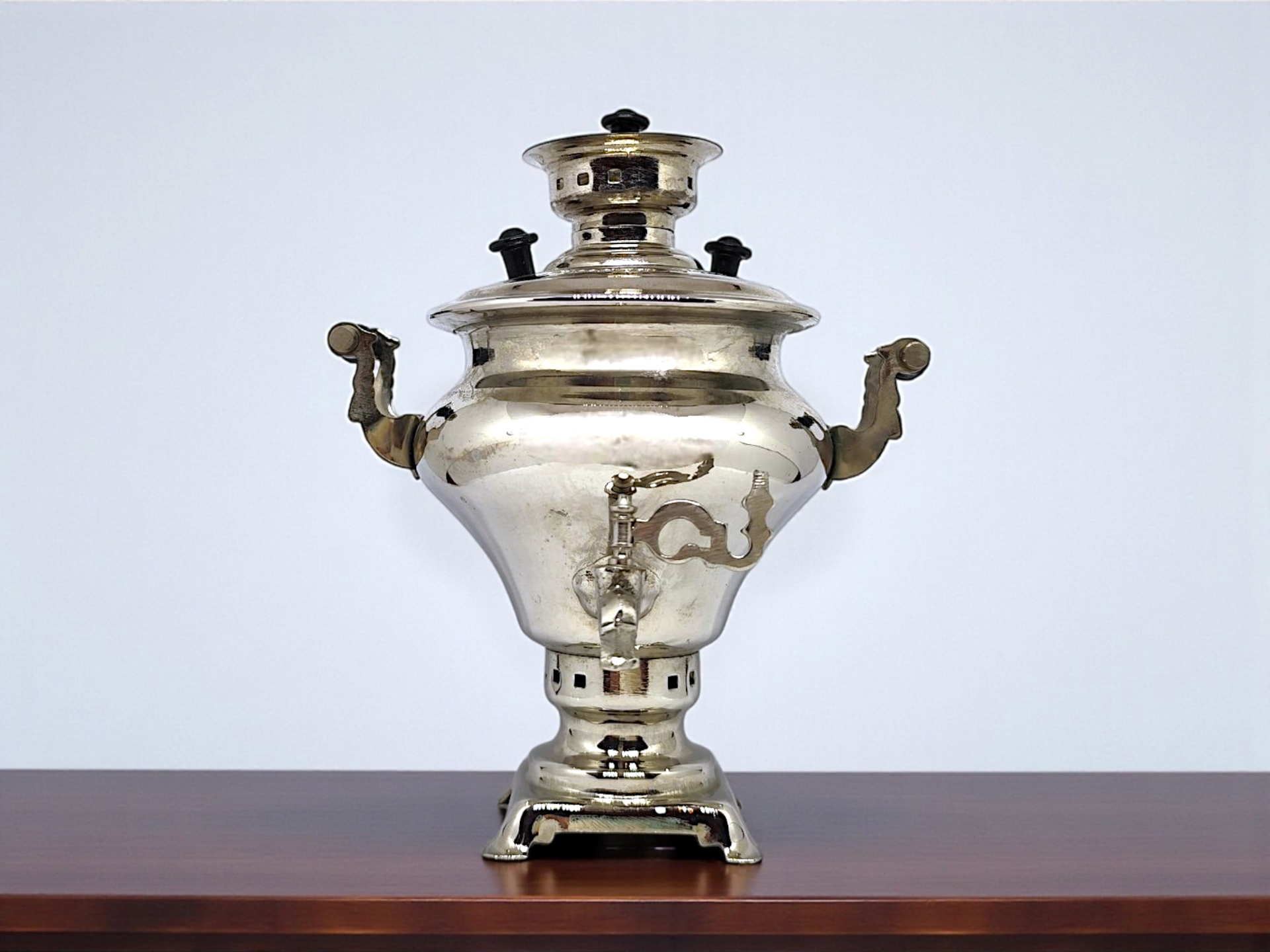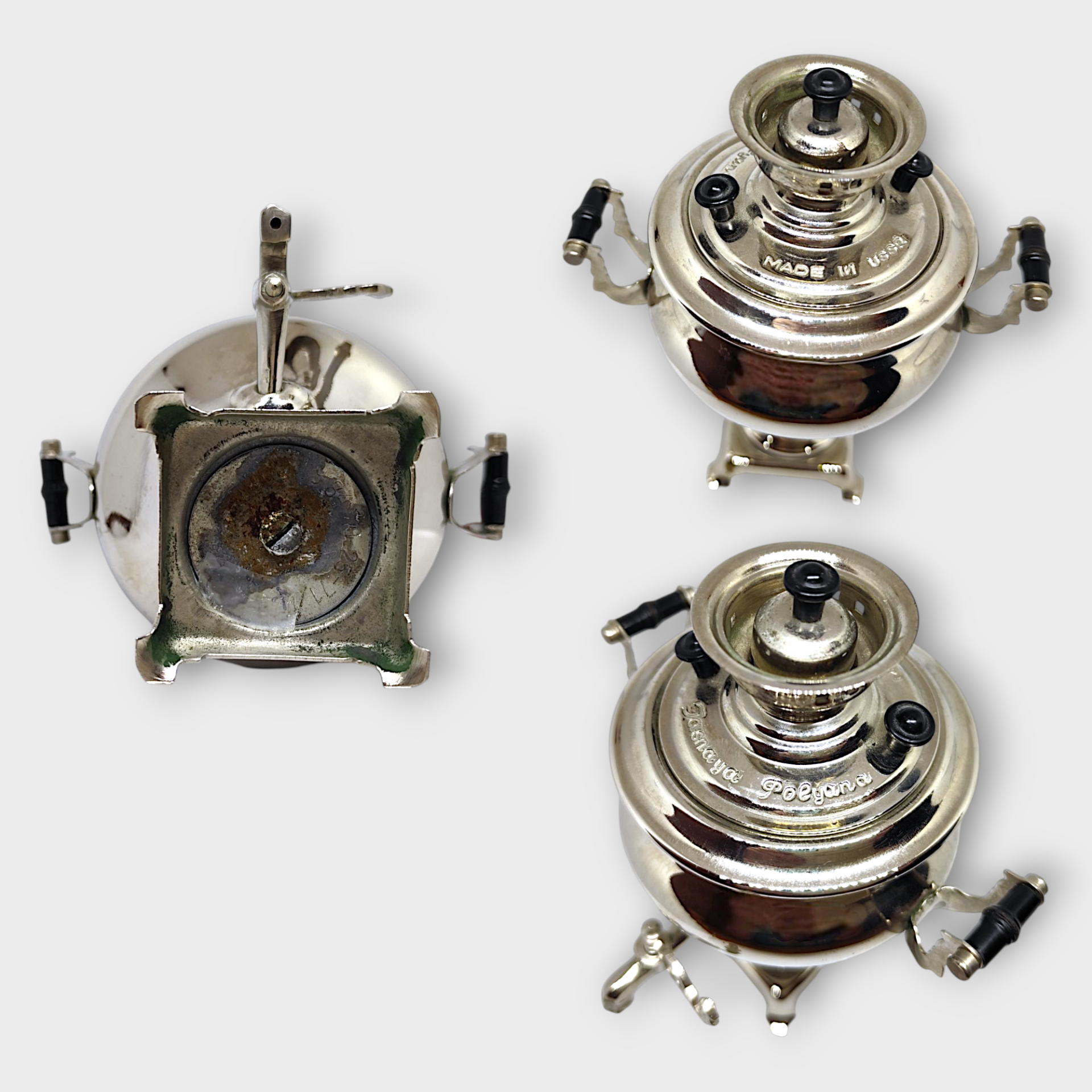 This samovar is made as a souvenir for foreign tourists who visited the Soviet Union at the time. It has an inscription in English "Made in USSR Jasnaya Polyana" and the year of release is 1967.