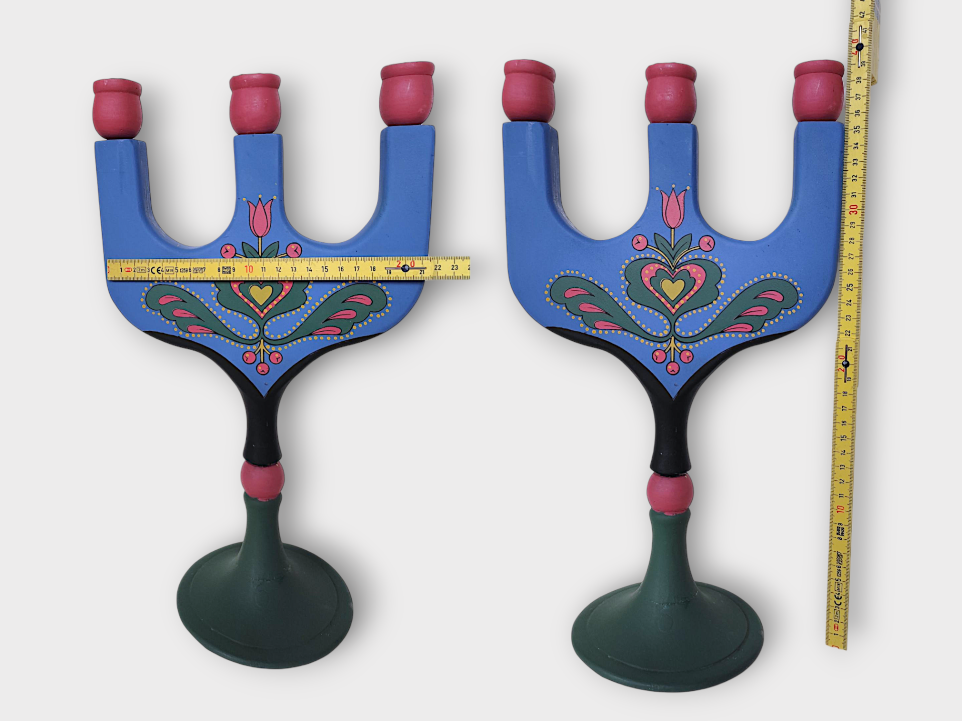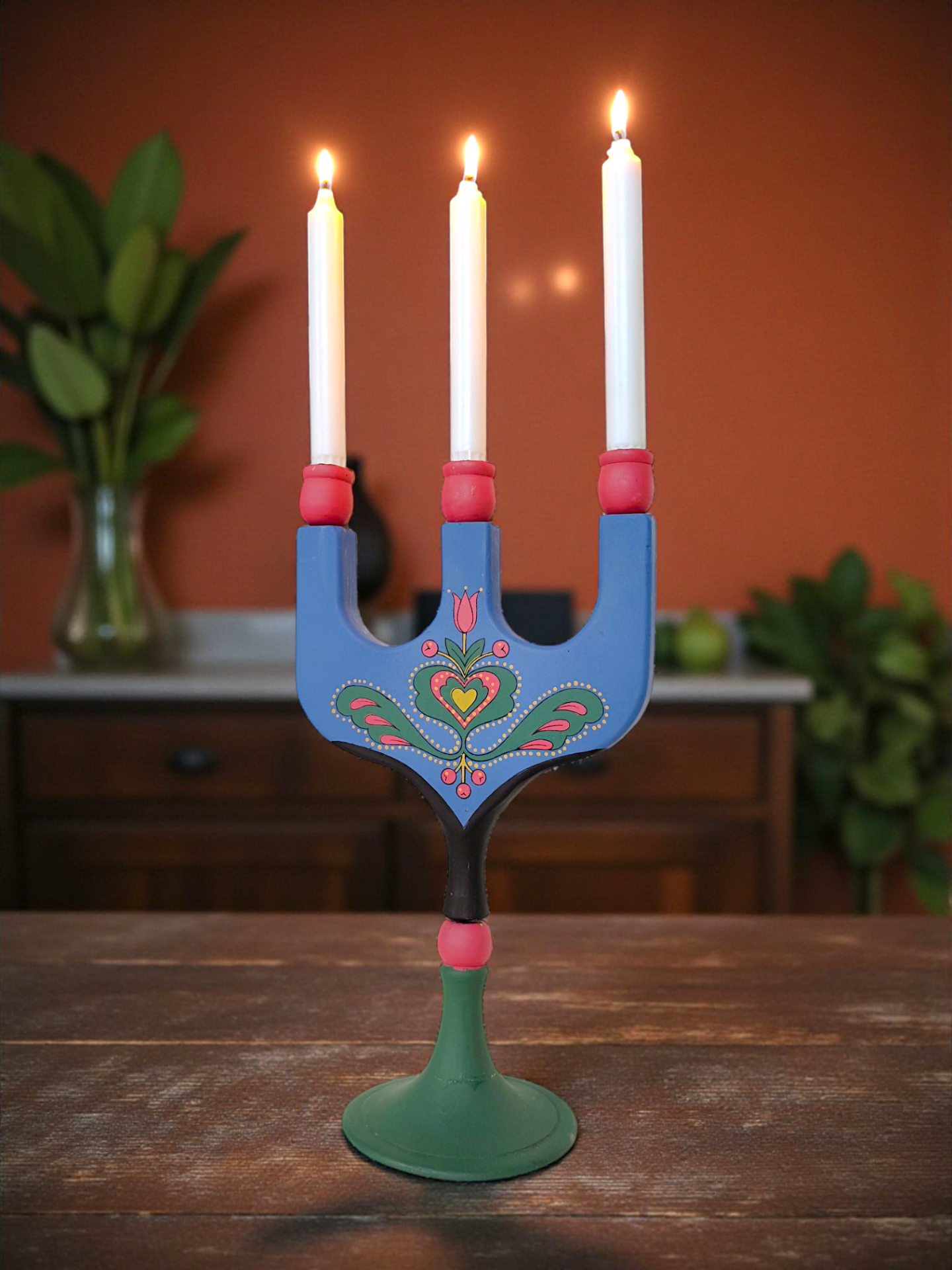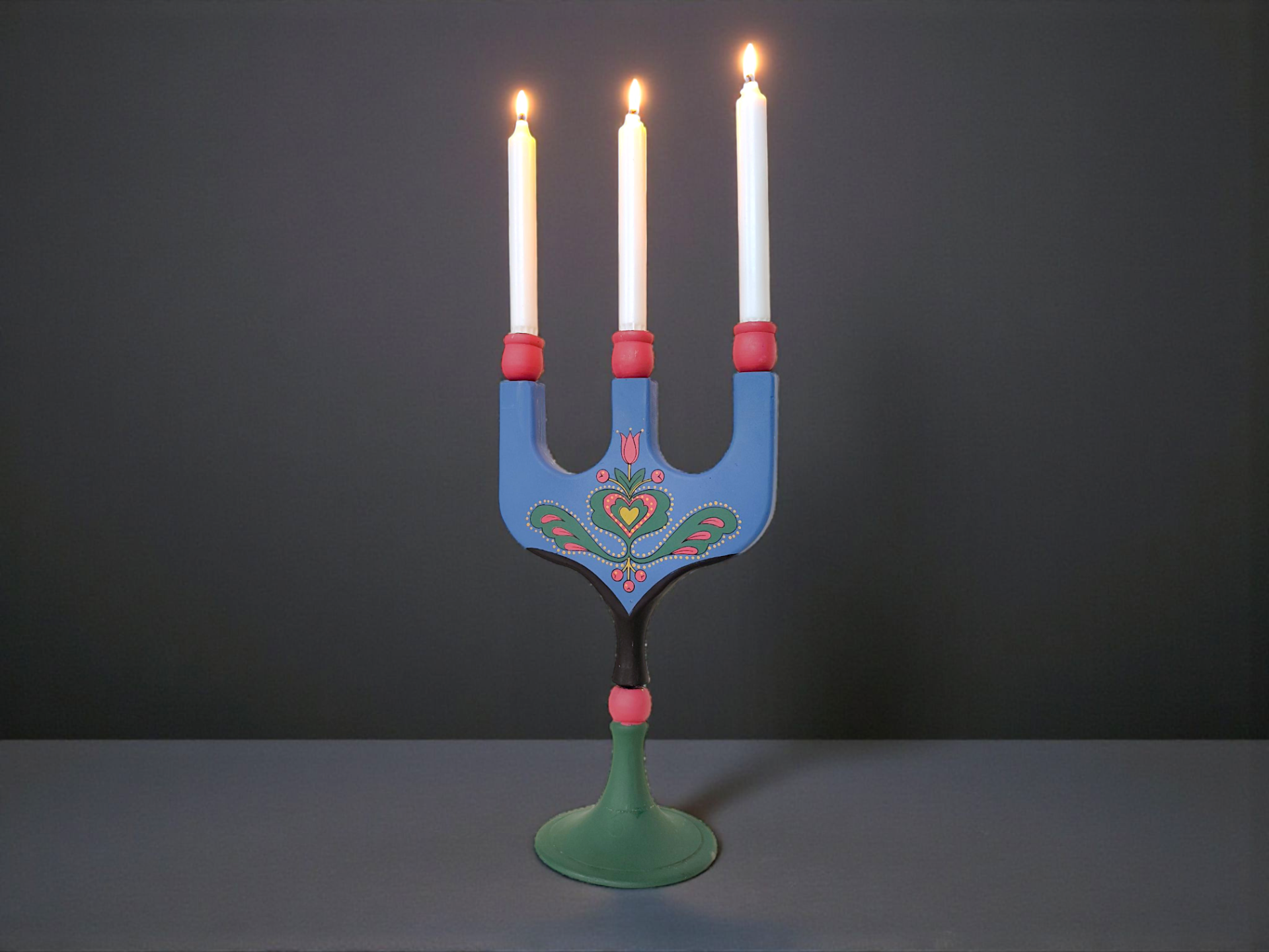 A hand-painted wooden candlestick with three arms from Sweden in a vintage style with traditional rose painting motifs.