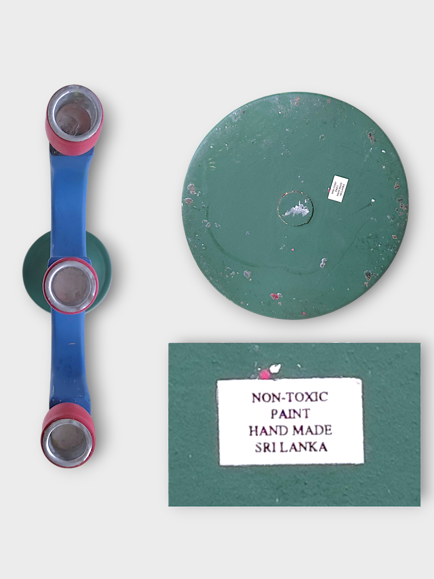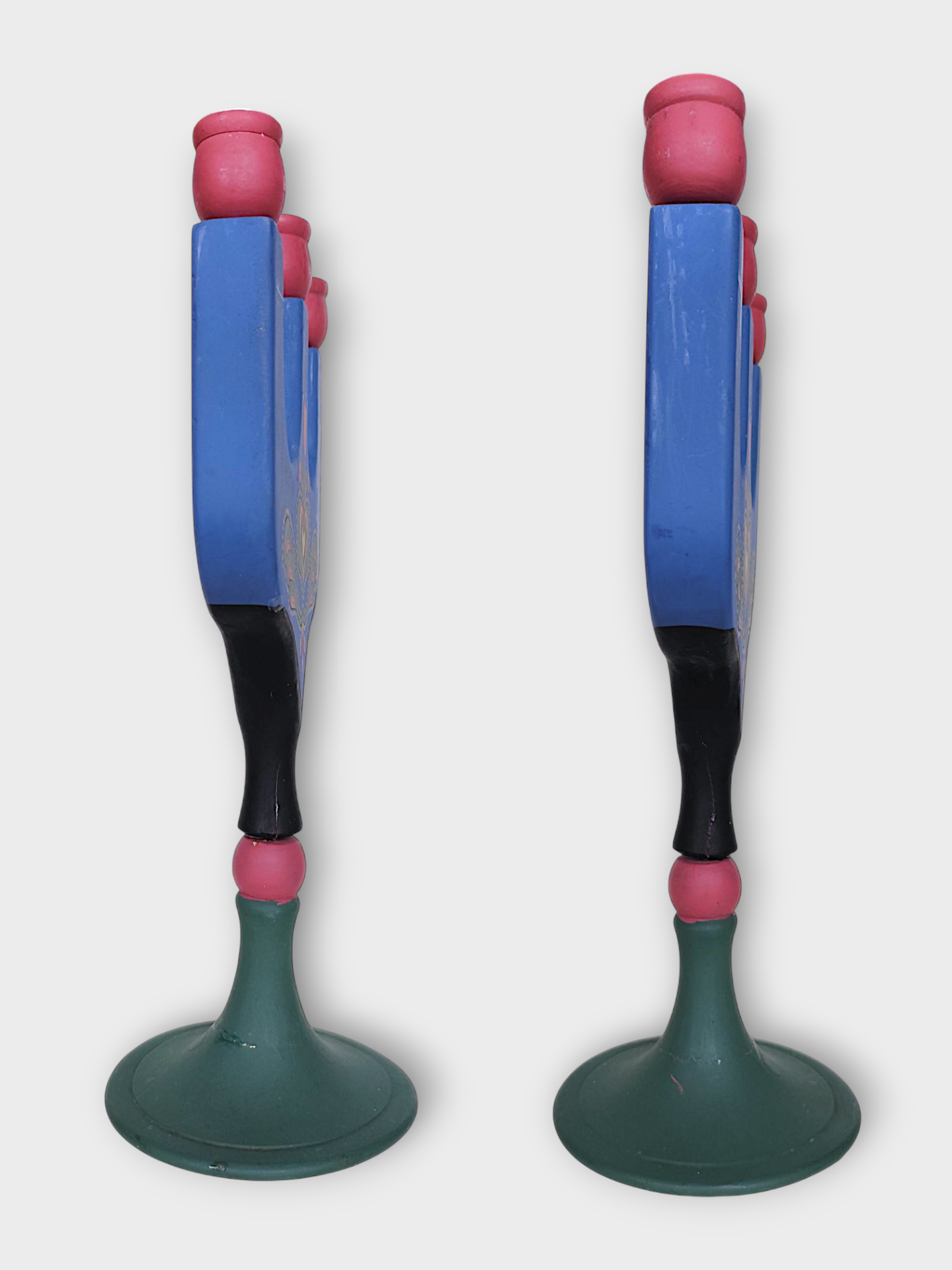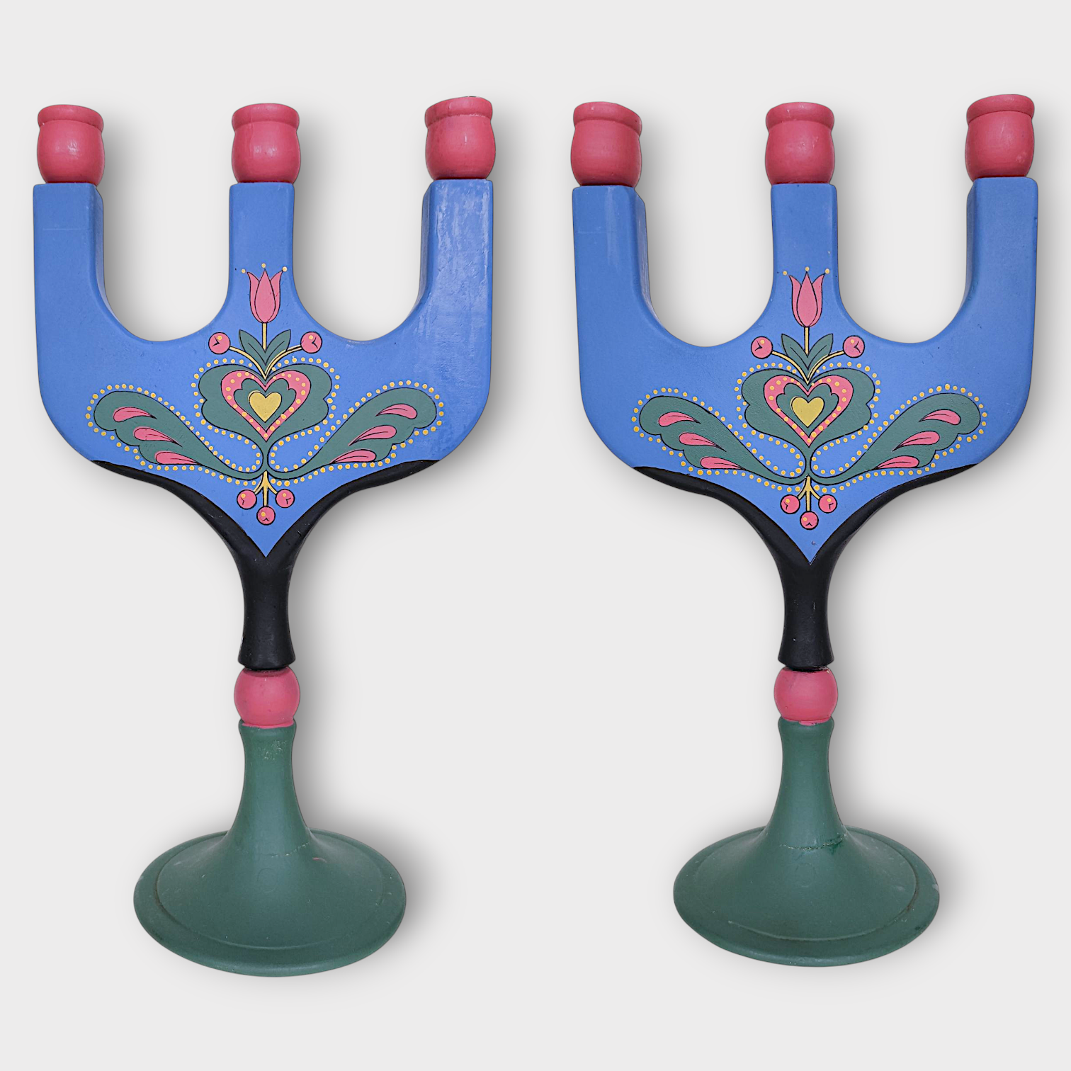 A hand-painted wooden candlestick with three arms from Sweden in a vintage style with traditional rose painting motifs.