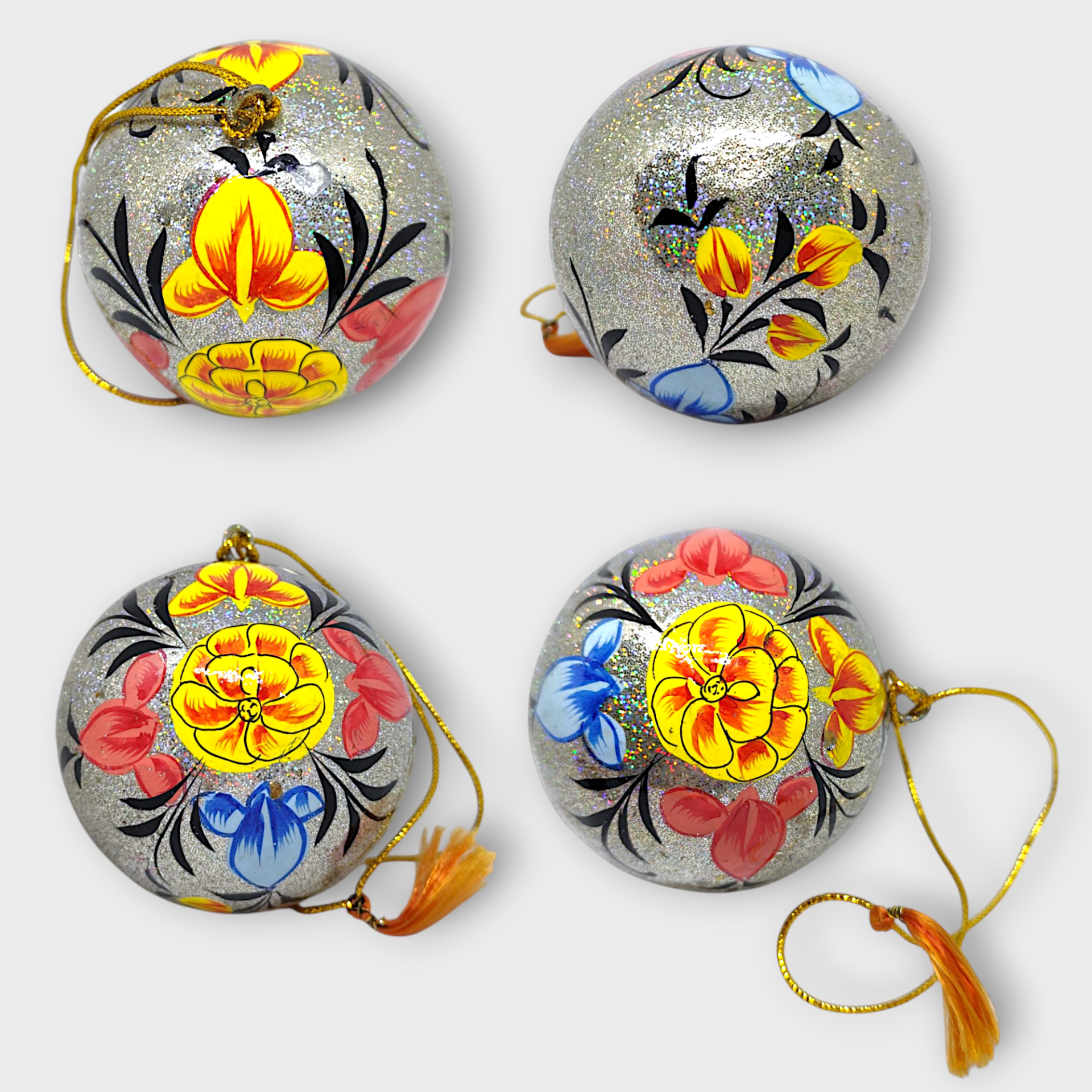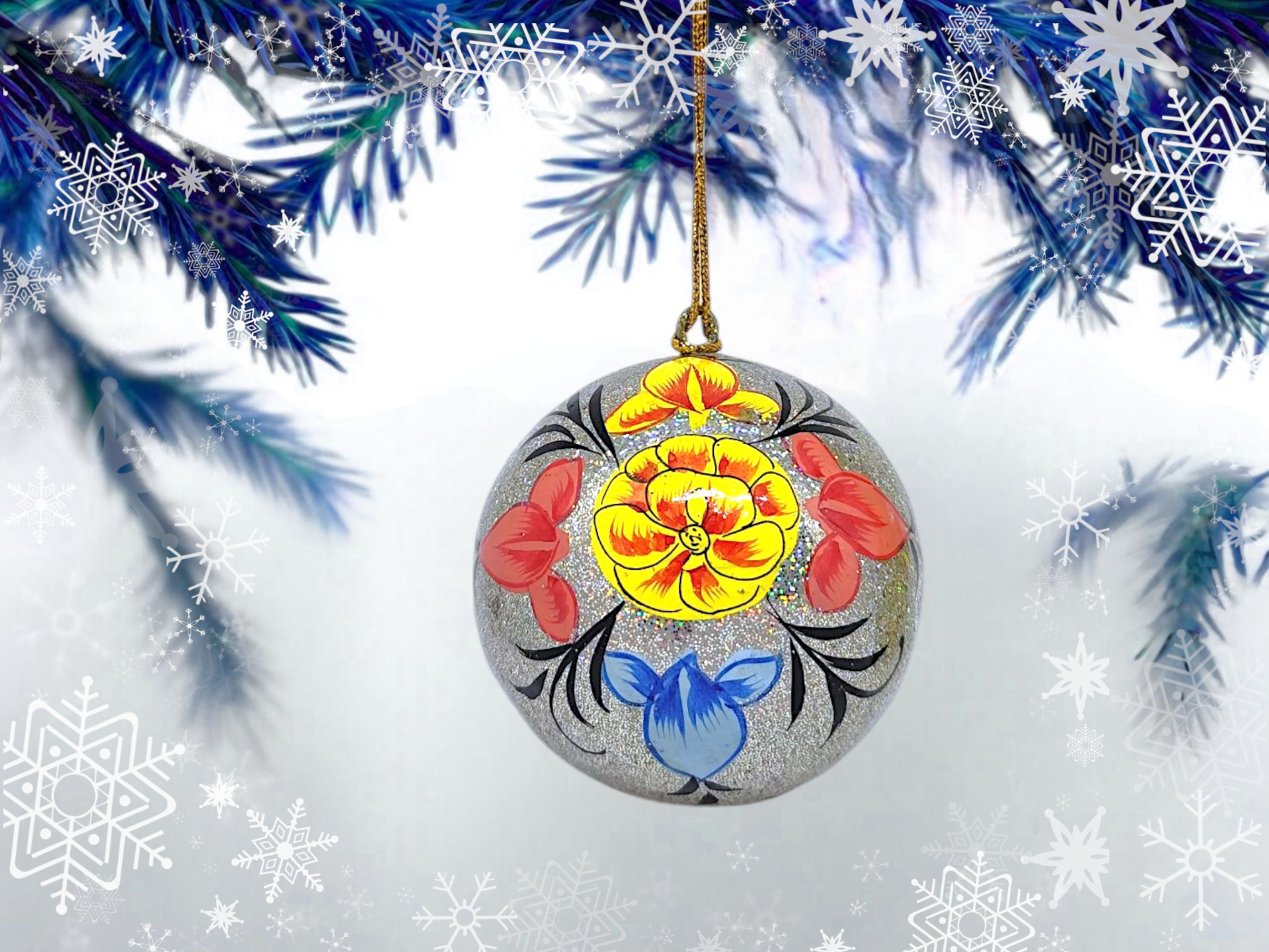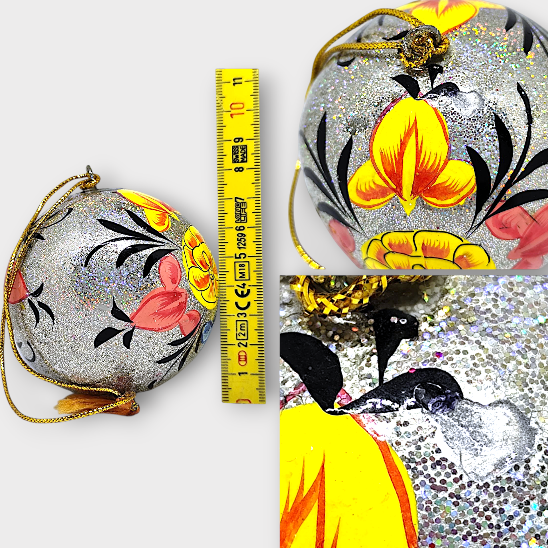 A handmade Christmas decoration in papier-mâché. The design is inspired by floral Kashmiri embroidery patterns from India. This festive Christmas bauble is a beautiful hanging Christmas decoration that will add a colorful touch to your Christmas tree.