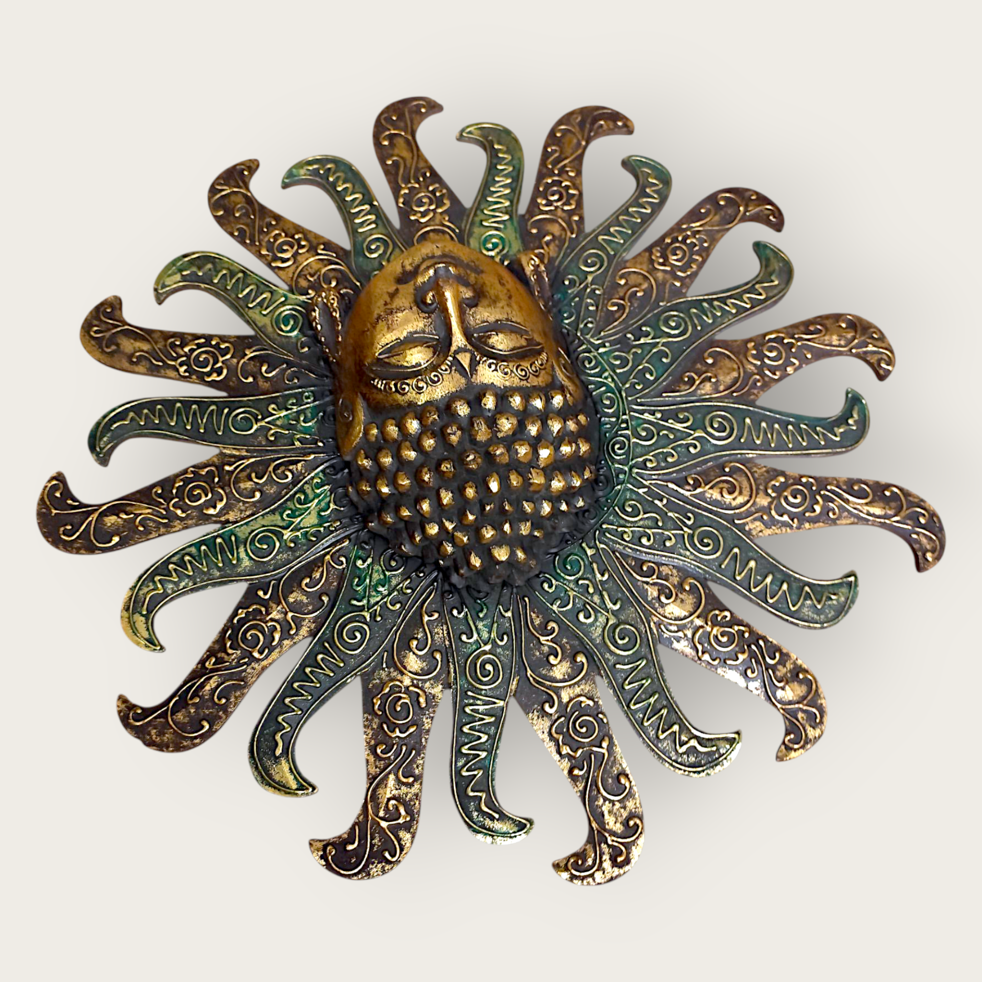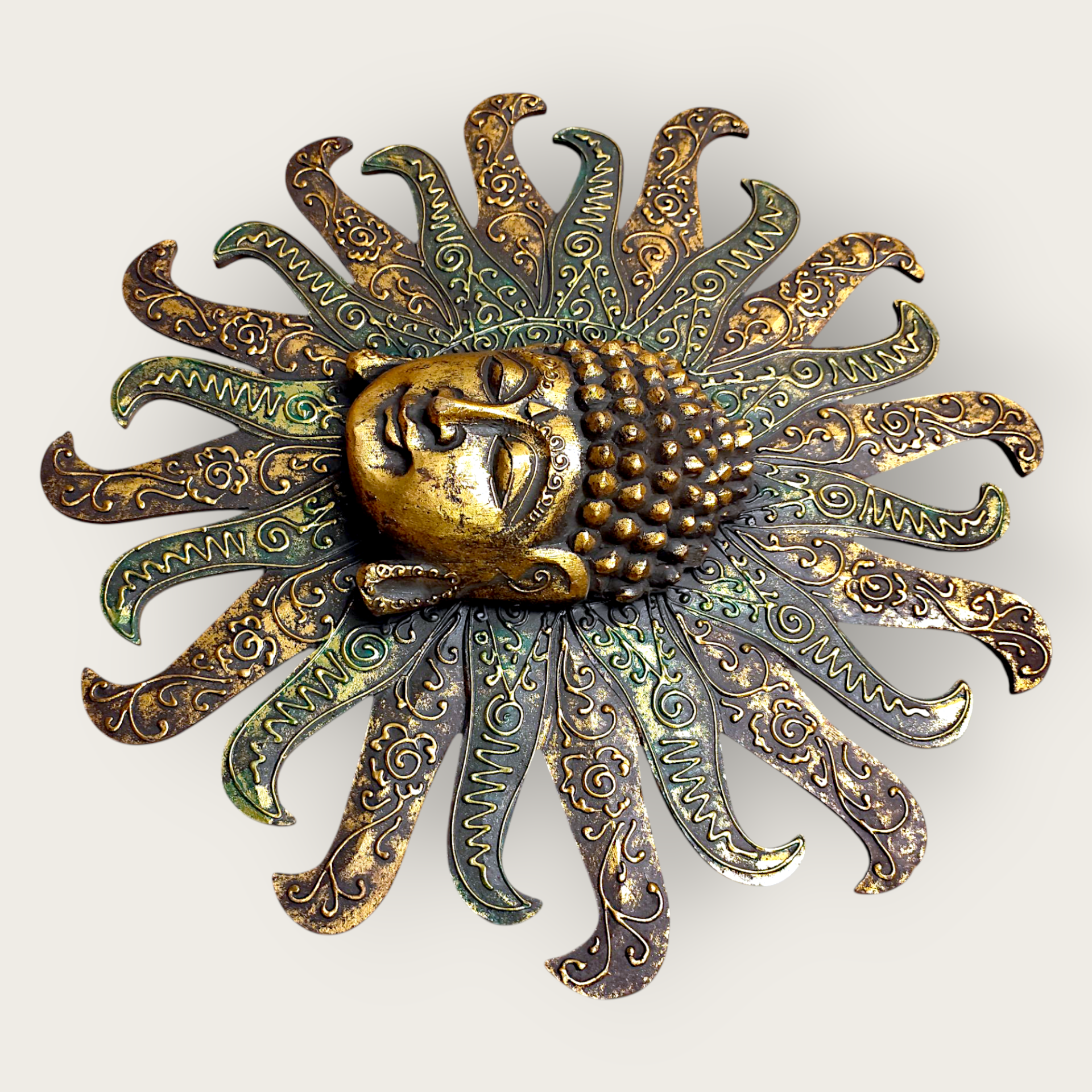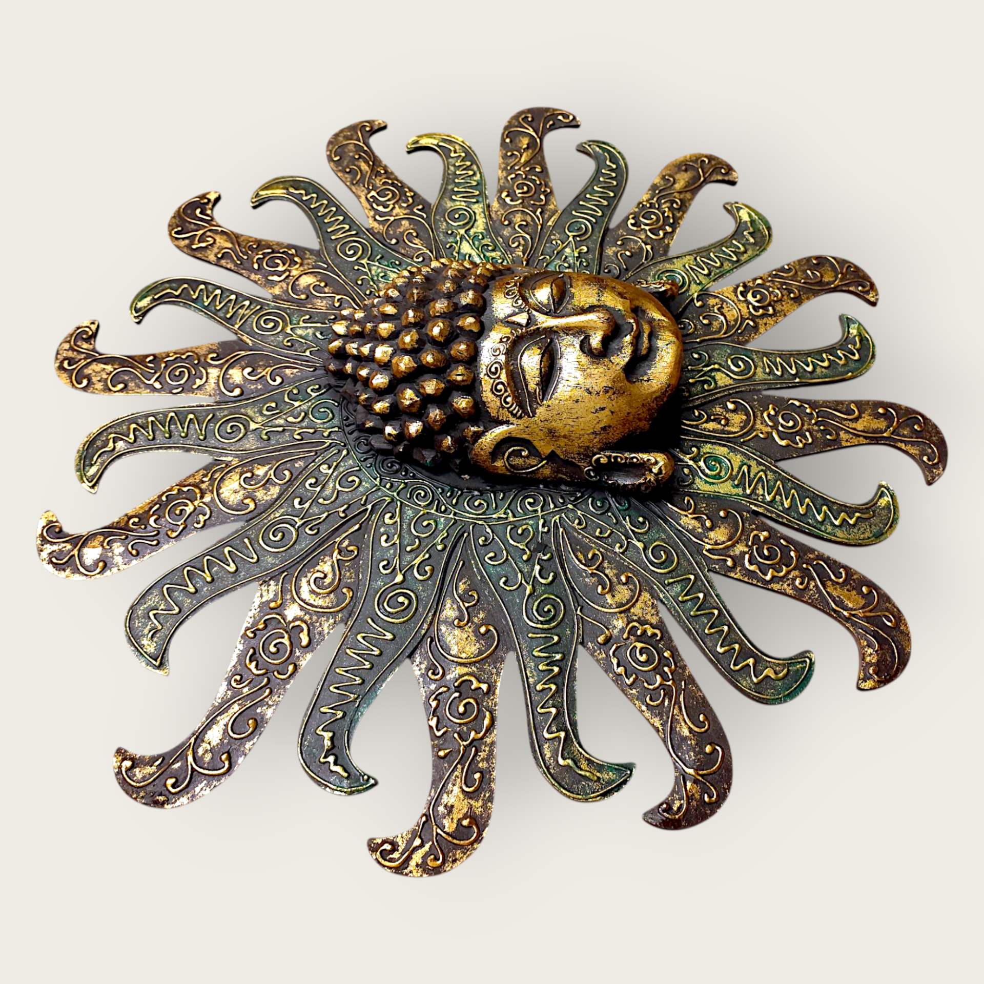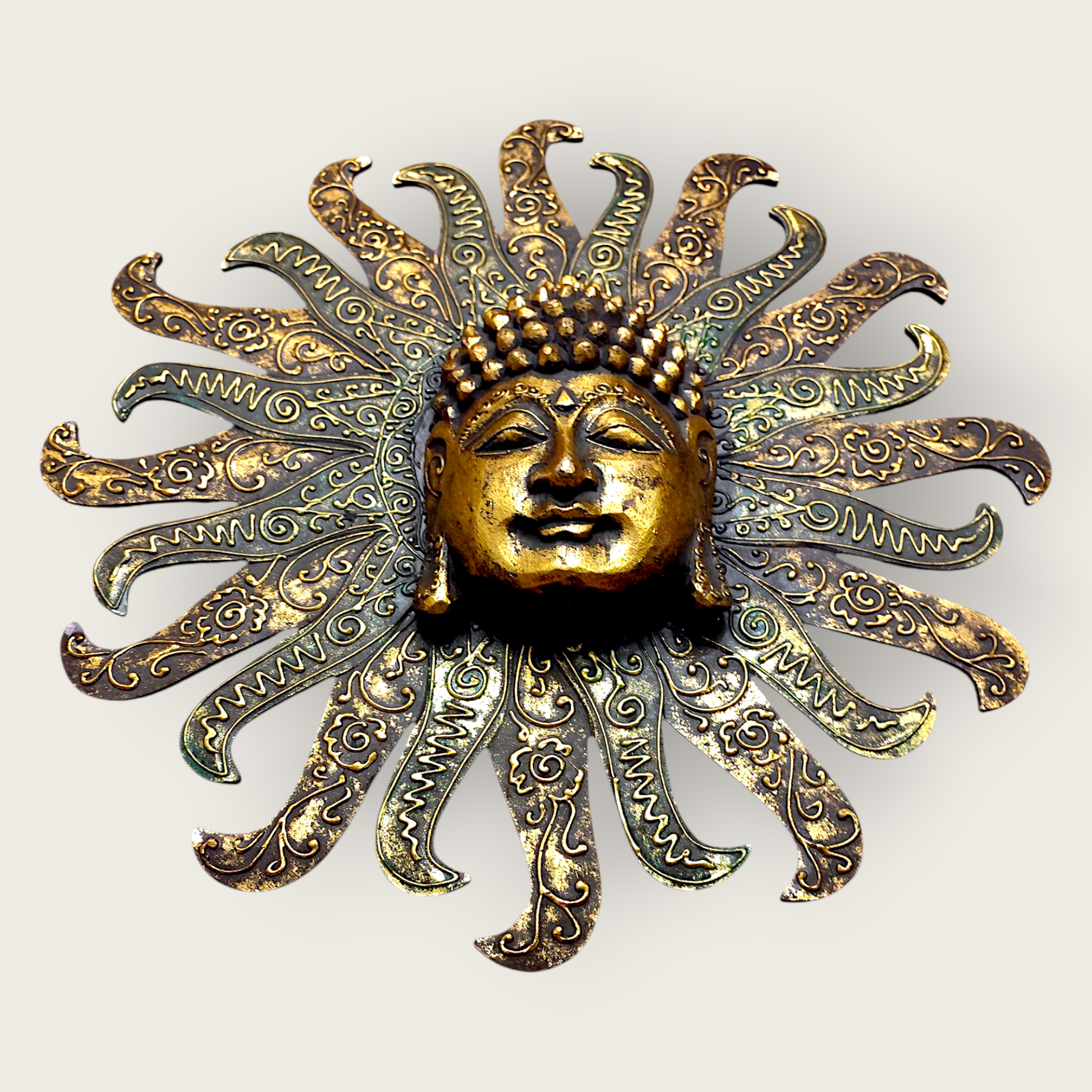 A wall decoration with a sunny Buddha motif. Made of painted wood. This decorative wall ornament brings a touch of spirituality and tranquility to your home. Perfect for creating a harmonious atmosphere in the living room, bedroom or meditation room.