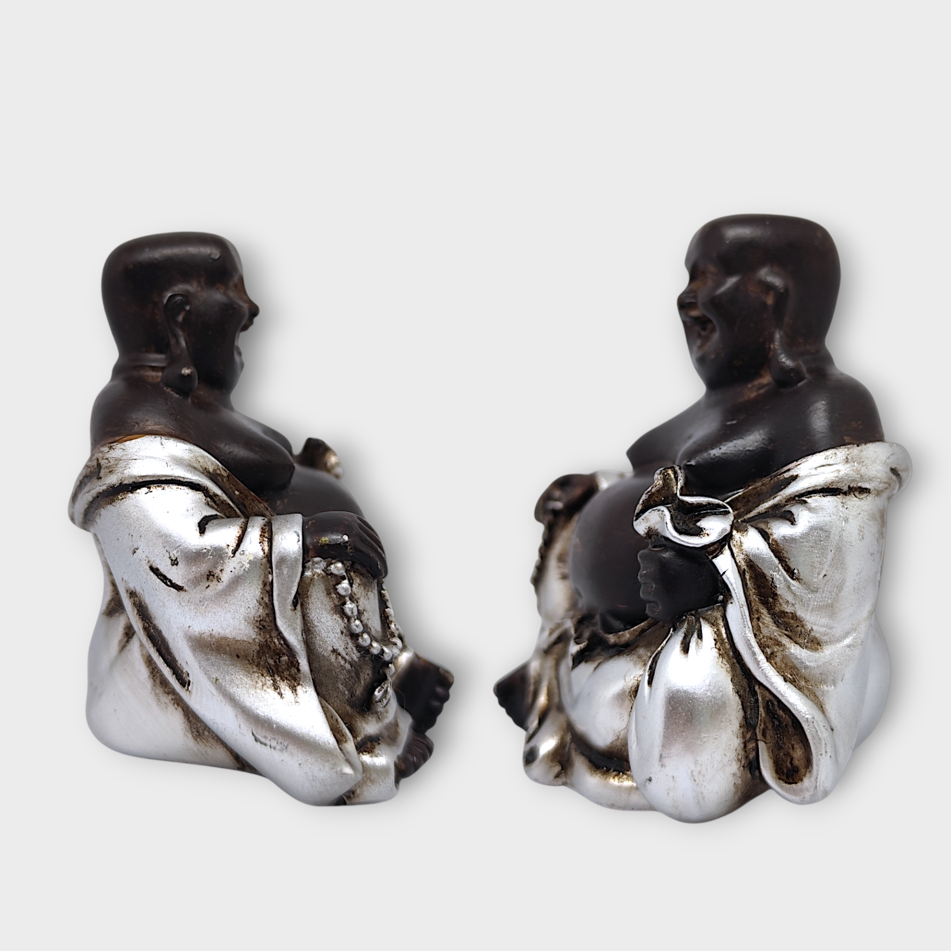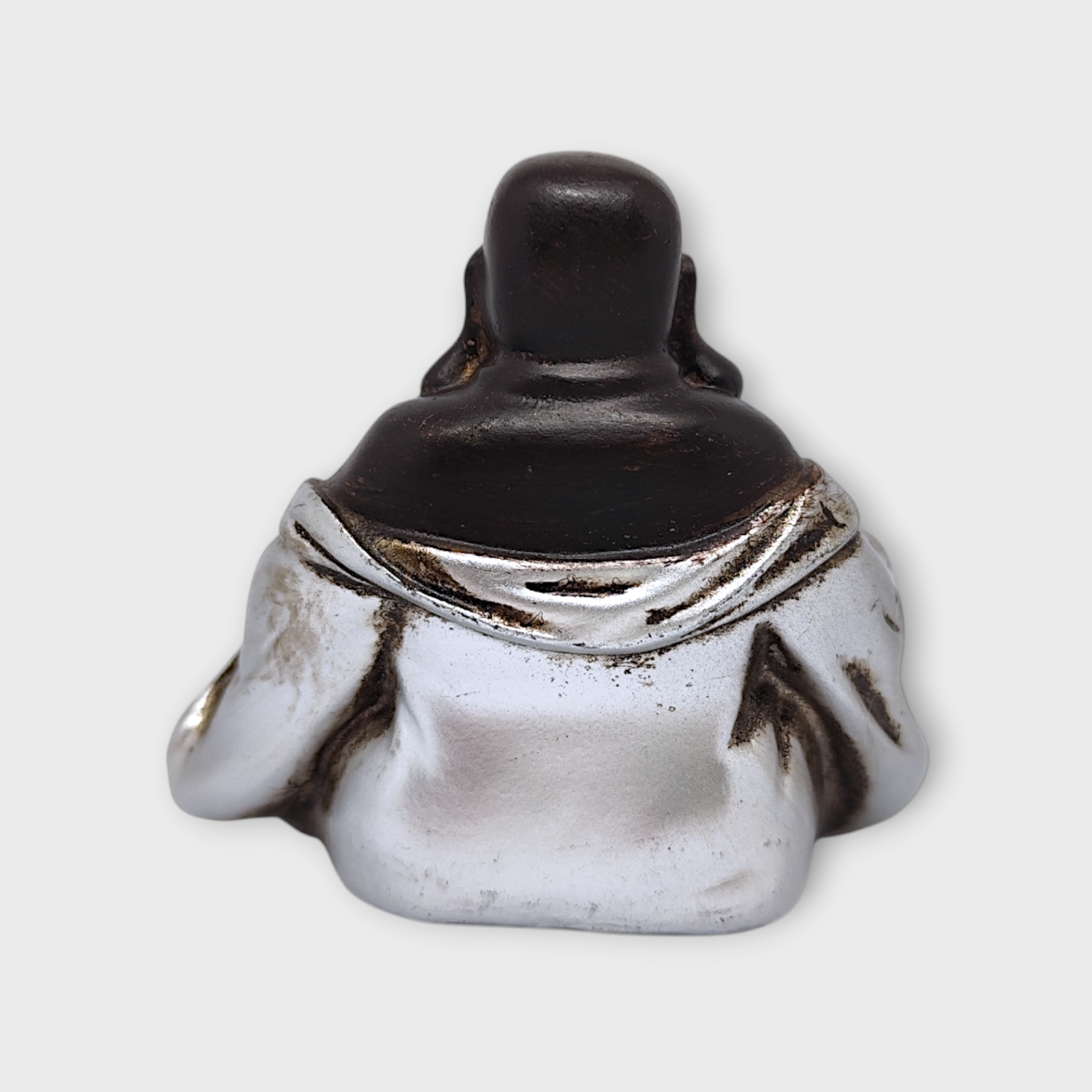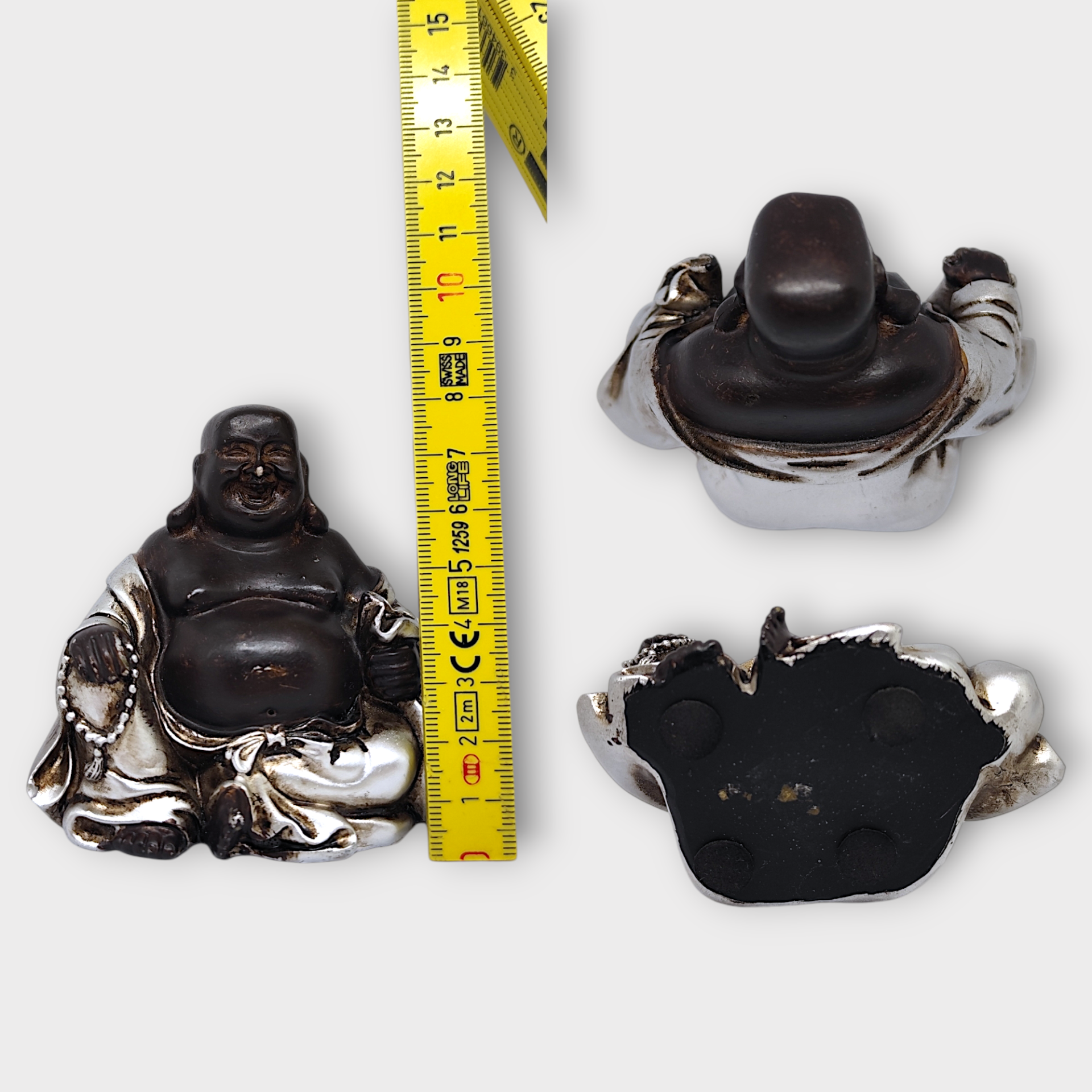 A decorative figure depicting a laughing Buddha. Agora design. The figure is in the colors brown and silver. Made of composite.