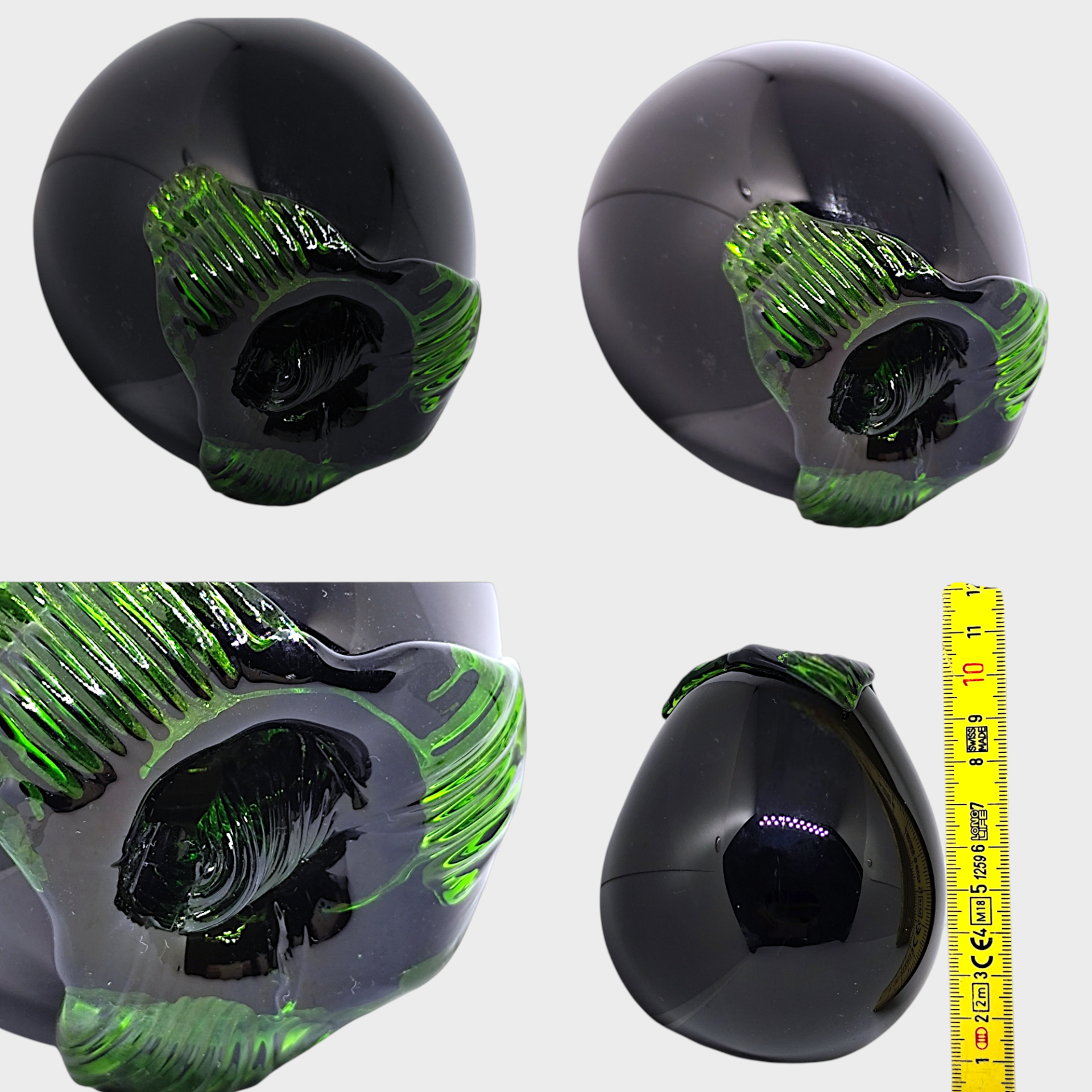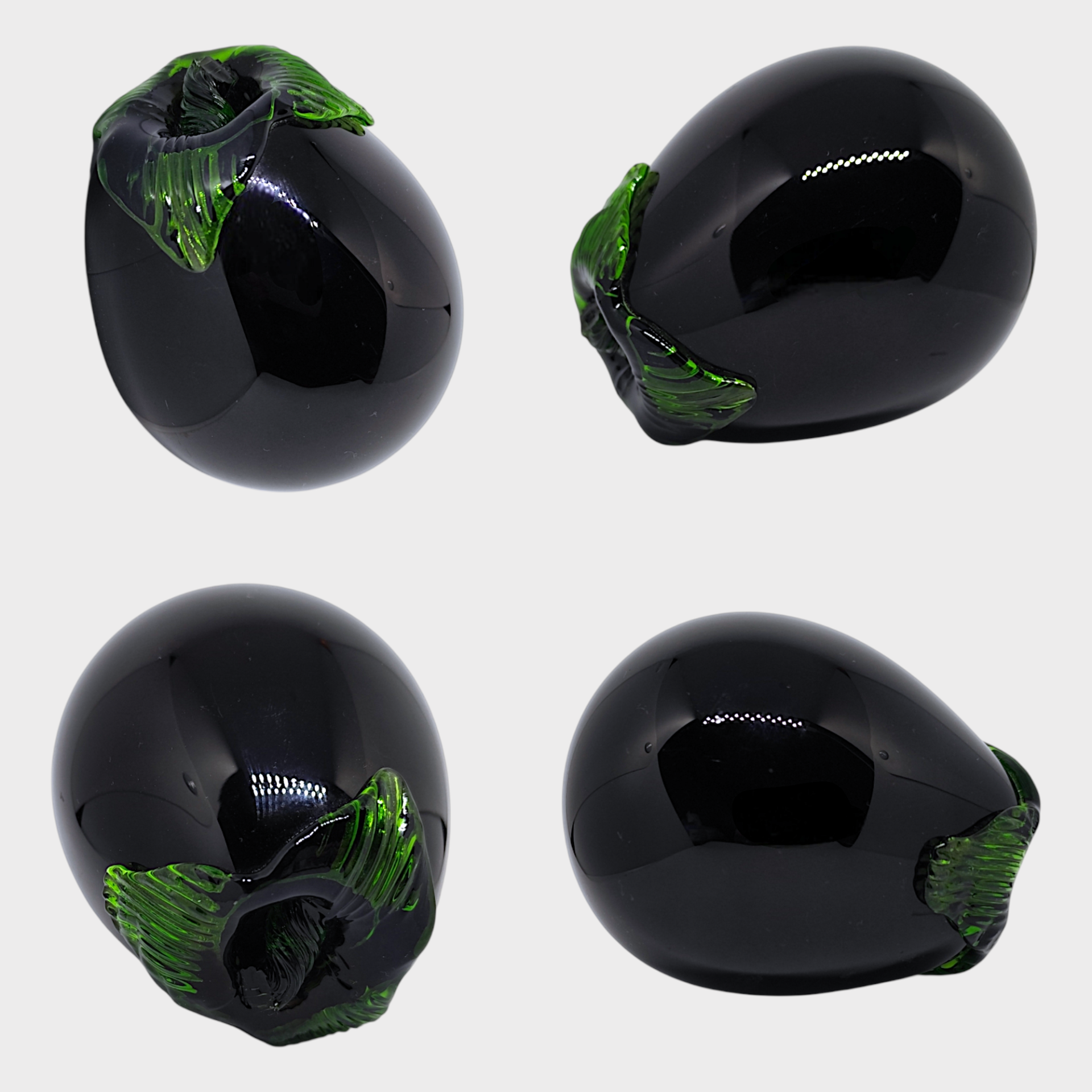 Studio Art hand blown glass eggplant vegetable paperweight. Made in Italy in black glass with green glass details.