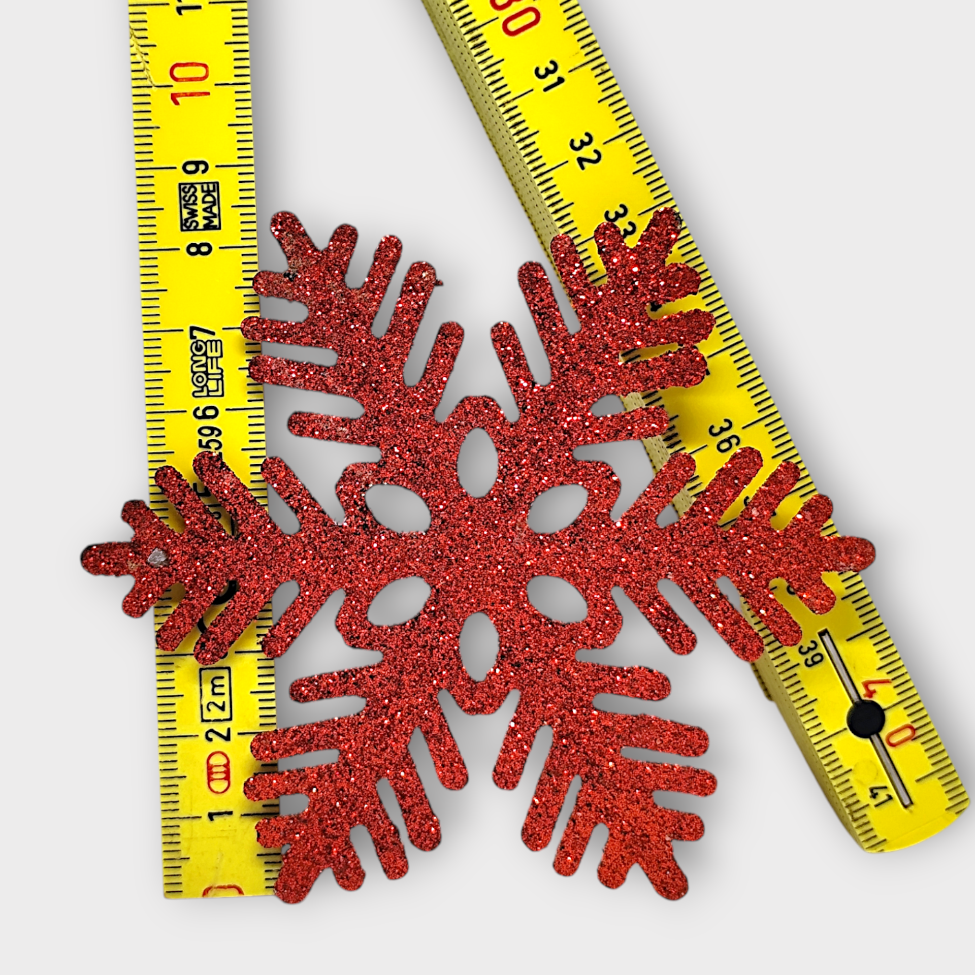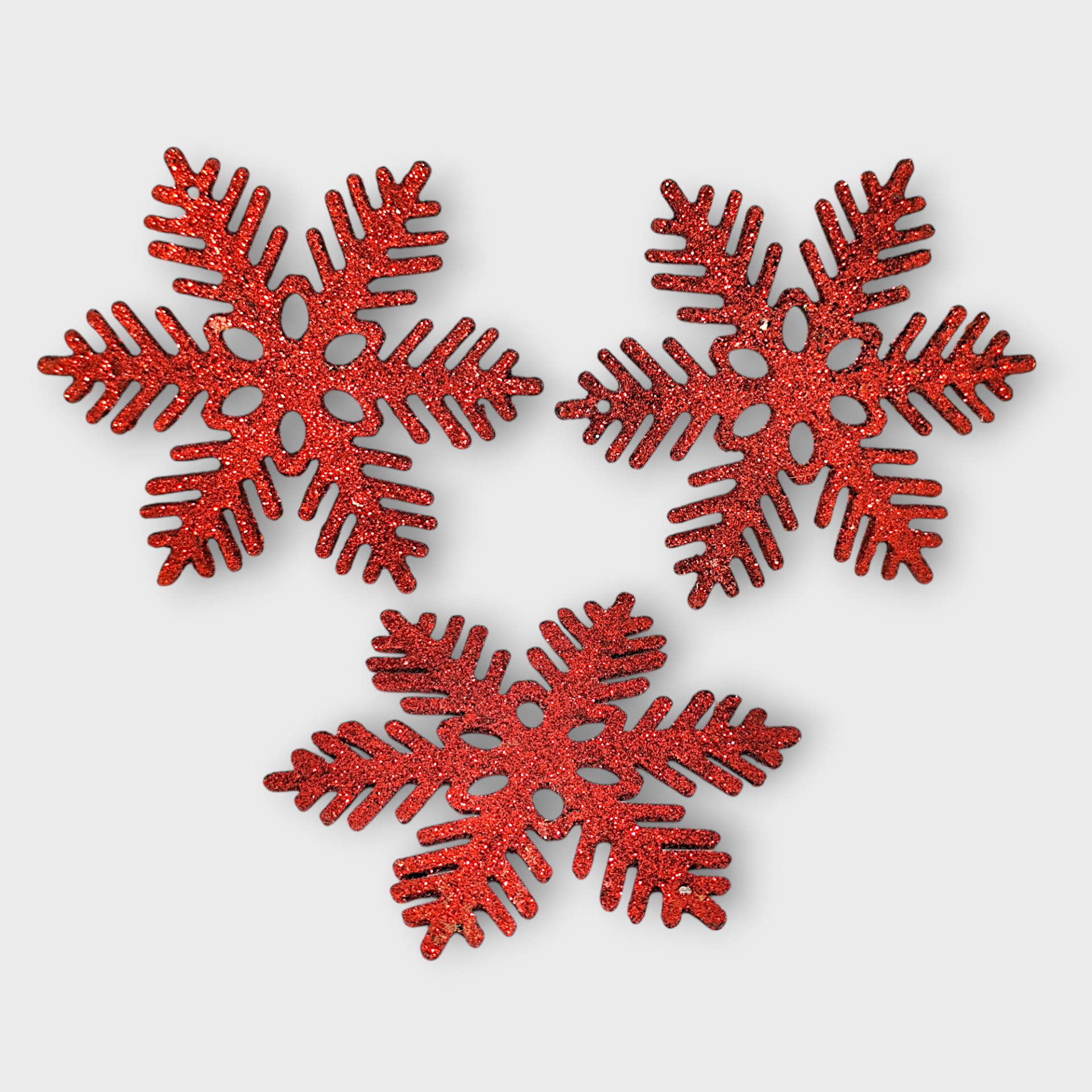 Three Christmas tree ornaments that look like red snowflakes. Made of cardboard/wood-like material.