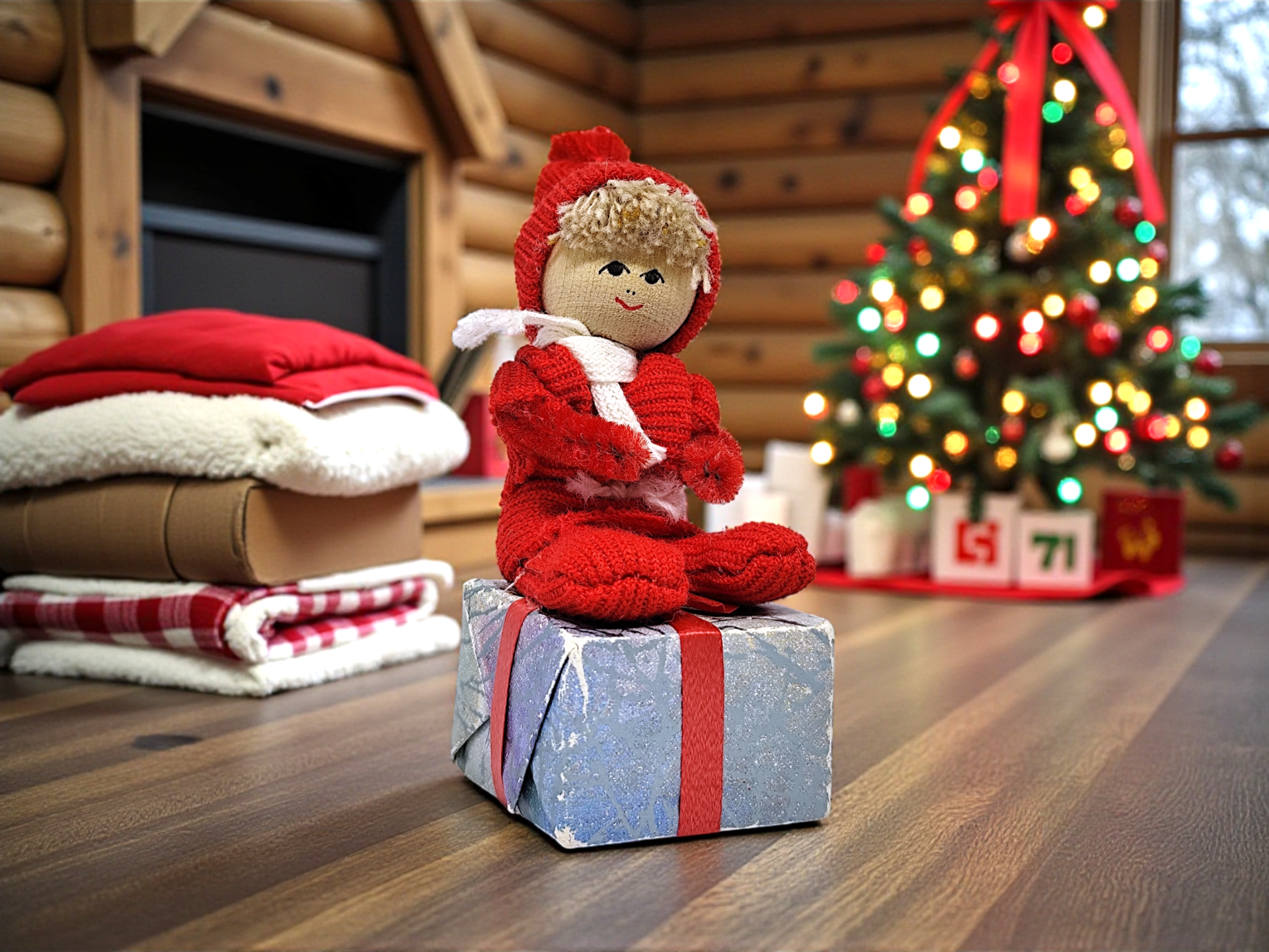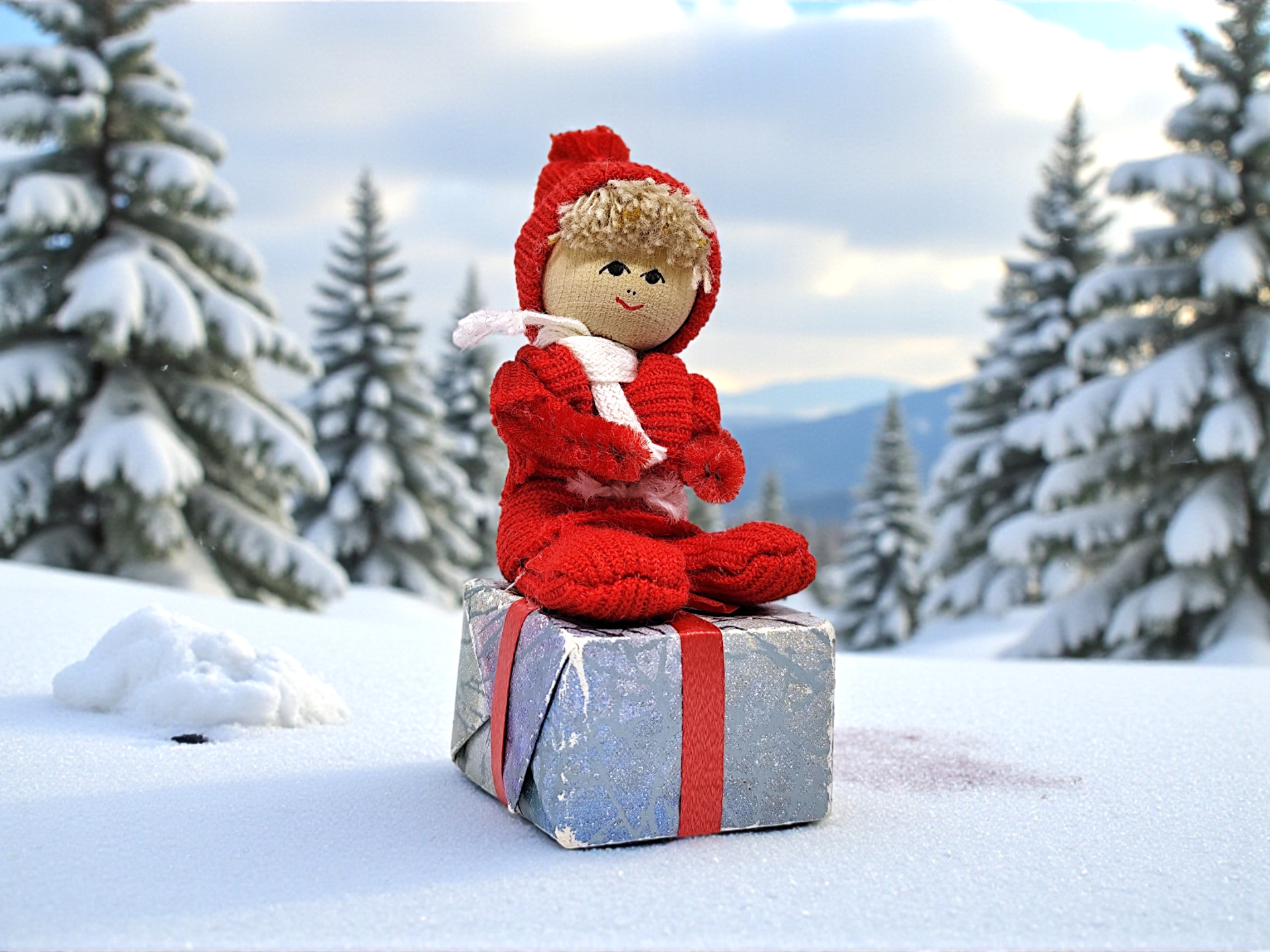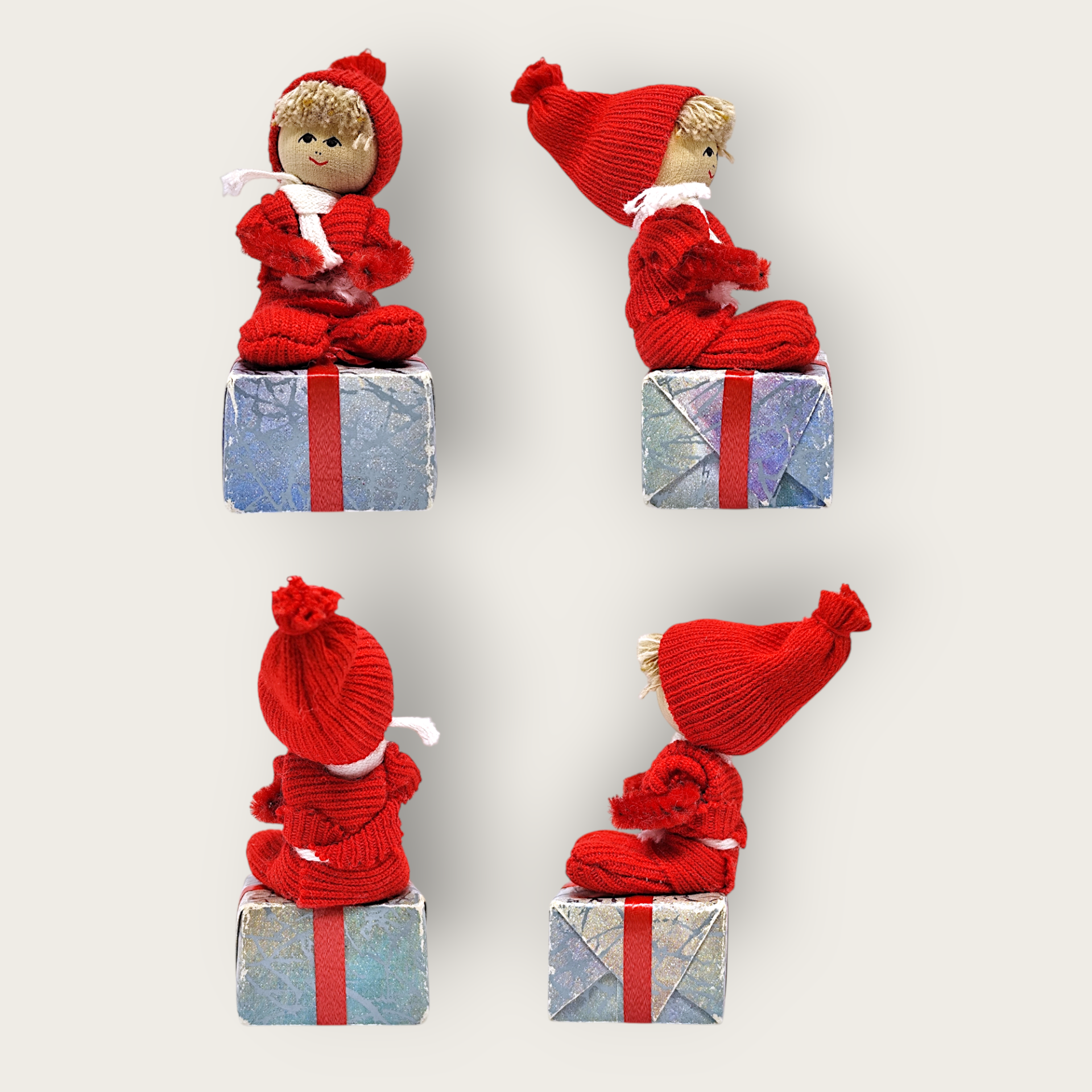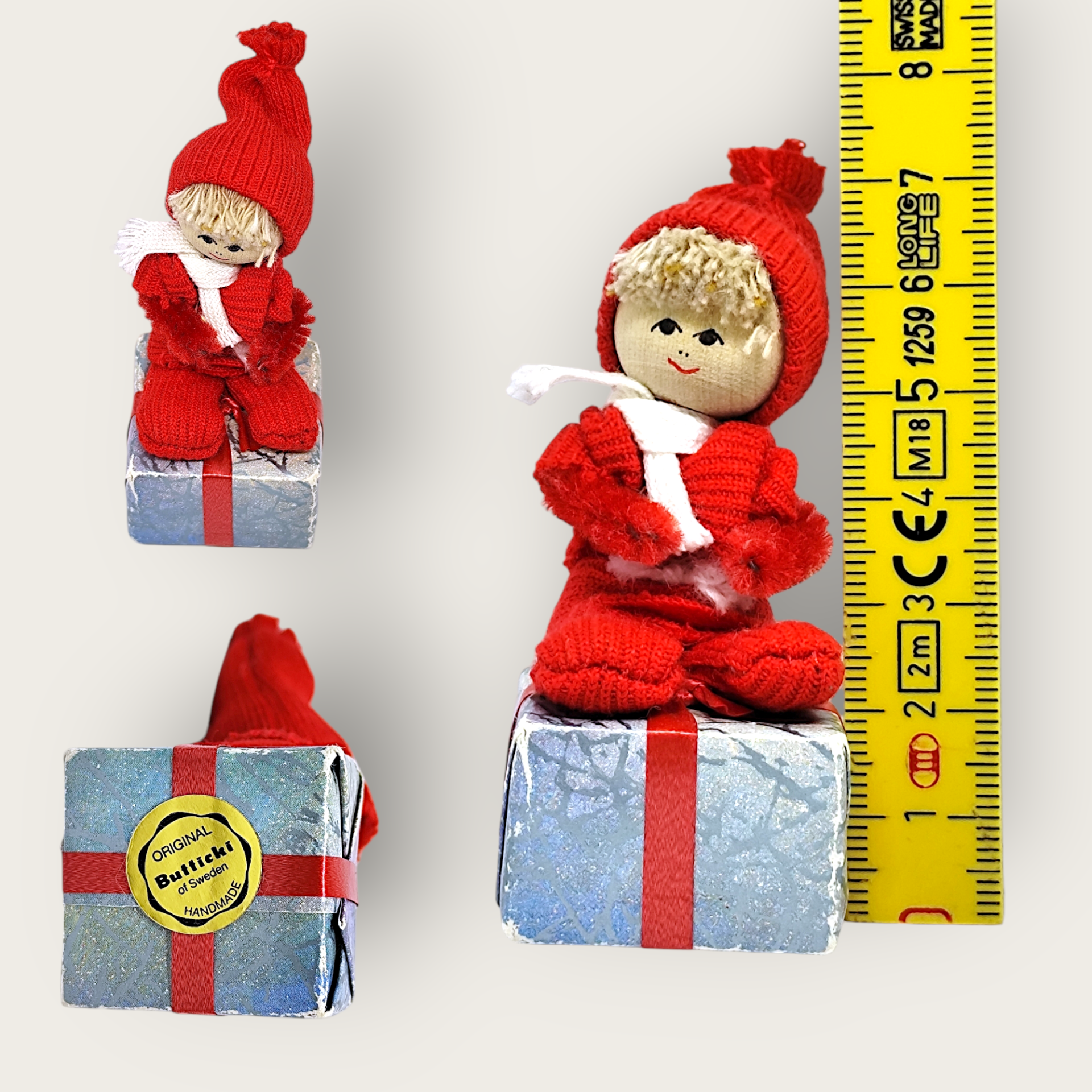 Butticki gnome made of wood and fabric. Hand-made by Svenskt Hantverk. The gnome sits on a package made of cardboard. Perfect as a Christmas decoration.