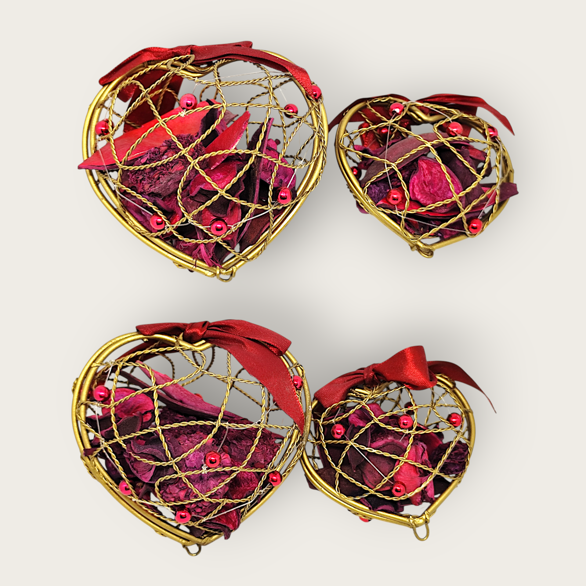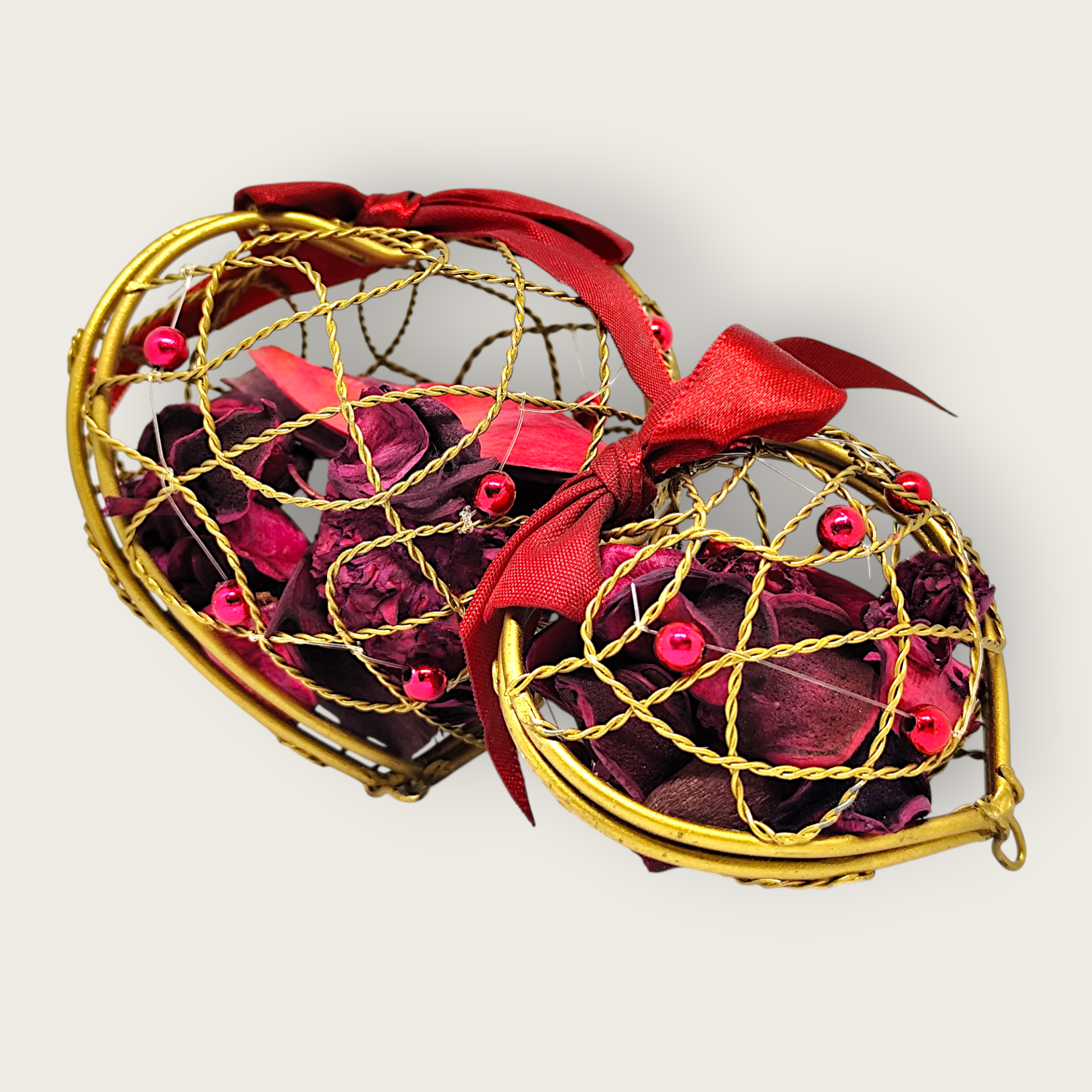 2 decorative metal hearts. Filled with dried flowers and decorated with red ribbons and beads. Perfect as an ornament.