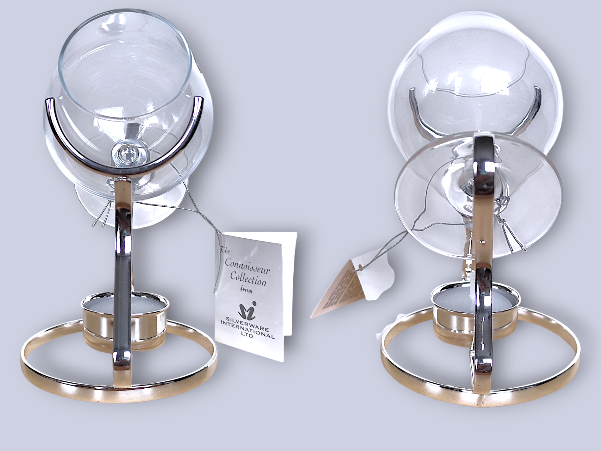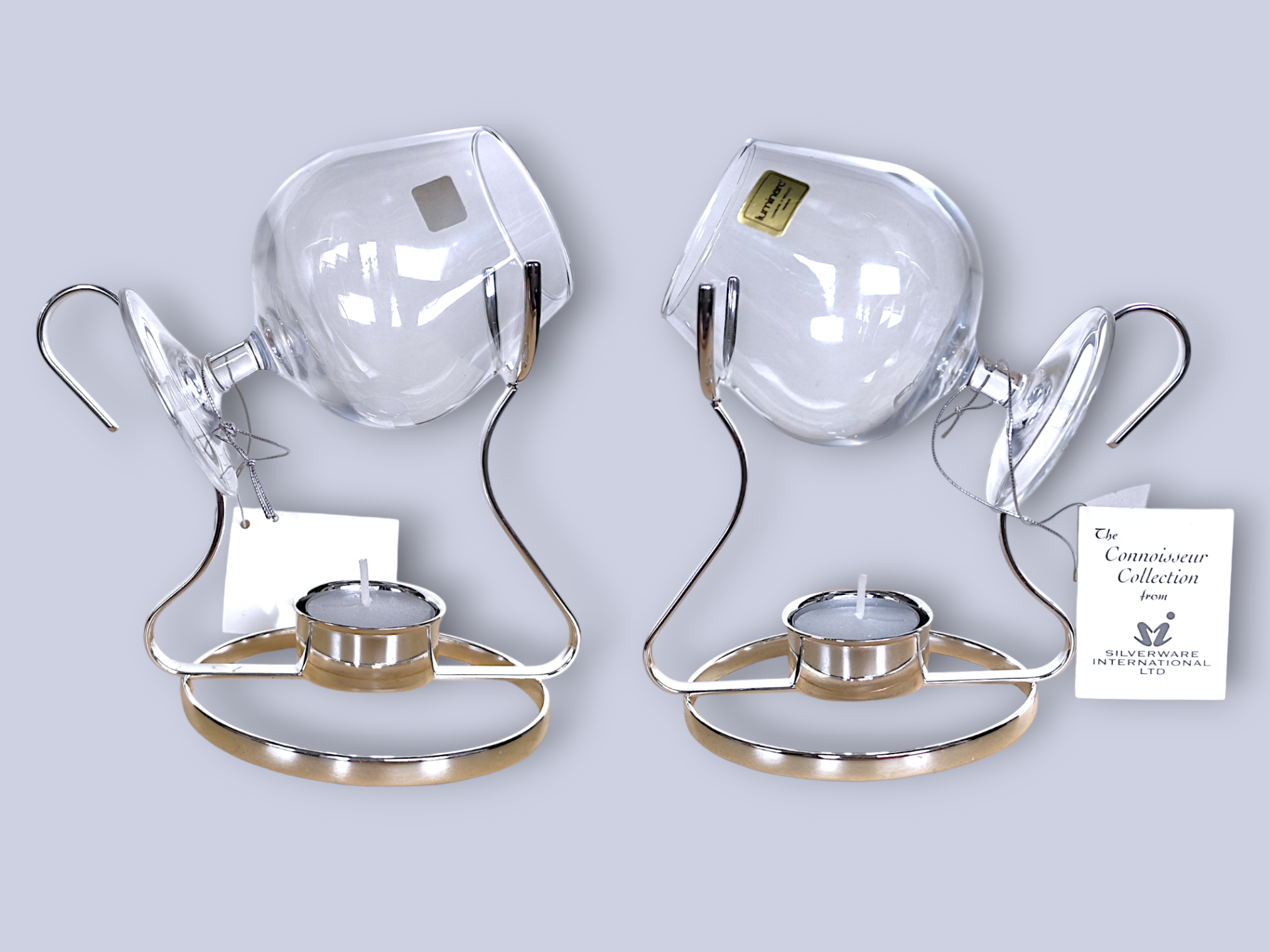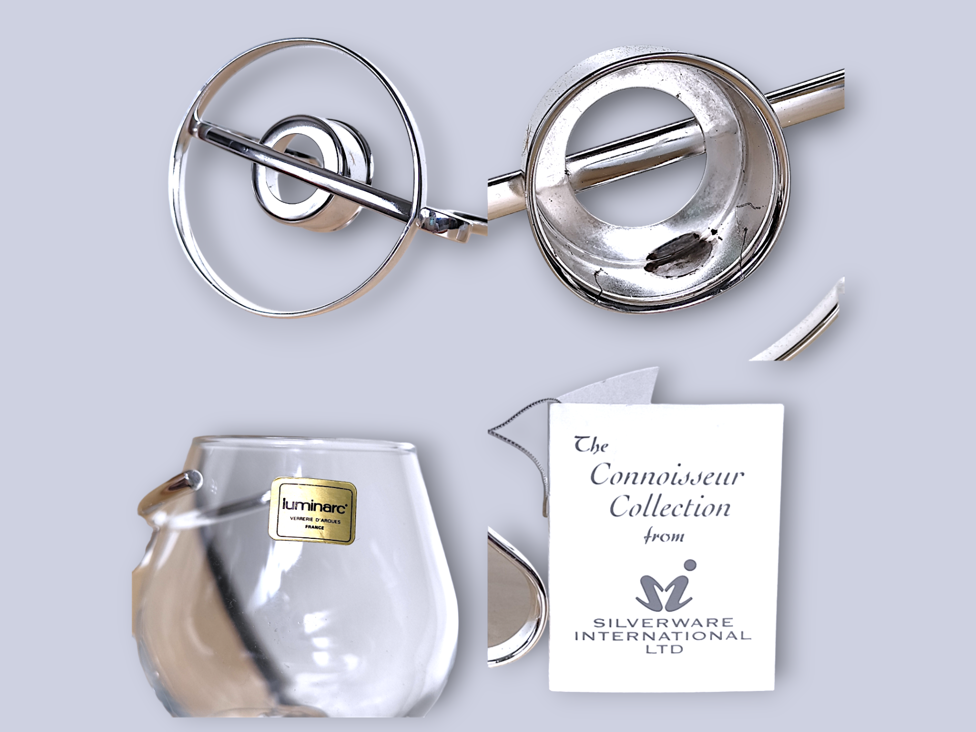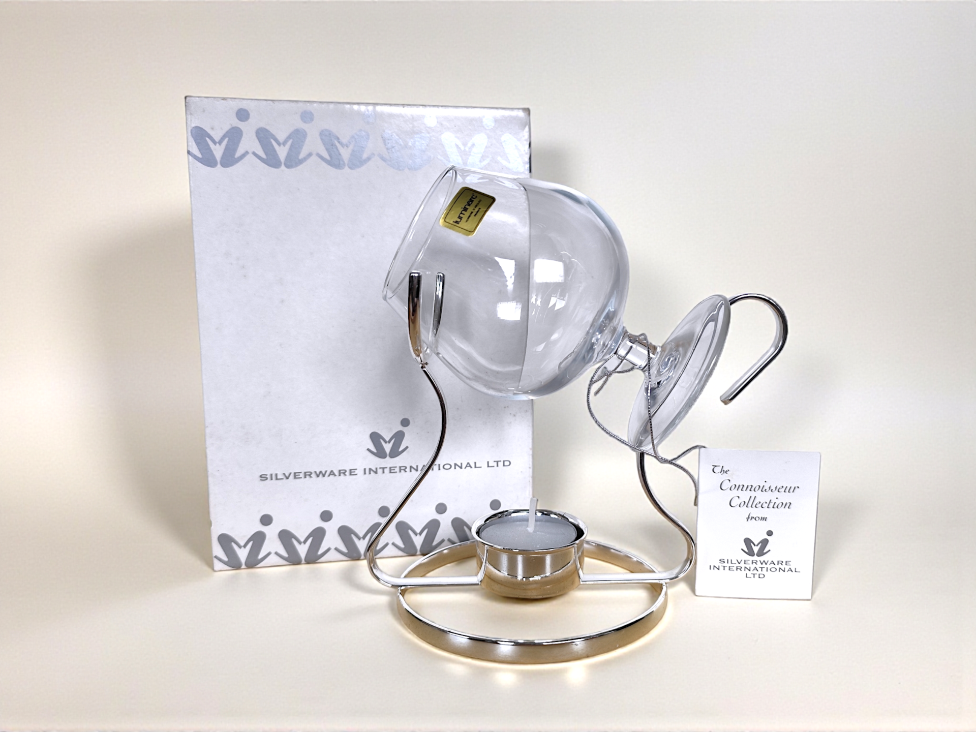 Brandy and Cognac warmer from The Connoisseur luminarc Collection, Silverware International LTD. An elegant silver plated utility and interior detail. Comes with original box and label.