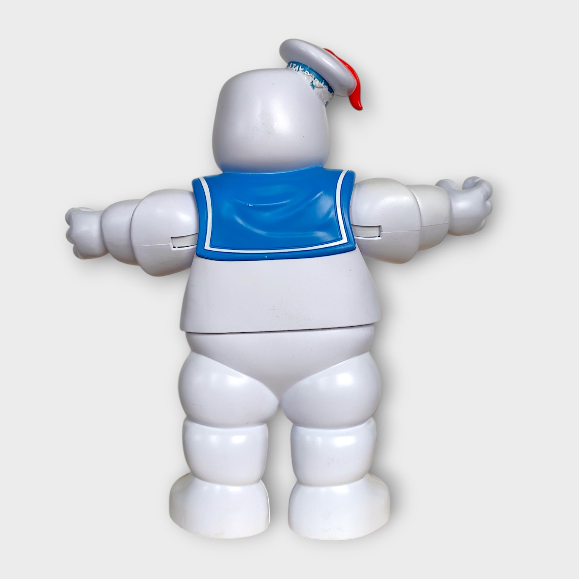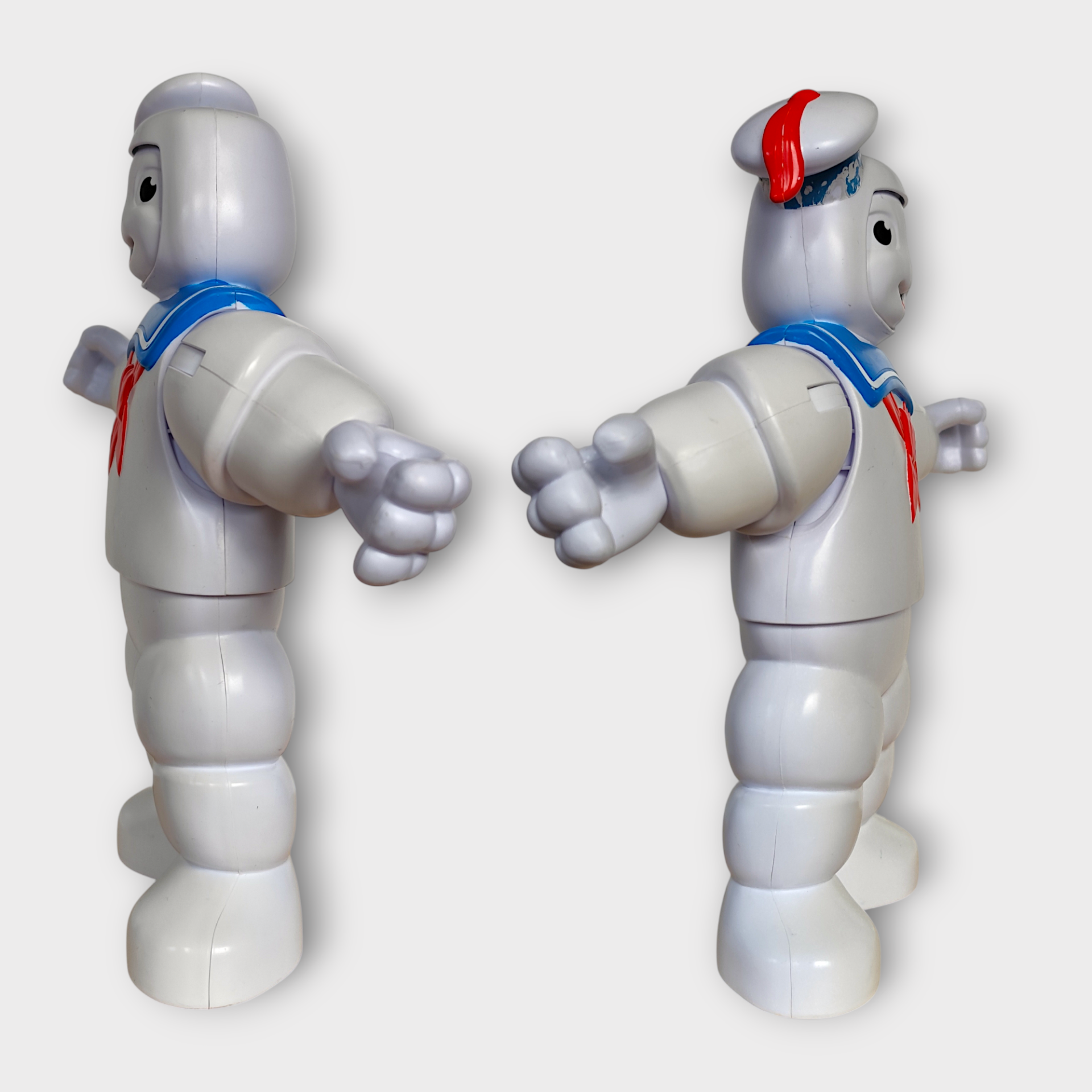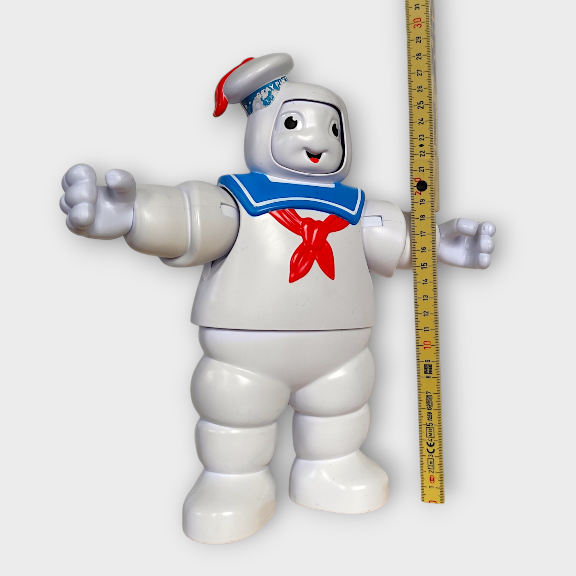 A large nostalgic Stay Puft Marshmallow Man figure from Ghostbusters. The figure is manufactured by Hasbro in 2020. When you press the button on the hat, the figure changes facial expressions. Perfect for collectors of nostalgic toys.
